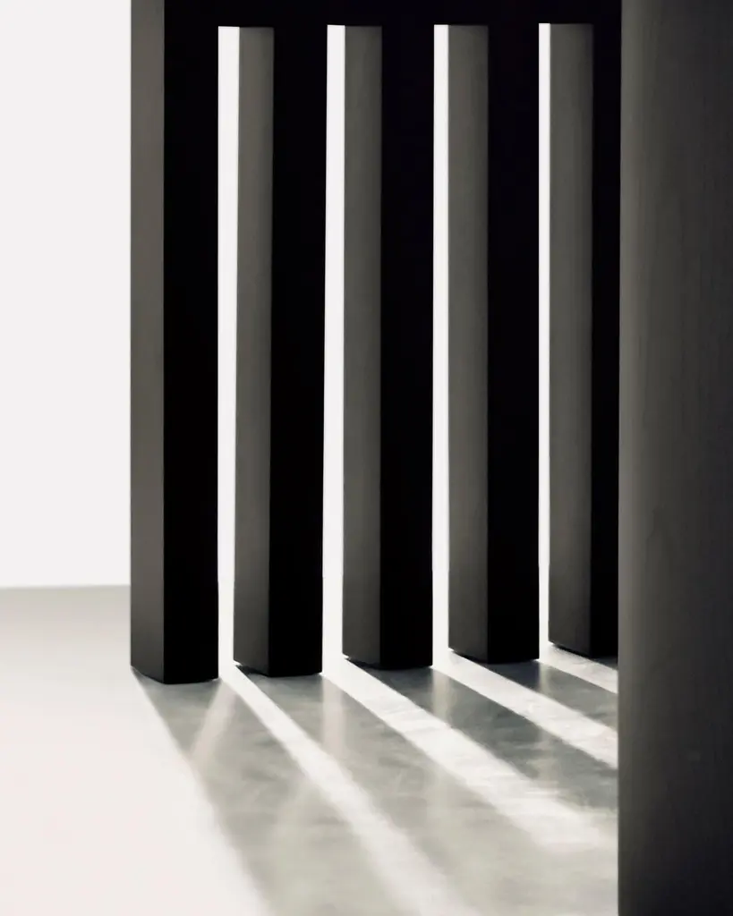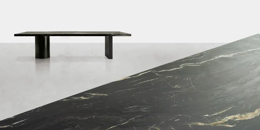 The table, in rectangular and round versions, is inspired by the spectacular landscape of the U.S.Ozarks mountain range region: forests of towering trees with regular, straight trunks tend upward in contrastto the horizontal placidity of the lake. The table seems to emulate these two opposite movements.Curved and straight plywood base with Black Ash veneer in matt finish. Top in Belvedere brushed naturalmarble with workmanship for the 6cm height. Multilayer under top.More wooden veneers, lacquered finishes and Pure Metal finishes are available as per sample book.Belvedere granite originally from Africa, in the natural brushed finish, has a strong material impact... It is wonderfully pleasant to the touch.