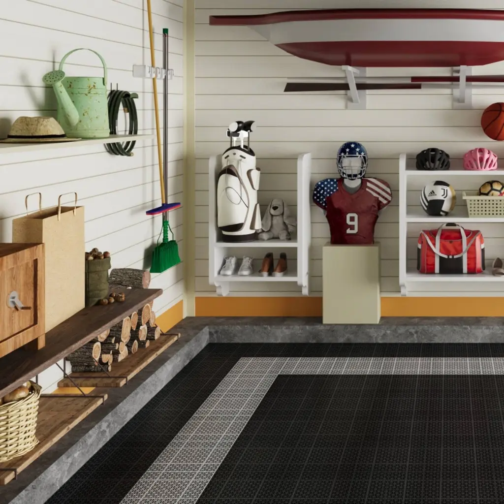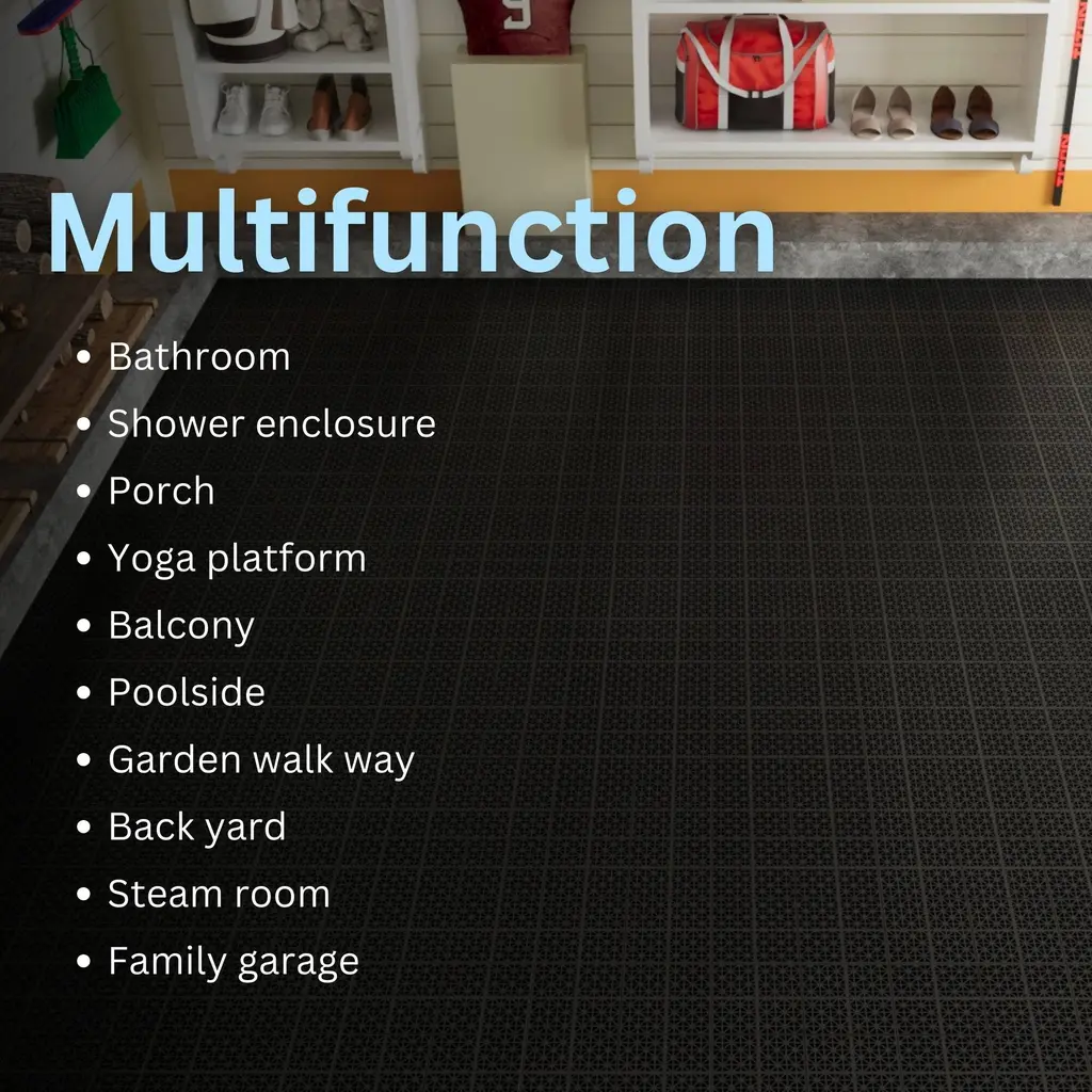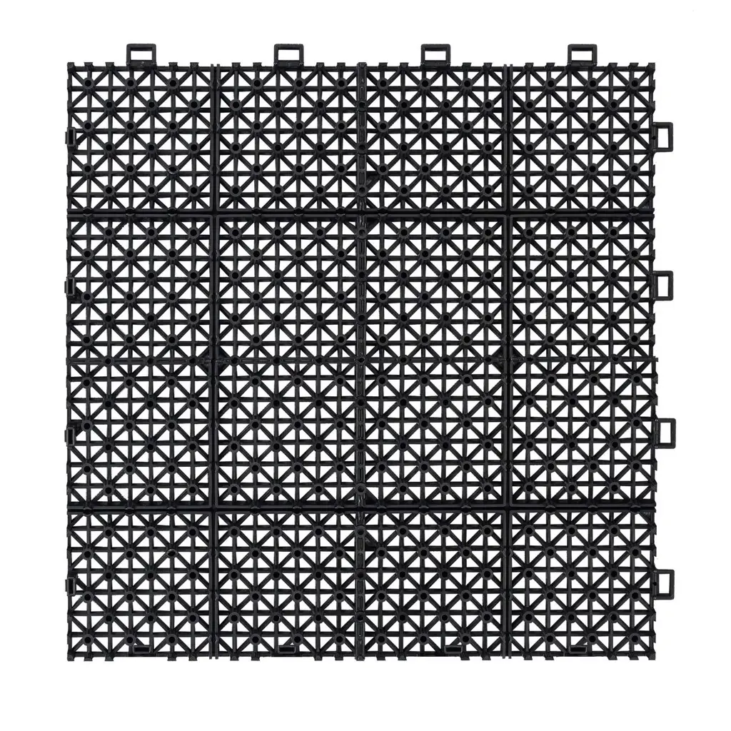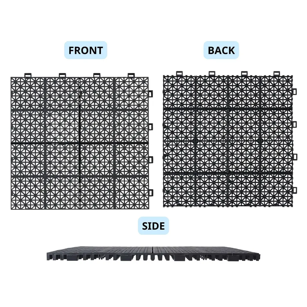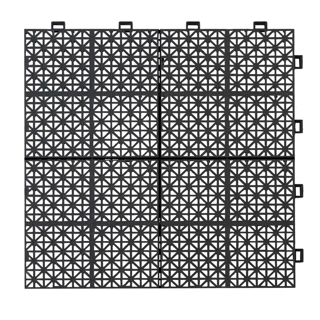 Upgrade your outdoor or indoor space with these 12" x 12" black interlocking deck tiles. Made from high-strength PP plastic, they offer superior durability, anti-slip performance, and excellent weather resistance. Designed with a stylish rosette pattern and an efficient drainage system, these tiles are ideal for balconies, porches, bathrooms, and patios. With tool-free assembly and a load capacity up to 6613 lbs, they provide a sturdy, low-maintenance flooring solution that is both practical and versatile for year-round use.FeaturesSpecifications