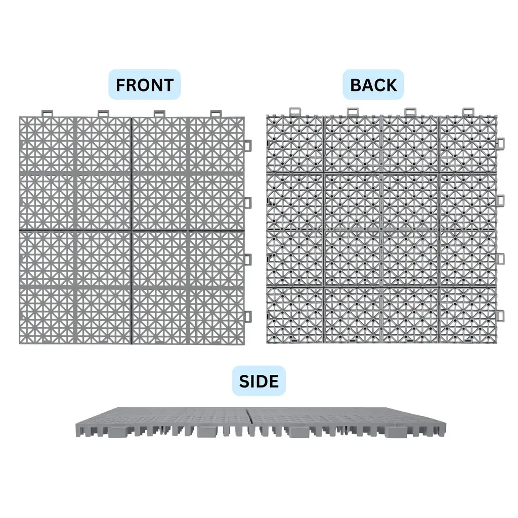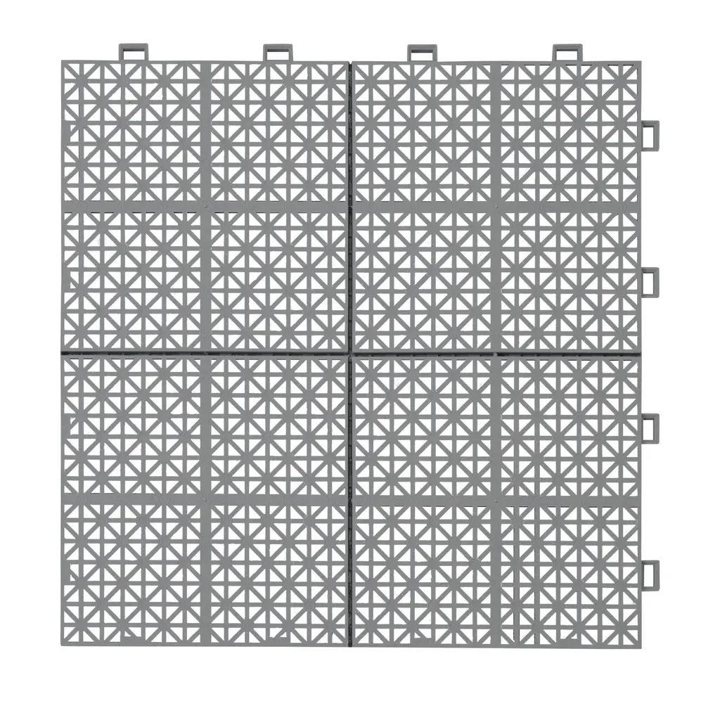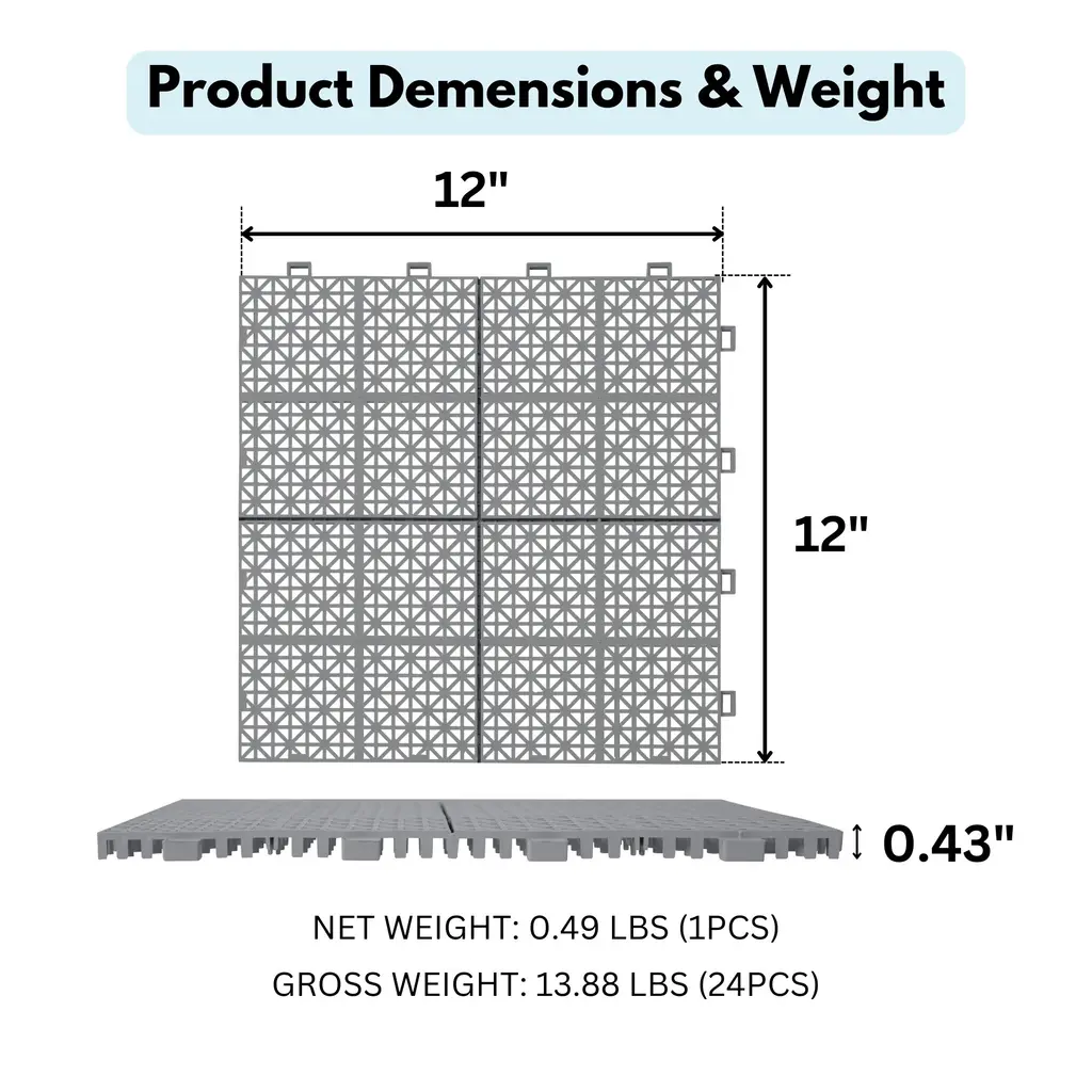 Upgrade your outdoor or indoor space with these 12" x 12" gray interlocking deck tiles. Made from high-strength PP plastic, they offer superior durability, anti-slip performance, and excellent weather resistance. Designed with a stylish rosette pattern and an efficient drainage system, these tiles are ideal for balconies, porches, bathrooms, and patios. With tool-free assembly and a load capacity up to 6613 lbs, they provide a sturdy, low-maintenance flooring solution that is both practical and versatile for year-round use.FeaturesSpecifications