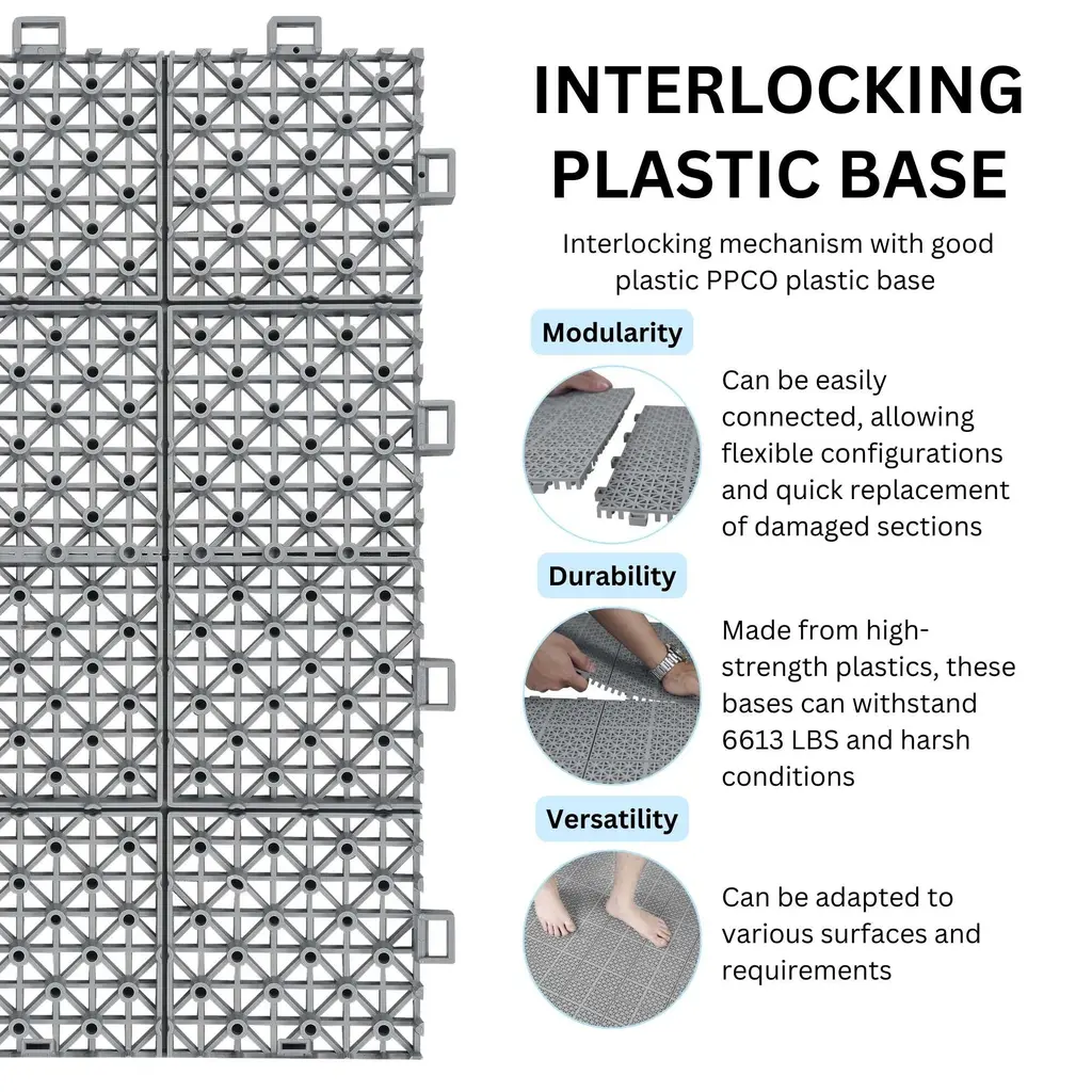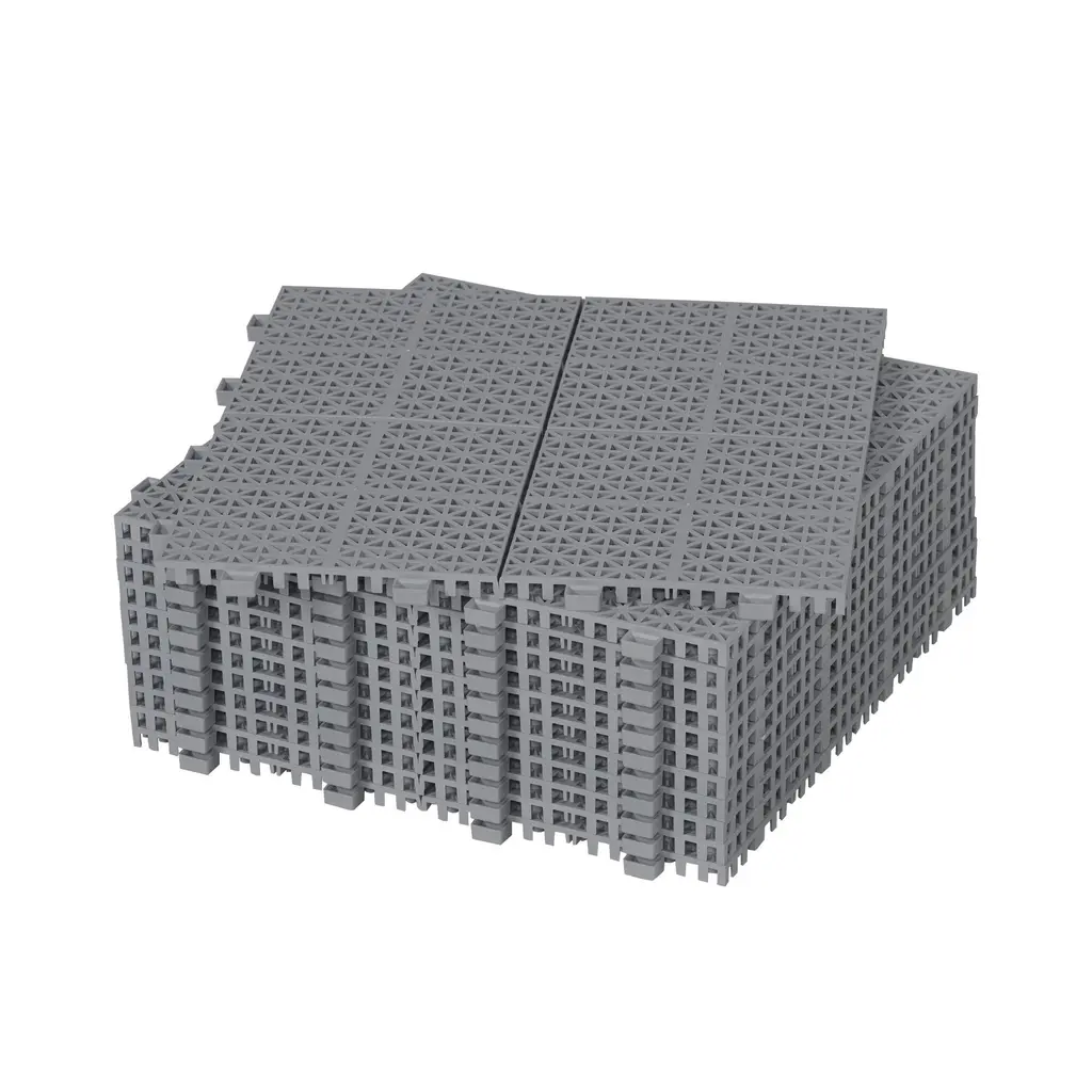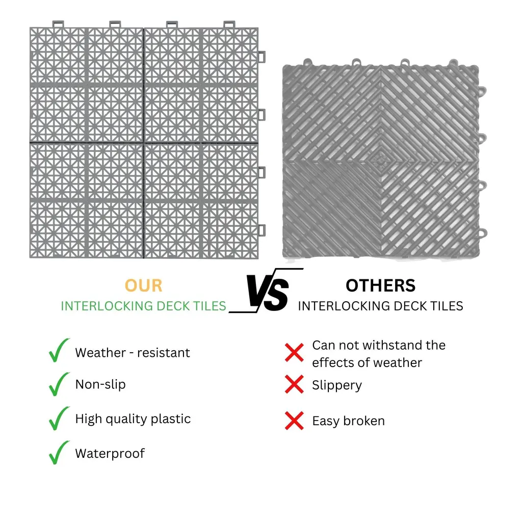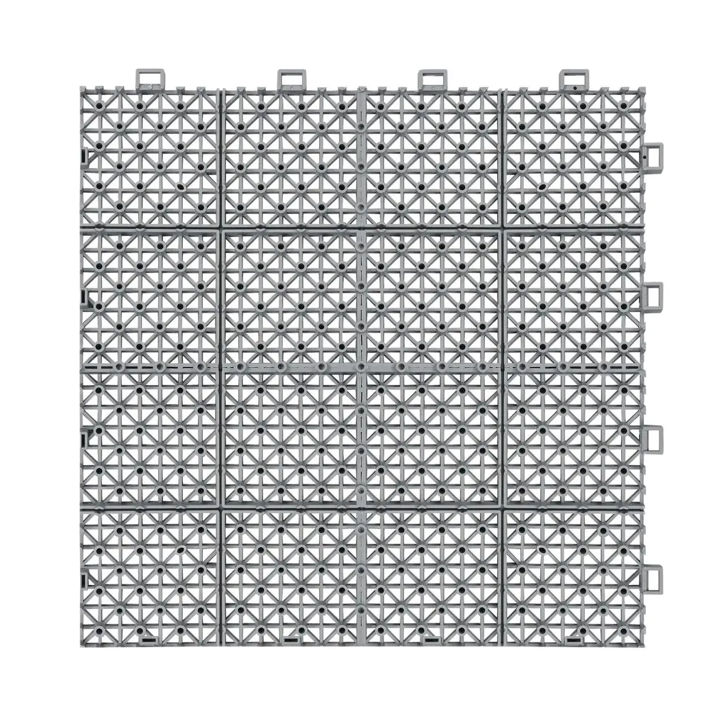 Upgrade your outdoor or indoor space with these 12" x 12" gray interlocking deck tiles. Made from high-strength PP plastic, they offer superior durability, anti-slip performance, and excellent weather resistance. Designed with a stylish rosette pattern and an efficient drainage system, these tiles are ideal for balconies, porches, bathrooms, and patios. With tool-free assembly and a load capacity up to 6613 lbs, they provide a sturdy, low-maintenance flooring solution that is both practical and versatile for year-round use.FeaturesSpecifications