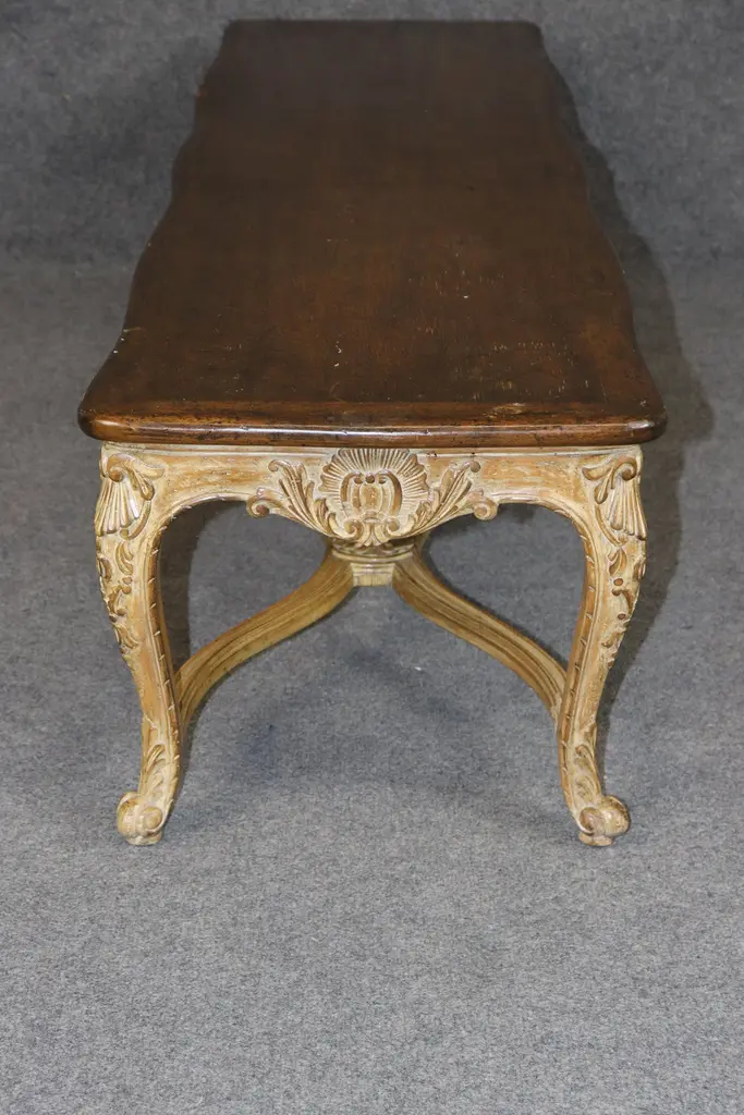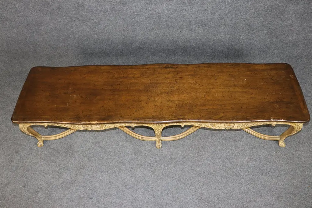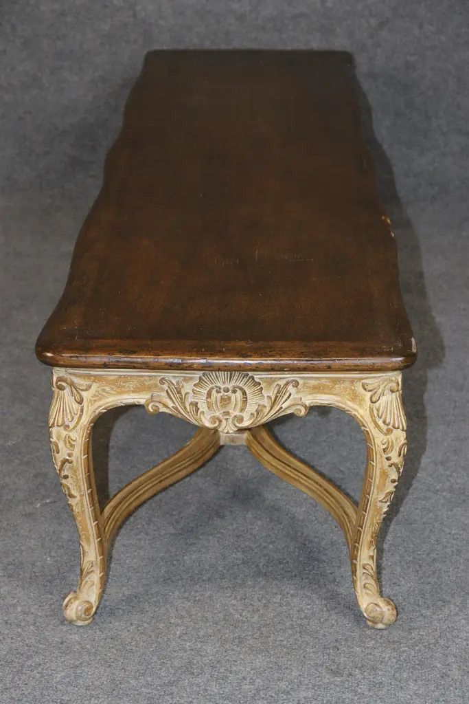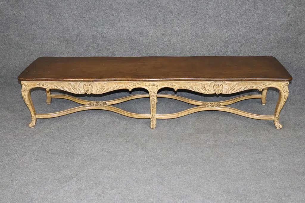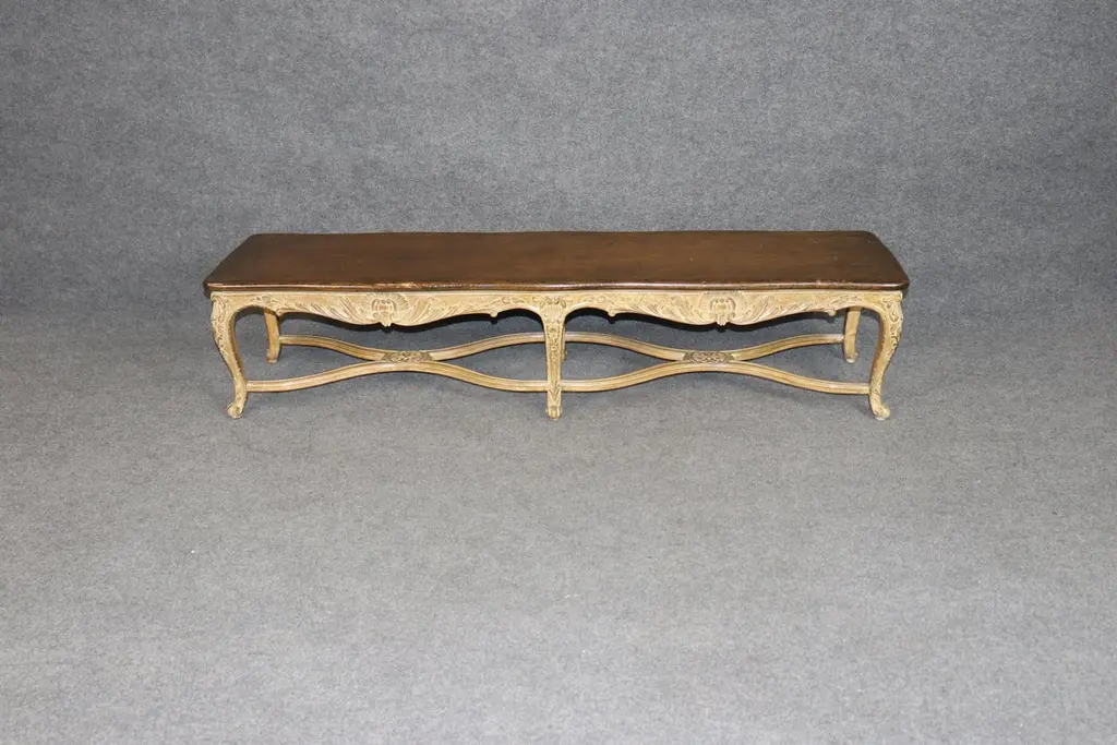 This Paint Decorated French Louis XV Style Window Bench or Coffee Table is a versatile and elegant piece that reflects the timeless charm of French decorative arts. Crafted with a beautifully carved frame, the bench features delicate floral and scroll motifs highlighted with a soft paint-decorated finish, enhancing the intricate detailing. The long rectangular form rests on cabriole legs joined by an elegant serpentine stretcher, showcasing both strength and refinement. The warm-toned top offers contrast to the lighter base, providing a harmonious balance of color and texture.Designed in the Louis XV style, this piece exudes sophistication and versatility. It can function as a window bench, offering refined seating in an entryway or under a large window, or as a low coffee table, perfect for anchoring a living room with old-world elegance. Its decorative frame and graceful proportions allow it to blend seamlessly into antique-inspired interiors, add a touch of gilded glamour in Hollywood Regency settings, or serve as a unique focal point in mid-century modern spaces.Perfect for collectors, designers, or homeowners looking for a multifunctional and stylish addition, this Louis XV style bench or coffee table elevates any space with timeless French sophistication.Dimensions: 14.75 inches high x 67.5 inches wide x 17.5 inches deep