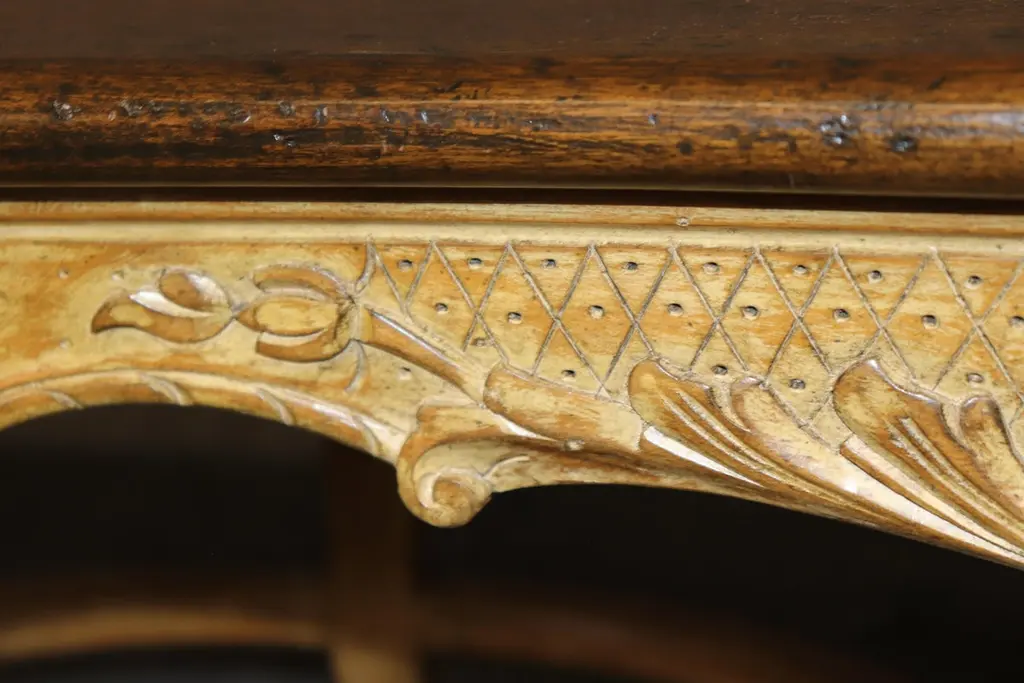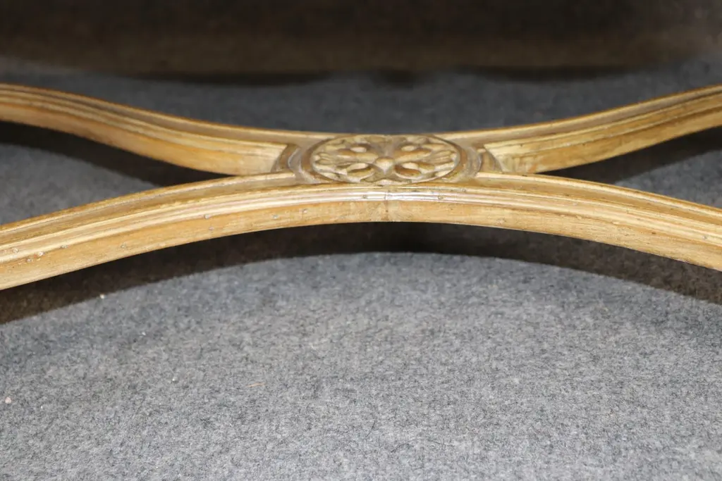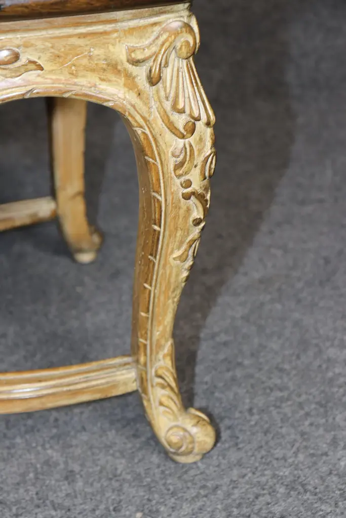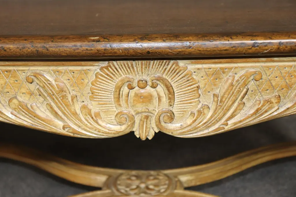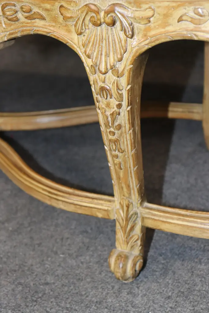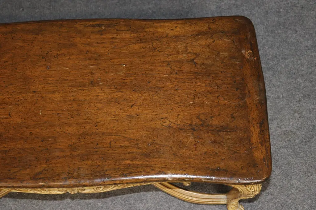 This Paint Decorated French Louis XV Style Window Bench or Coffee Table is a versatile and elegant piece that reflects the timeless charm of French decorative arts. Crafted with a beautifully carved frame, the bench features delicate floral and scroll motifs highlighted with a soft paint-decorated finish, enhancing the intricate detailing. The long rectangular form rests on cabriole legs joined by an elegant serpentine stretcher, showcasing both strength and refinement. The warm-toned top offers contrast to the lighter base, providing a harmonious balance of color and texture.Designed in the Louis XV style, this piece exudes sophistication and versatility. It can function as a window bench, offering refined seating in an entryway or under a large window, or as a low coffee table, perfect for anchoring a living room with old-world elegance. Its decorative frame and graceful proportions allow it to blend seamlessly into antique-inspired interiors, add a touch of gilded glamour in Hollywood Regency settings, or serve as a unique focal point in mid-century modern spaces.Perfect for collectors, designers, or homeowners looking for a multifunctional and stylish addition, this Louis XV style bench or coffee table elevates any space with timeless French sophistication.Dimensions: 14.75 inches high x 67.5 inches wide x 17.5 inches deep