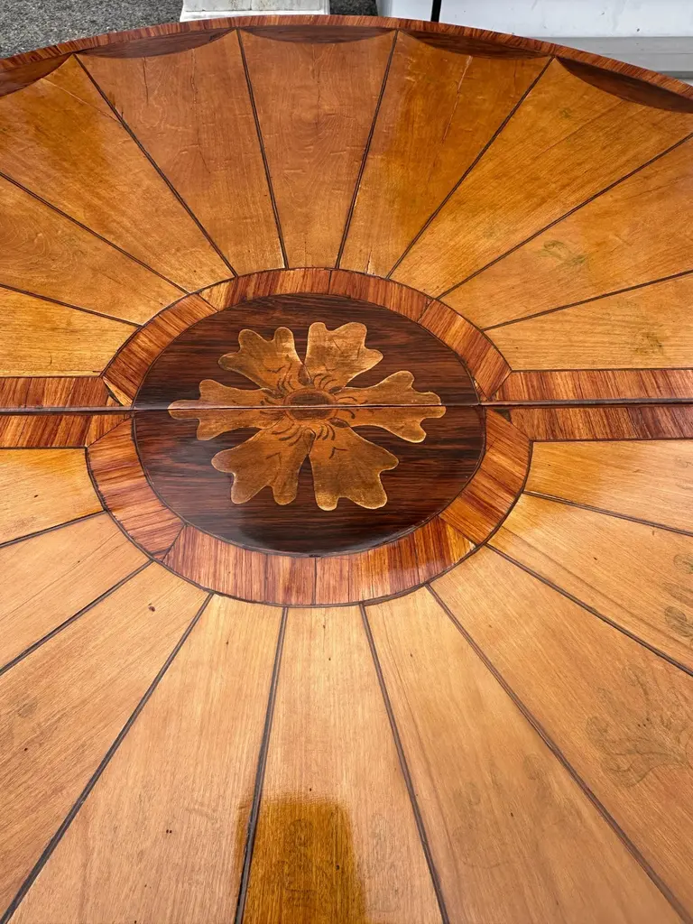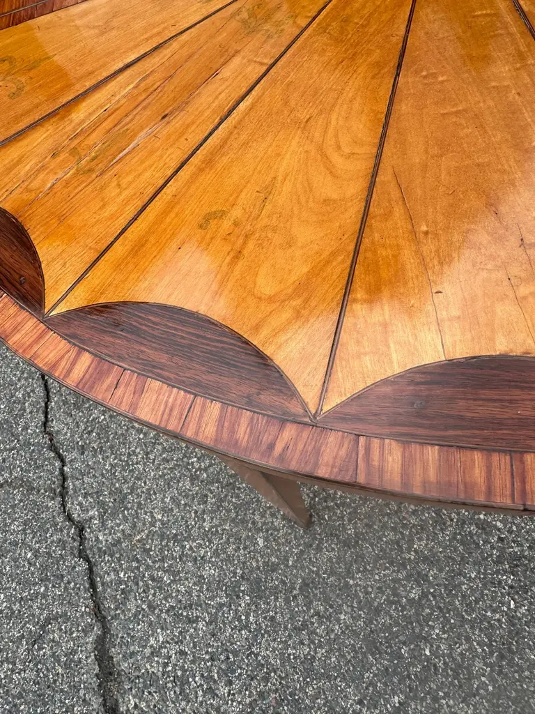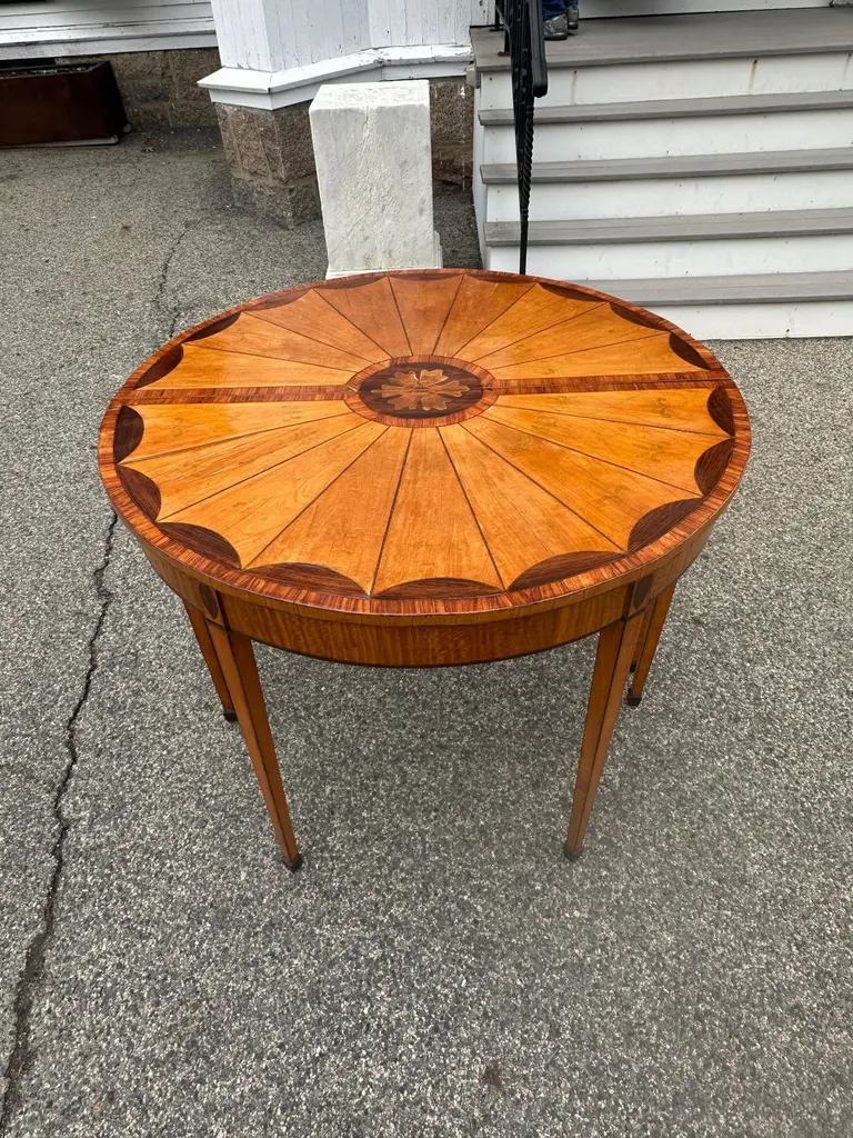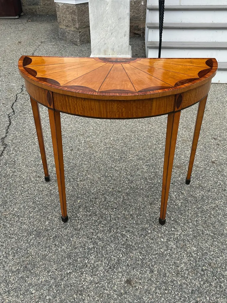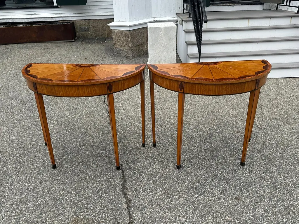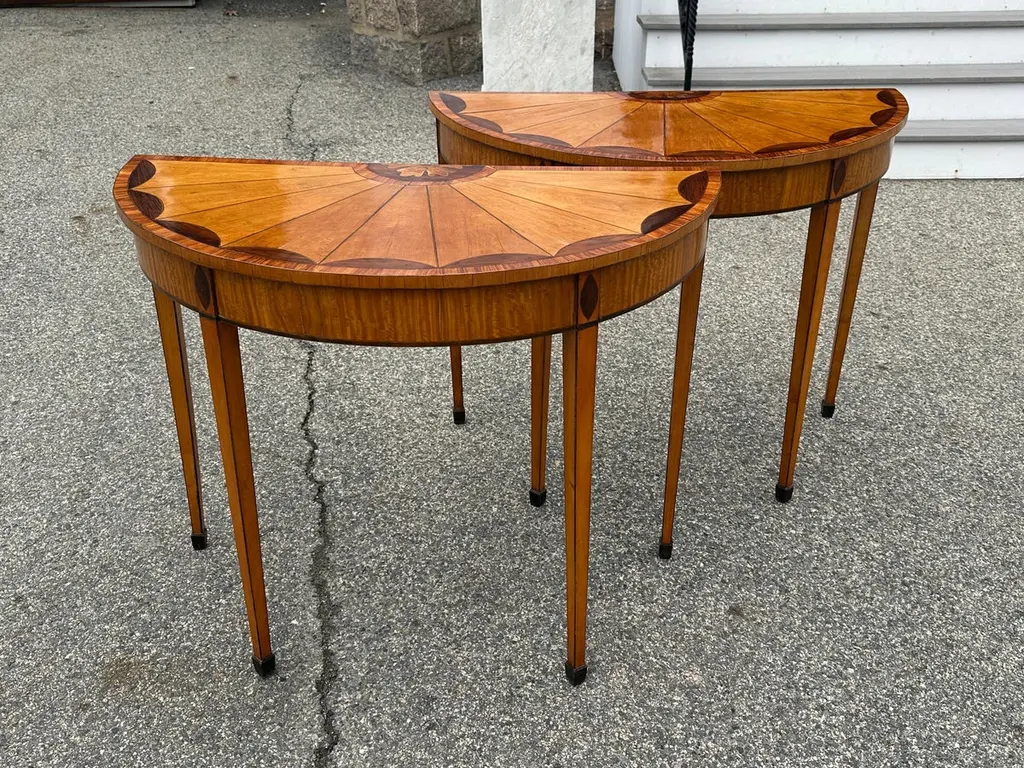 Fine Pair of 19th Century George III Style or Adam Demi-lune Tables. Beautifully veneered in satinwood. Neoclassical fan motif. Provenance: Kennebunkport Family of Note