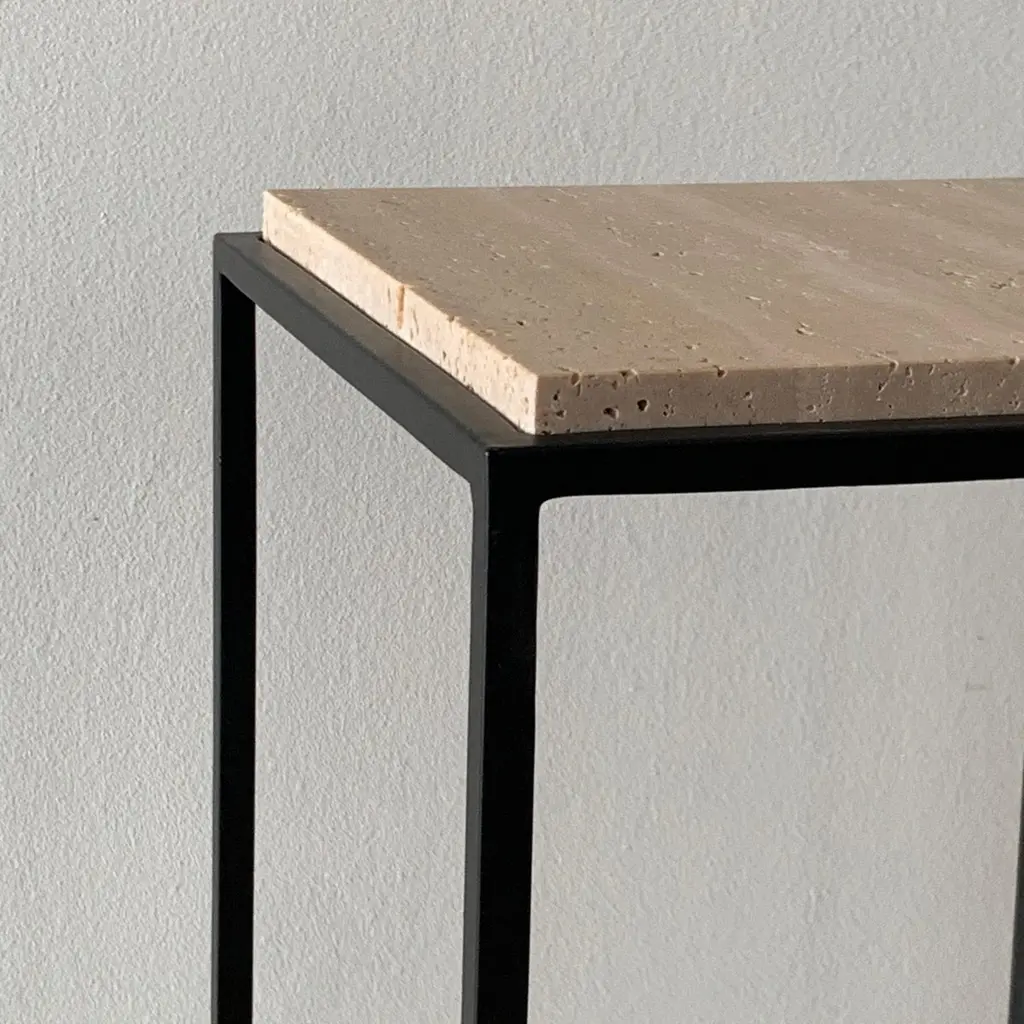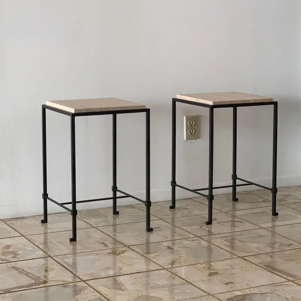 Pair of chic 'Diagramme' travertine drinks tables by Design Frères.Slender powder-coated frames fitted with unfilled Italian travertine top inserts.Inspired by the timeless aesthetic of French modern design, these tables from our exclusive Design Frères line are handmade in our Los Angeles atelier by our skilled artisans. These classic pieces will blend in, structure and enhance any space.