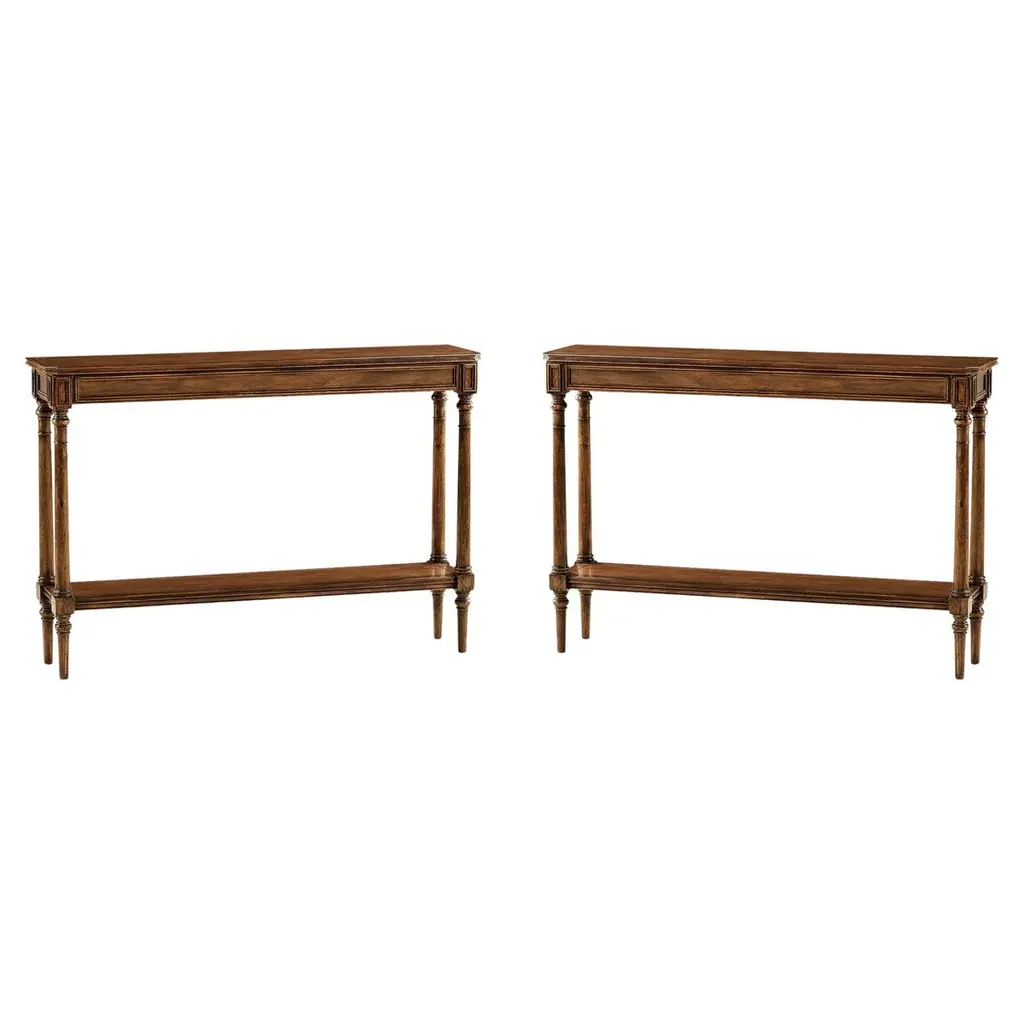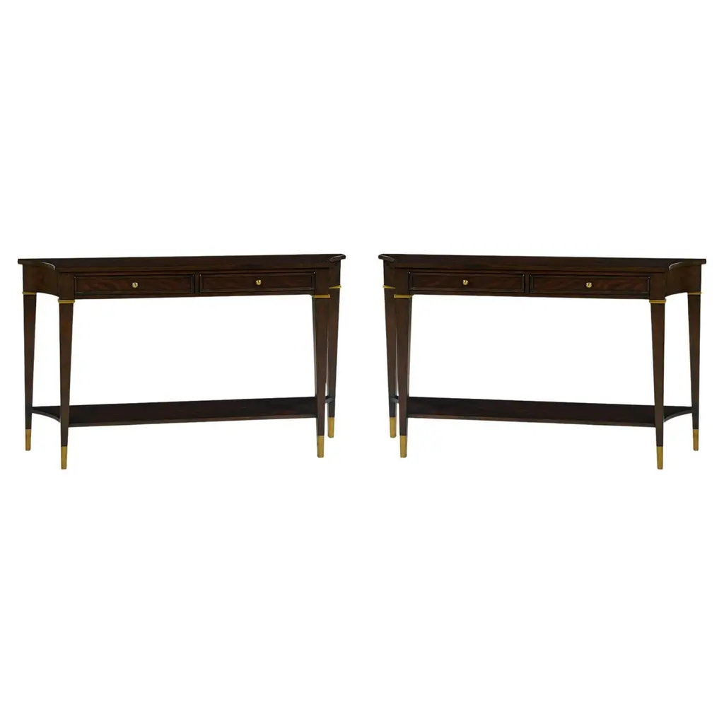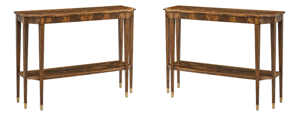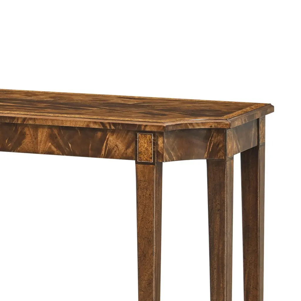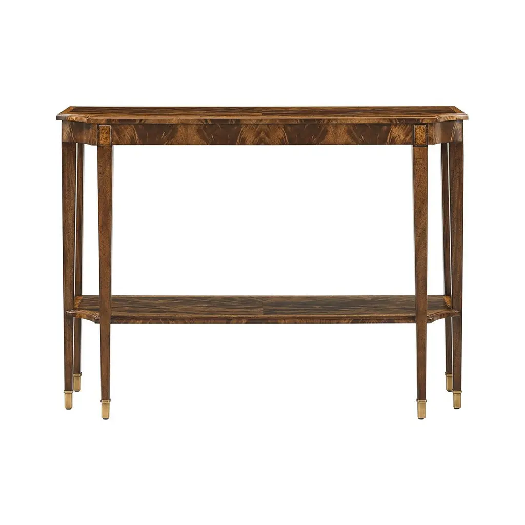 A masterwork of neoclassical elegance, thoughtfully crafted with a refined silhouette and luxurious materiality. Inwardly curved edges bring sculptural shape to the figured crotch veneer top, creating a dynamic surface that captivates from every angle. Line inlays and crossbanding elevate the design with intricate detail, while a medium brown finish warms the entire composition.Six slender, tapered legs offer an air of lightness and sophistication, grounded by brass ferrules that enhance the table’s formal profile. A lower shelf provides both functionality and symmetry, making this console an ideal addition to entryways, hallways, or formal living spaces.Dimensions: 48" W x 15" D x 34" H