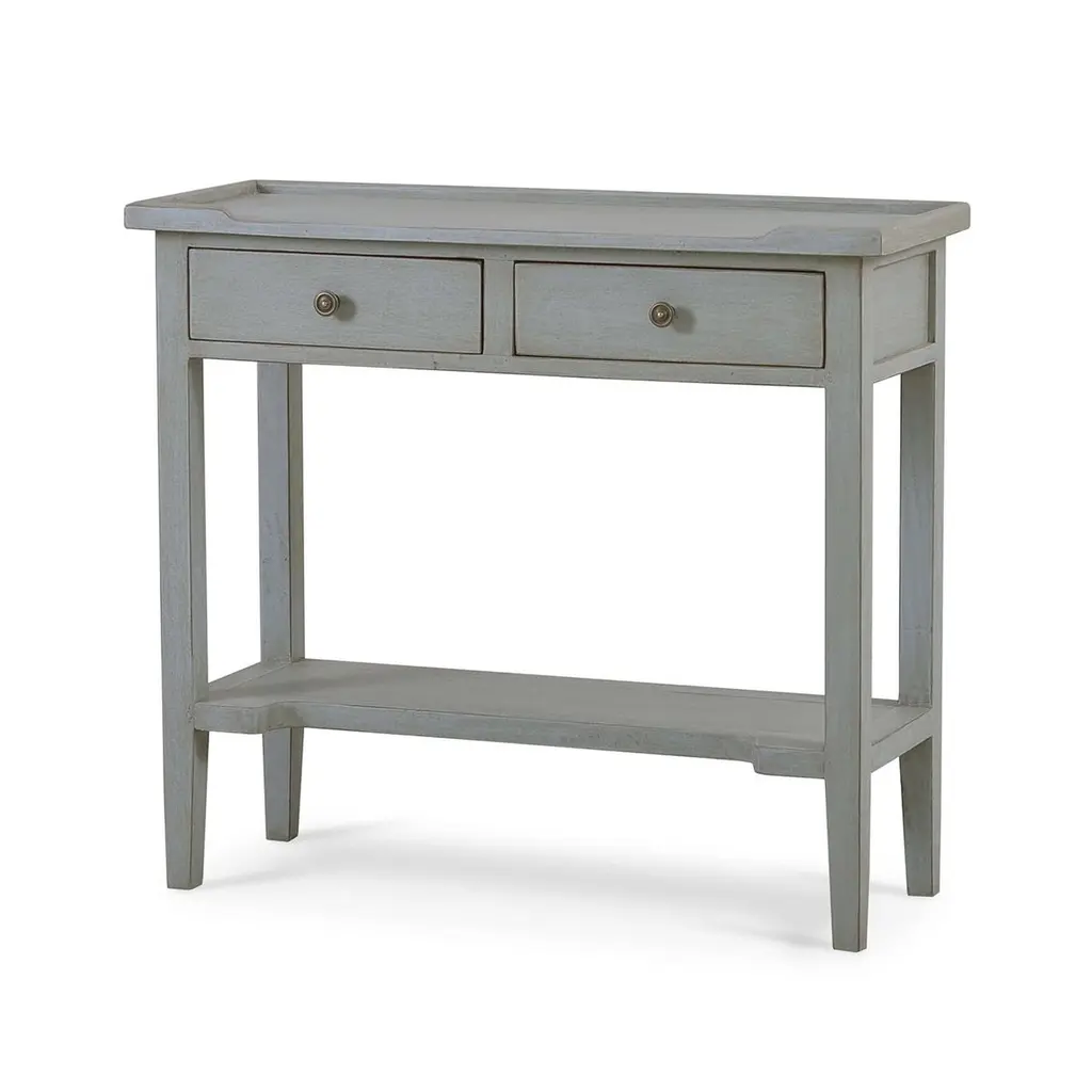 Measuring 33" W x 13" D x 30" H, this classic piece combines timeless design with practical functionality, making it a perfect addition to your home.Crafted with meticulous attention to detail, this console table features a raised edge gallery top, perfect for keeping your items secure. The two convenient drawers provide ample storage for your small essentials, while the lower shelf offers additional space for books, magazines, or decorative items. The gorgeous Charleston Gray finish adds a sophisticated and serene touch that complements any decor style.Dimensions: 33" W x 13" D x 30" HCustom finish options are also available. Contact us to learn more.