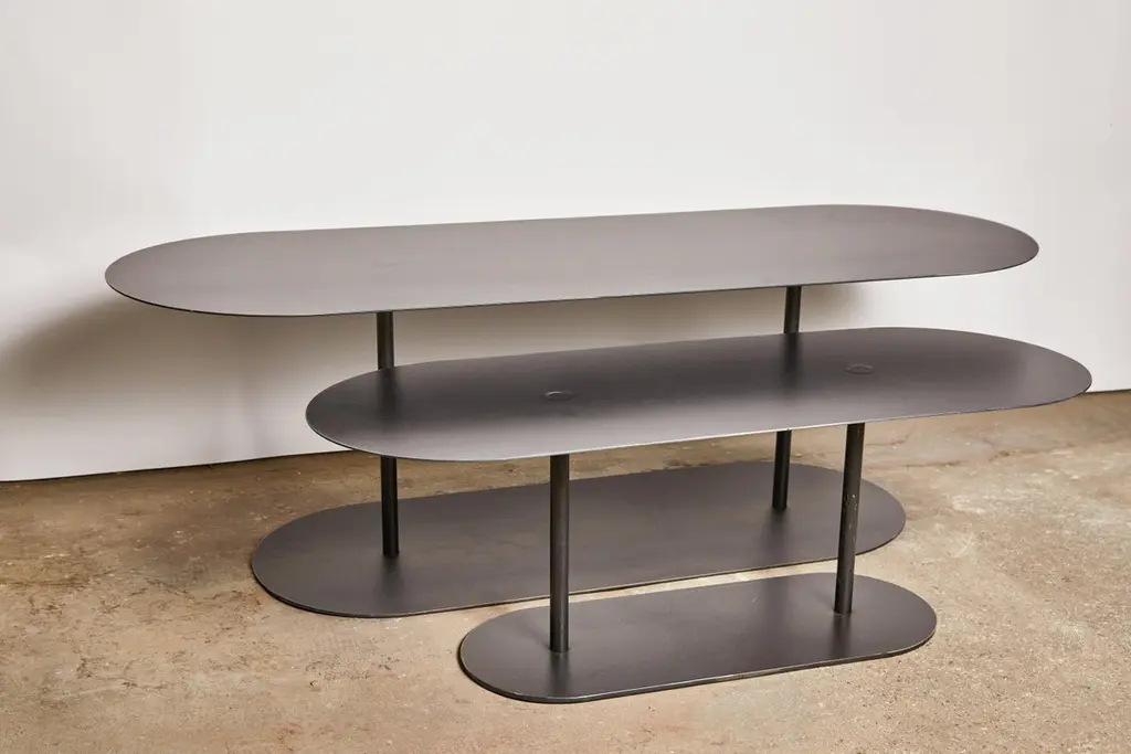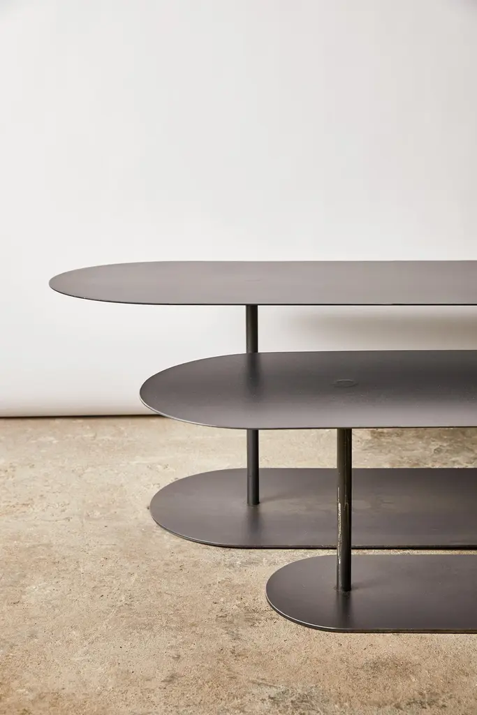 Pair of Ellipses tables signed by Pia ChevalierAlso available in oxidized steel.Dimensions:Large: 120 x 40 cm h. 40 cmSmall: 90 x 30 cm h. 35 cmExists also in smaller version:Large: 60 x 27 cm H. 45 cmSmall: 40 x 18 cm H. 40 cmPia Chevalier is a French contemporary designer.Independent Designer, trained in Design and Crafts and more specifically on the sets and surface treatments, at Boulle School, Pia Chevalier today has her own workshop in the goldsmith's shop, the former premises of Christofle.The designer gives way to total spontaneity in its creative process and the composition of her pieces. Her love for raw materials incites her to constantly transform them for the purpose of unique sculptural pieces creation. Focused on the object of daily life, it gives it a status of sculpture capable of arousing emotion and create an emotional bond.Her obsession is to give solemnity to these objects, to make them endearingHer works were sold to prestigious collections and institutions.