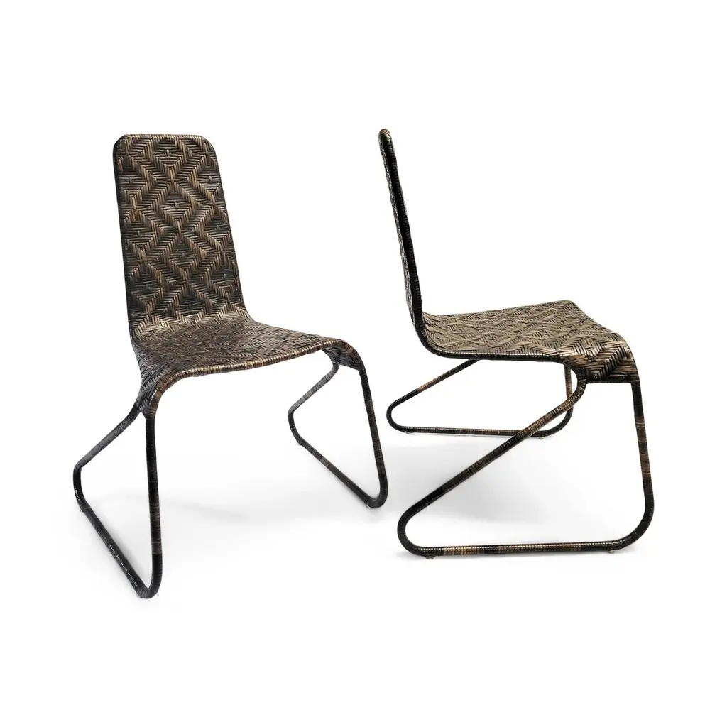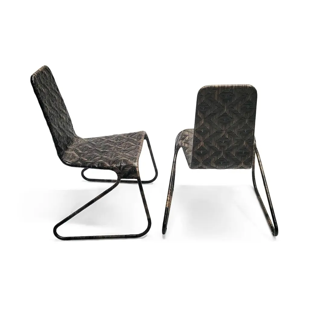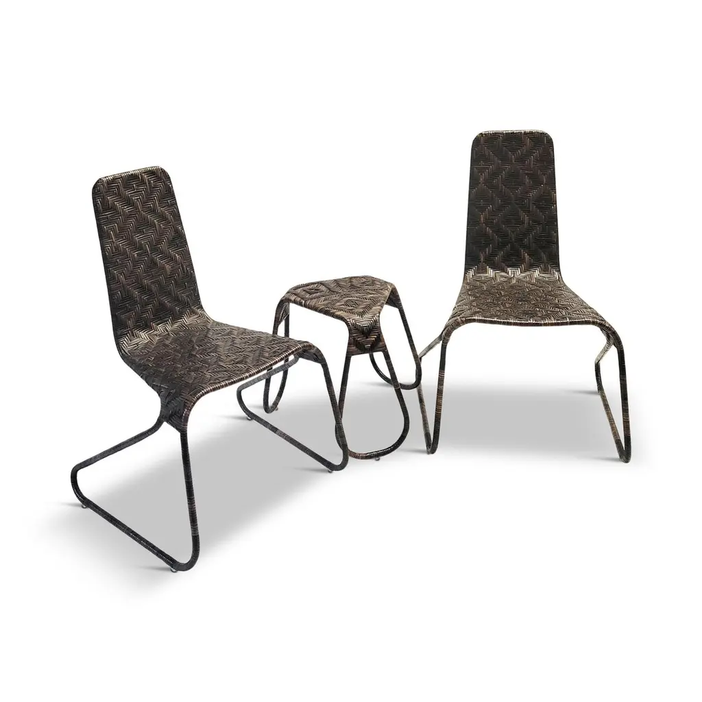 Spanish-born, Milan-based architect and designer Patricia Urquiola’s design for the Flo line for Driade relies on steel structures covered in cane, giving the pieces a durability and stability matched by a bright and lively decorative quality. The sensual shape of the chairs and table, minimalist and functional at the same time, provides for an overall stunning visual effect. This set includes two Flo chairs and one side table.Urquiola has designed products and hotels for B&B Italia, Cassina, Moroso Alessi, Baccarat, Salvatore Ferragamo, Kvadrat, Mandarin Oriental, Panerai, Rosenthal, W Hotels, and Louis Vuitton, and her architecture projects can be found all over the world. Her work can also be found in the design collection of New York’s Museum of Modern Art, among many other museums.In very good condition.Chairs are 23.5” x 21.75” x 33.75”, 17” seat heightTable is 13" x 13" x 16"