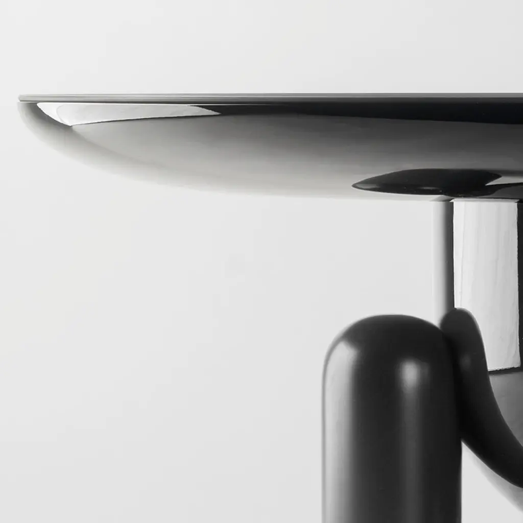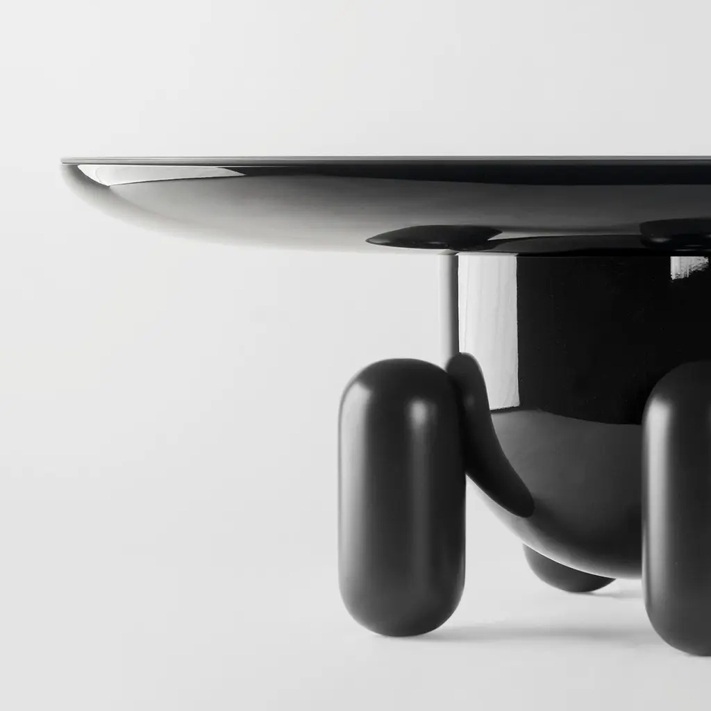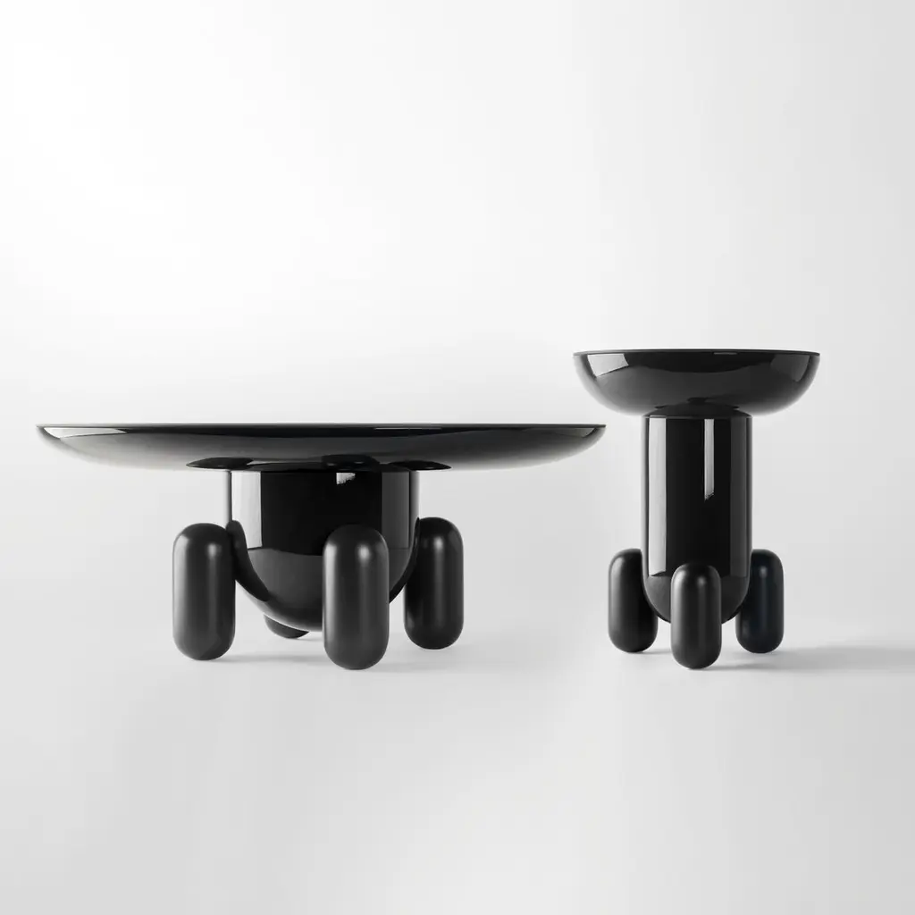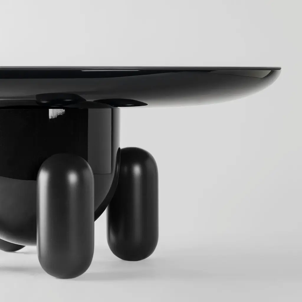 Dark grey explorer #03 tableDesign by Jaime Hayon, 2019Manufactured by BD Barcelona.Laquered fibreglass body. Solid turned wooden legs and lacquered. Painted glass table top.Measures: 100 Ø x 42 cm40 Ø x 50 cm- Glass RAL 7021- Body RAL 7021 gloss - Legs RAL 7021 mate.