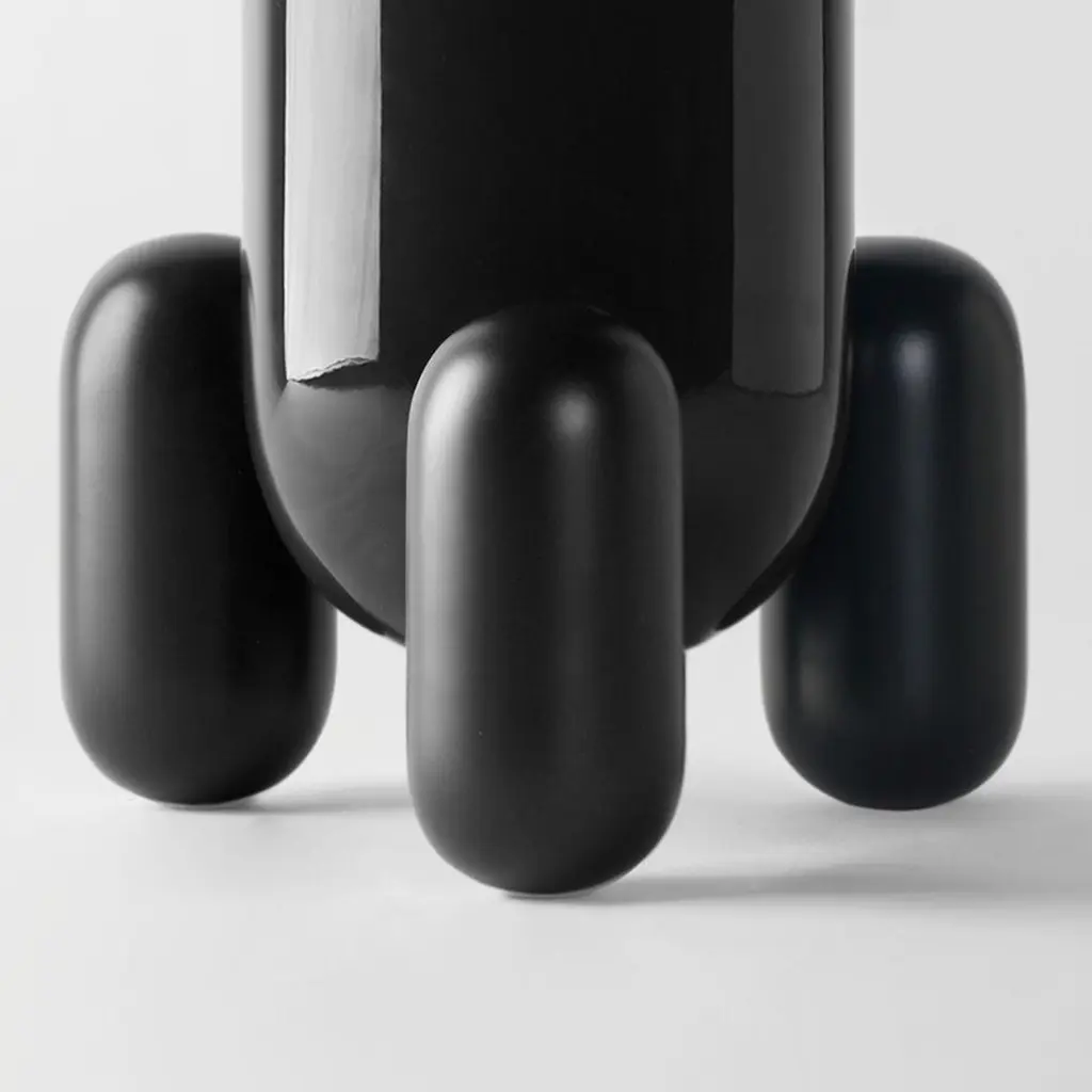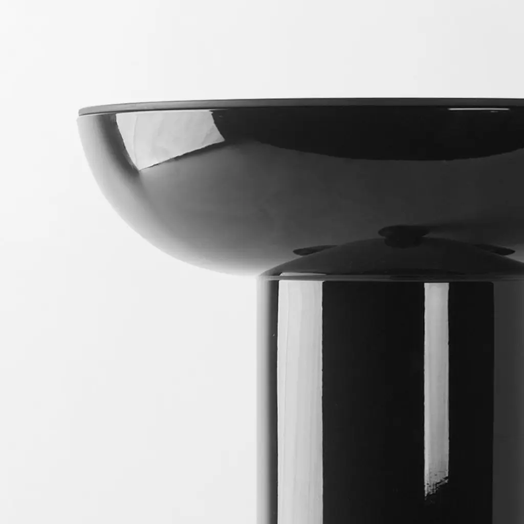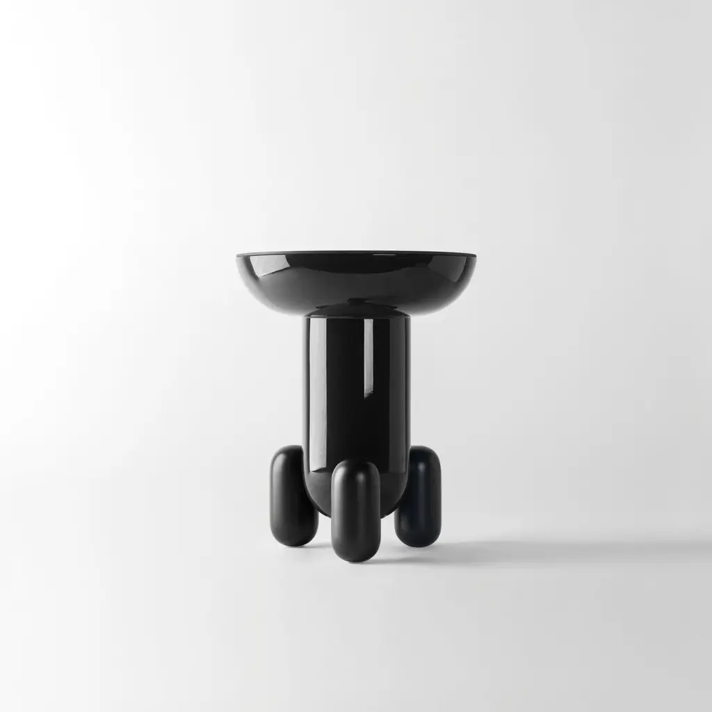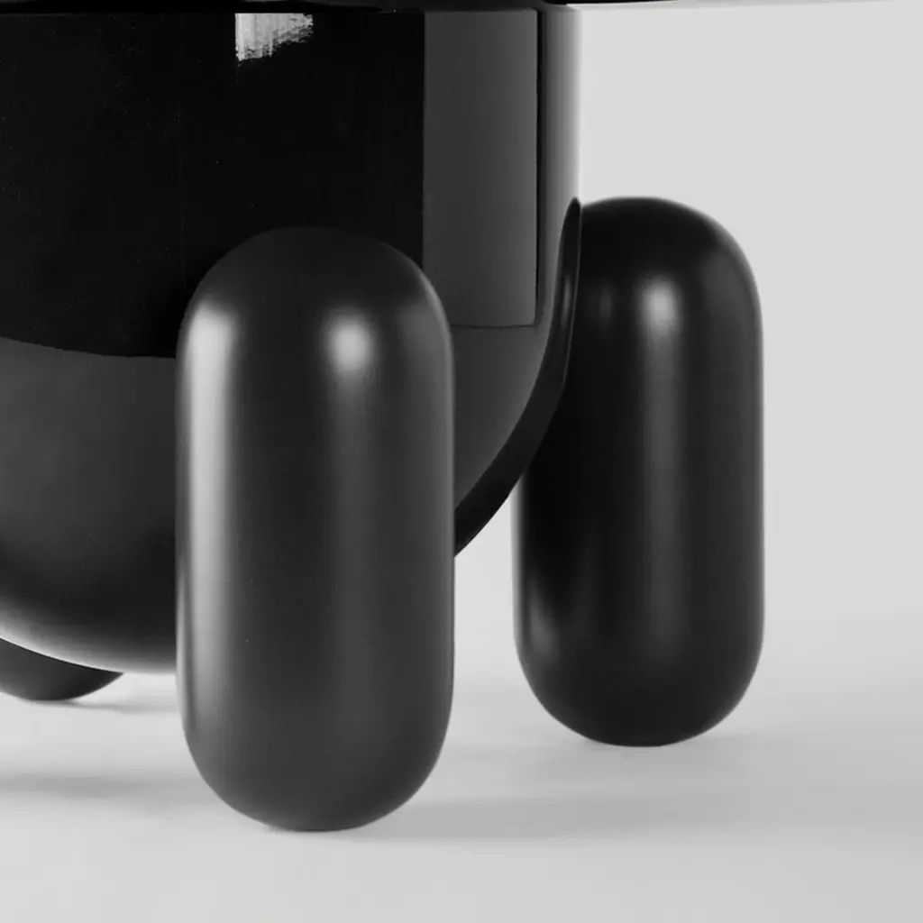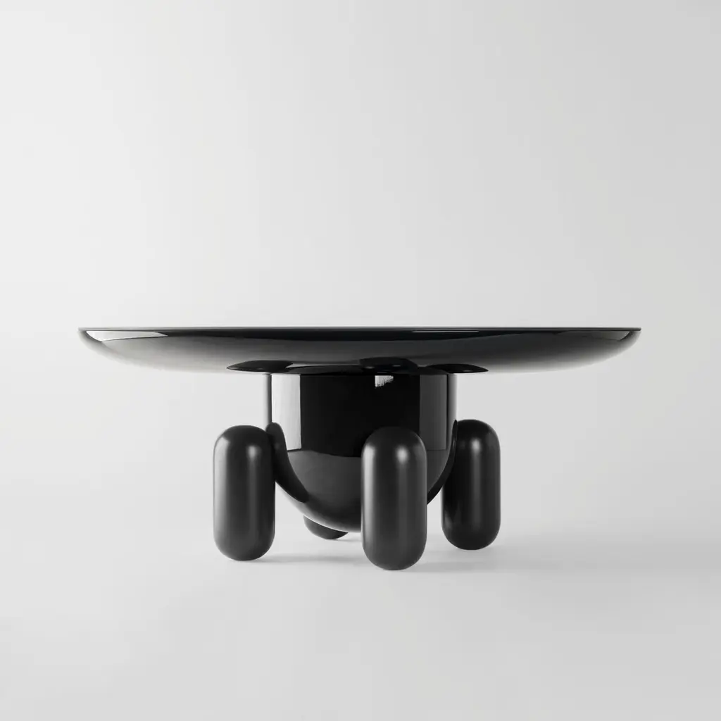 Dark grey explorer #03 tableDesign by Jaime Hayon, 2019Manufactured by BD Barcelona.Laquered fibreglass body. Solid turned wooden legs and lacquered. Painted glass table top.Measures: 100 Ø x 42 cm40 Ø x 50 cm- Glass RAL 7021- Body RAL 7021 gloss - Legs RAL 7021 mate.