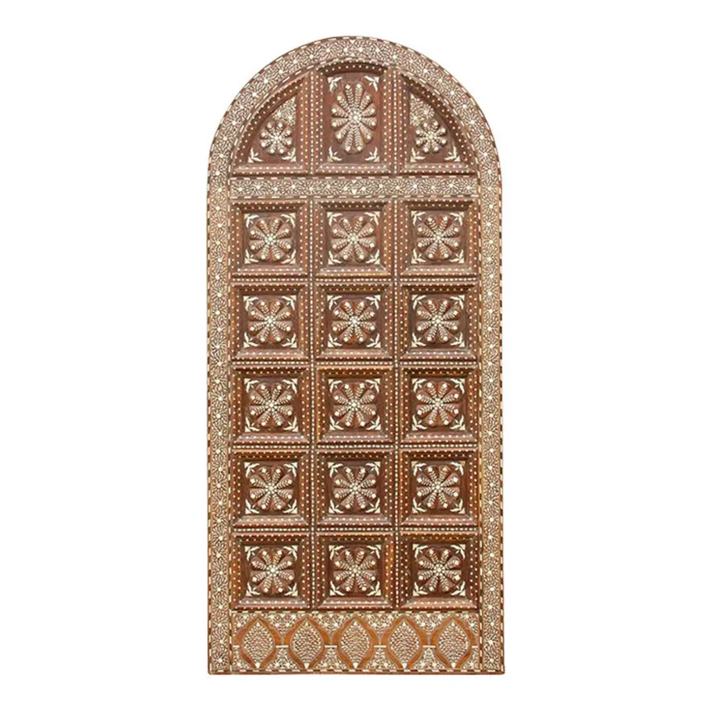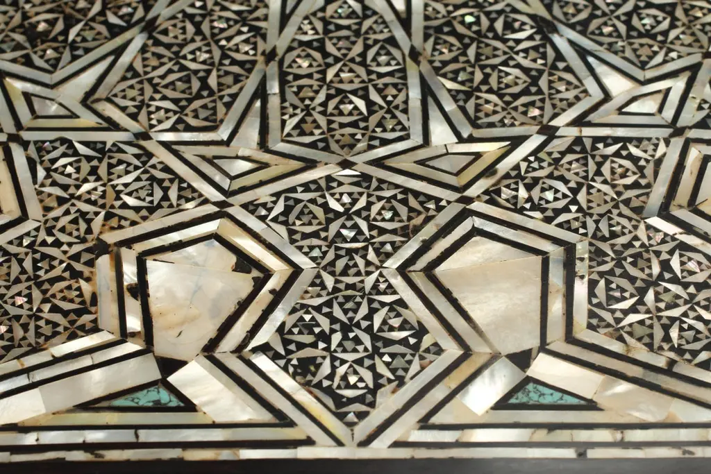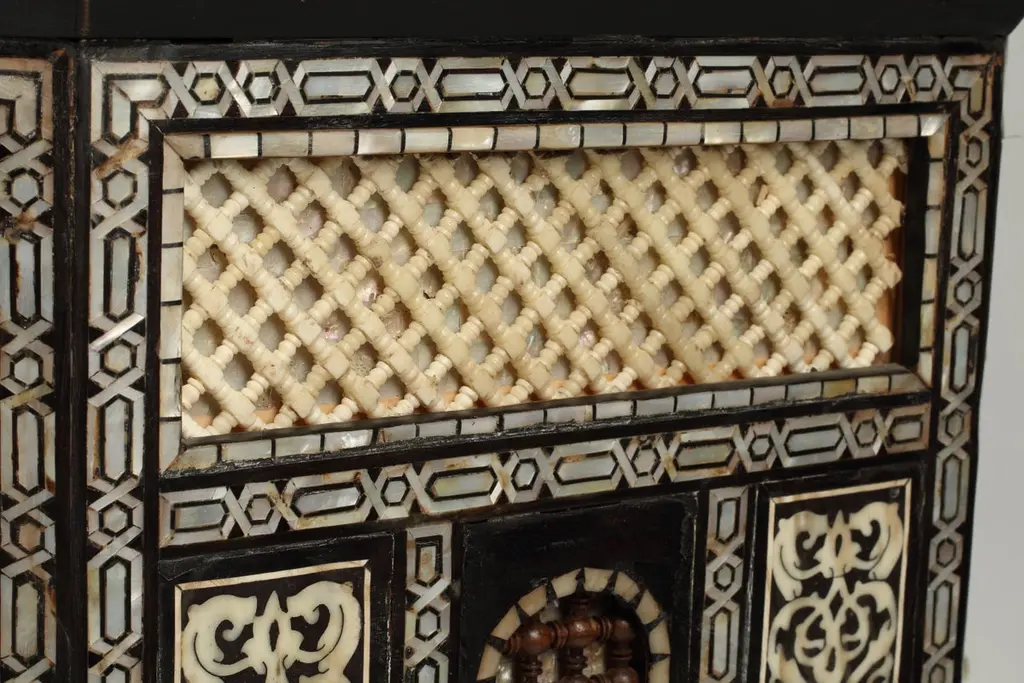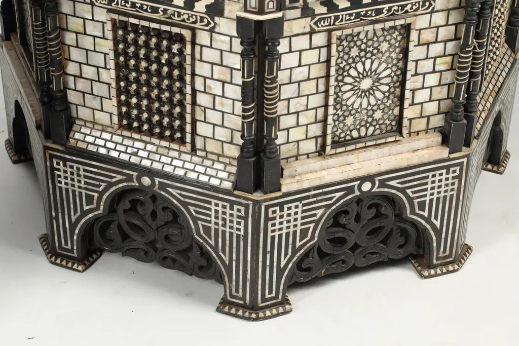 An Impressive Pair of Levantine Shell And Bone Inlaid Octagonal Tables. Rarely at this height and scale, the moorish inlaid tables are an excellent example of fine inlay work. Geometric patterns and moorish arches and architectural lines decorate the sides of this table. Delicately carved bone lattice pattern. This pair are an elevated focal point in any grand room, or can be accents on each side of a monumental entrance.
