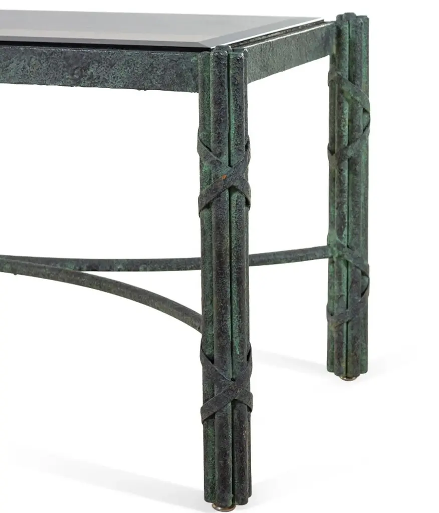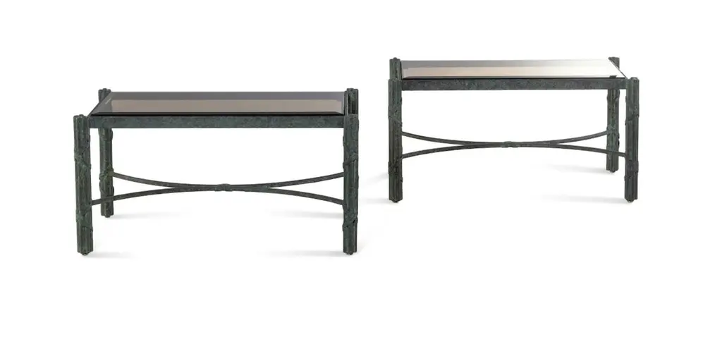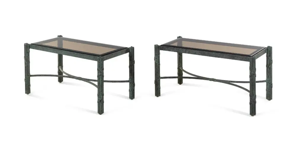 A pair of modern patinated bronze smoky glass-top low tables/benchesThese are currently low tables but could easily have a cusion made making them a pair of benches. Priced per table/bench.20th centuryMeasures: Height 18 x width 35 3/4 x depth 18 inches.Property from a Robert Metzger-designed interior.Would look great in a den or living room