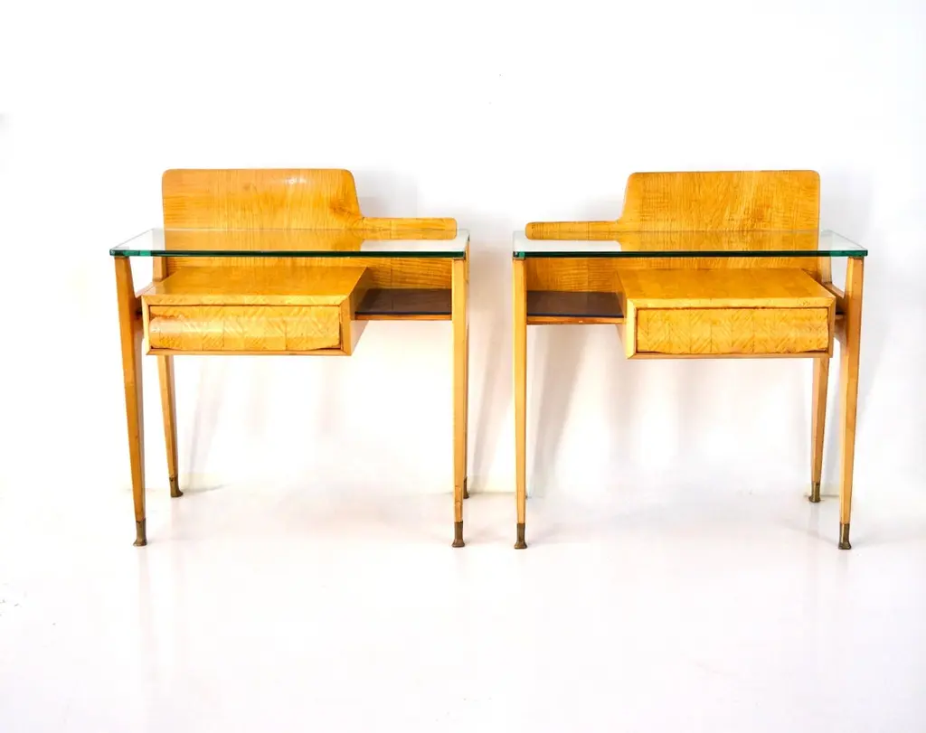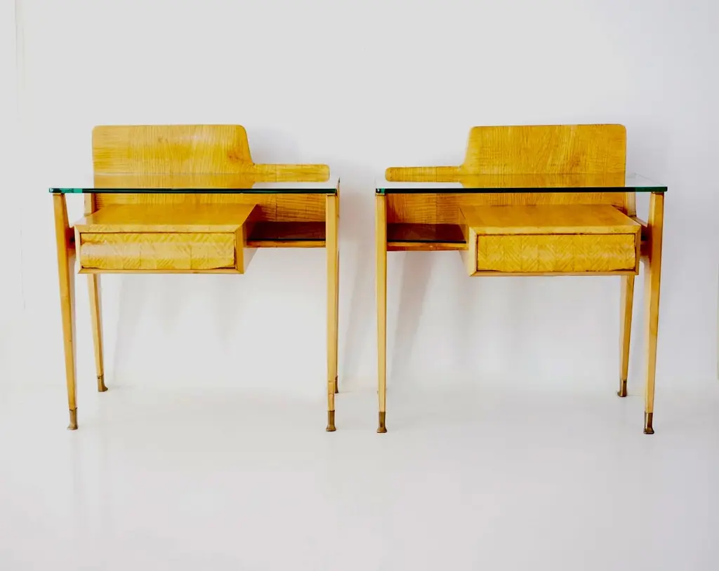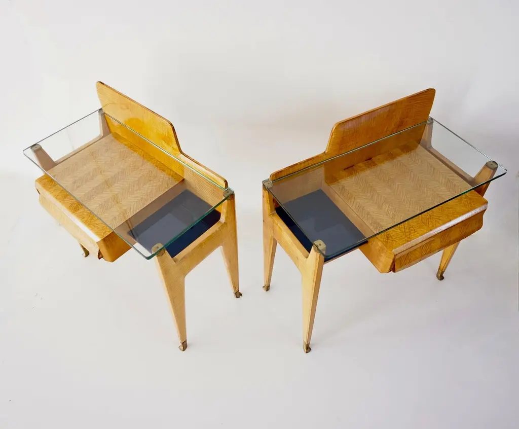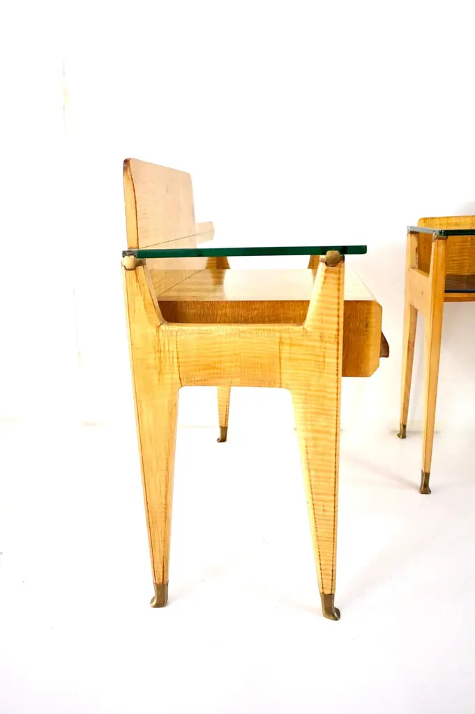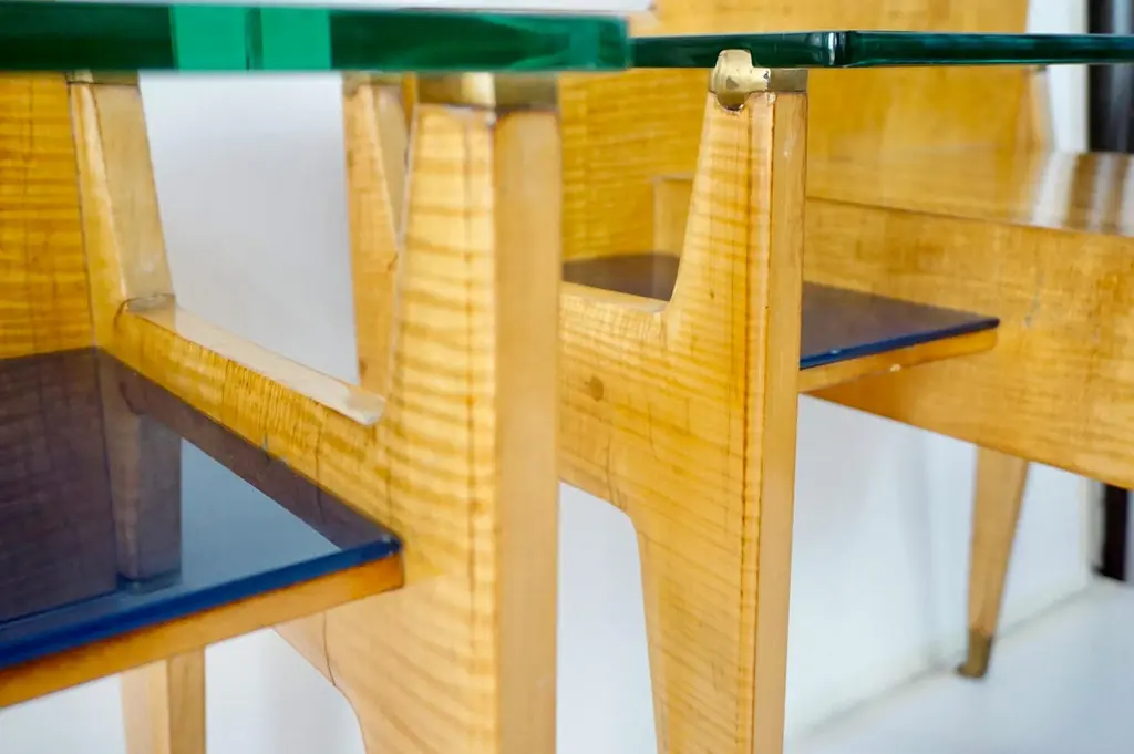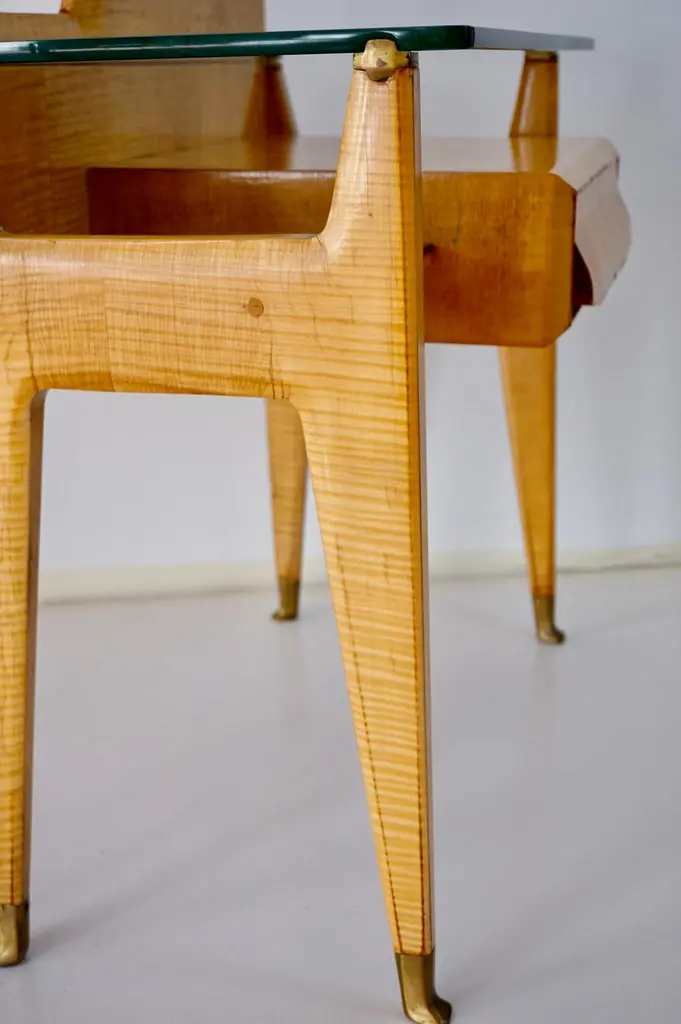 pair of fine and elegant bed side tables designed by Vittorio Dassi 1950produced by Dassi for La Permanente, CantùBirdseye maple veneered, thick "green nile " glass top, brass details blu glass for the second level with retro original stampgood conditions some little signs on the wood and a little sign on one top glassMeasures: 64 cm x 38 cm , Height 70 cm ( height at the top glass: 57 cm )