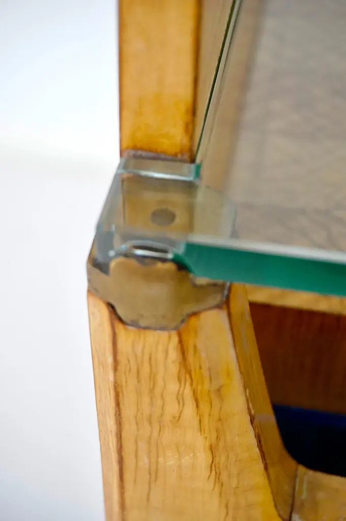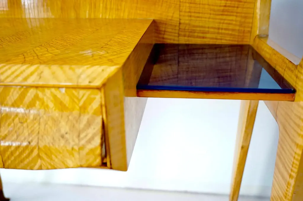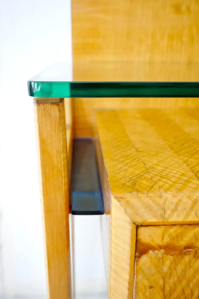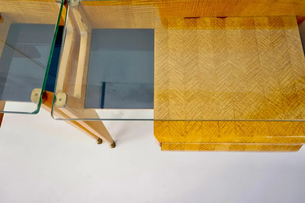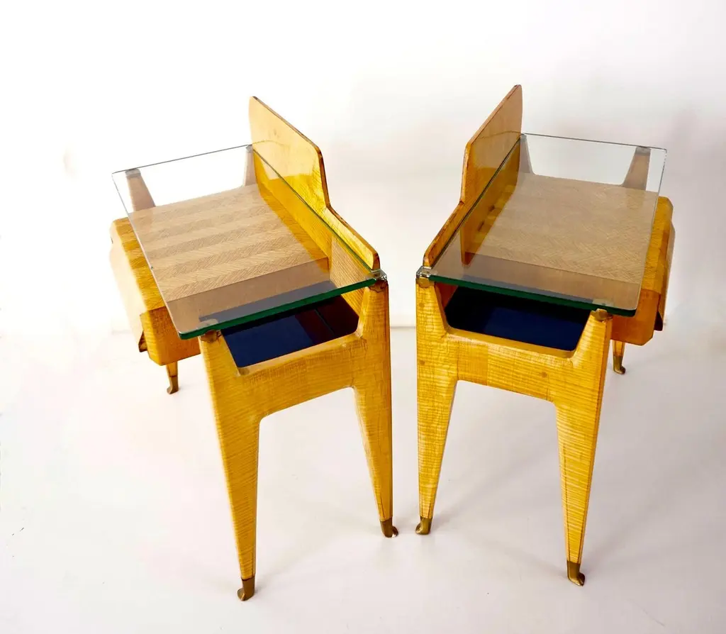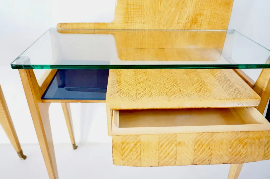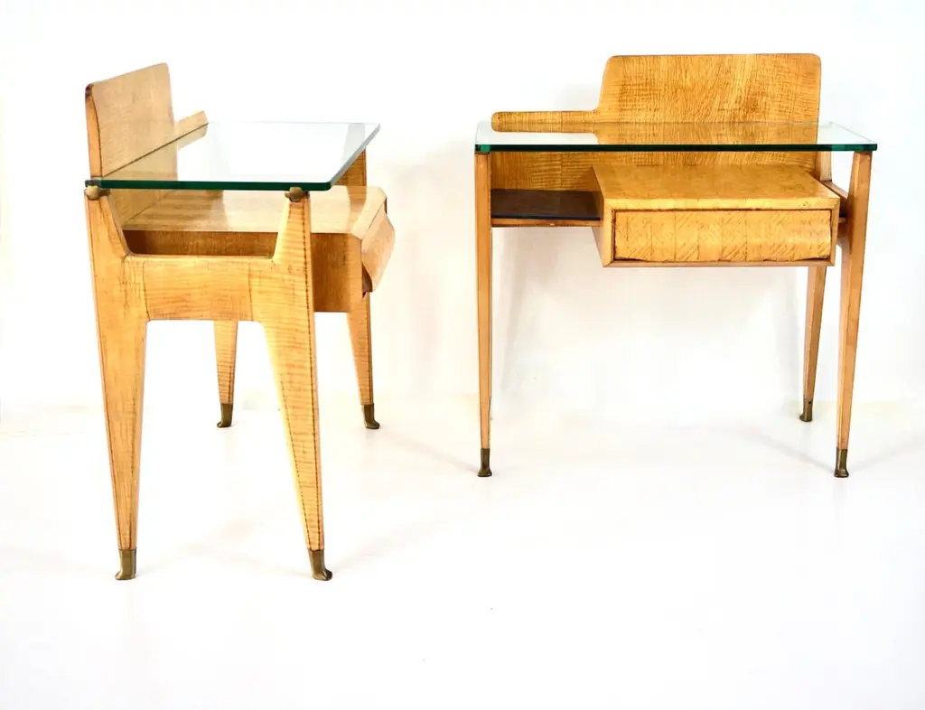 pair of fine and elegant bed side tables designed by Vittorio Dassi 1950produced by Dassi for La Permanente, CantùBirdseye maple veneered, thick "green nile " glass top, brass details blu glass for the second level with retro original stampgood conditions some little signs on the wood and a little sign on one top glassMeasures: 64 cm x 38 cm , Height 70 cm ( height at the top glass: 57 cm )