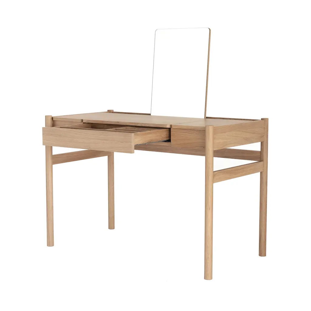 The Pala Vanity Dressing Table/Desk from Case Furniture adds modern Scandi sophistication to your bedroom as a stylish and compact vanity/desk. The smart design combines minimal proportions and flexible configurations, ideal for small spaces. With two removable magnetic panels, a slim vanity drawer with integrated divider, and detachable mirror, this dressing table exudes an understated elegant style with modern needs in mind. Highlights