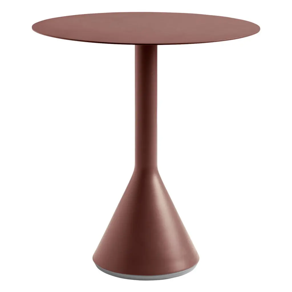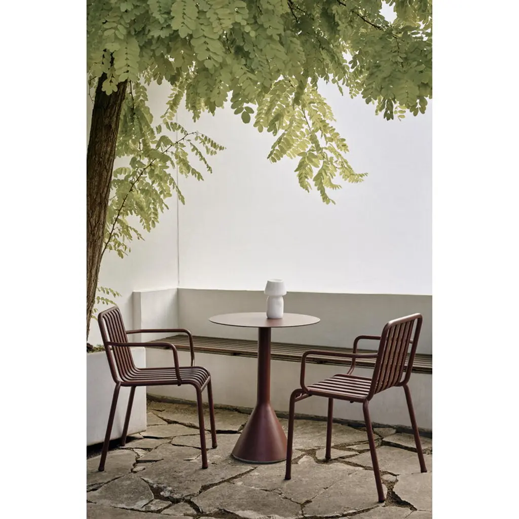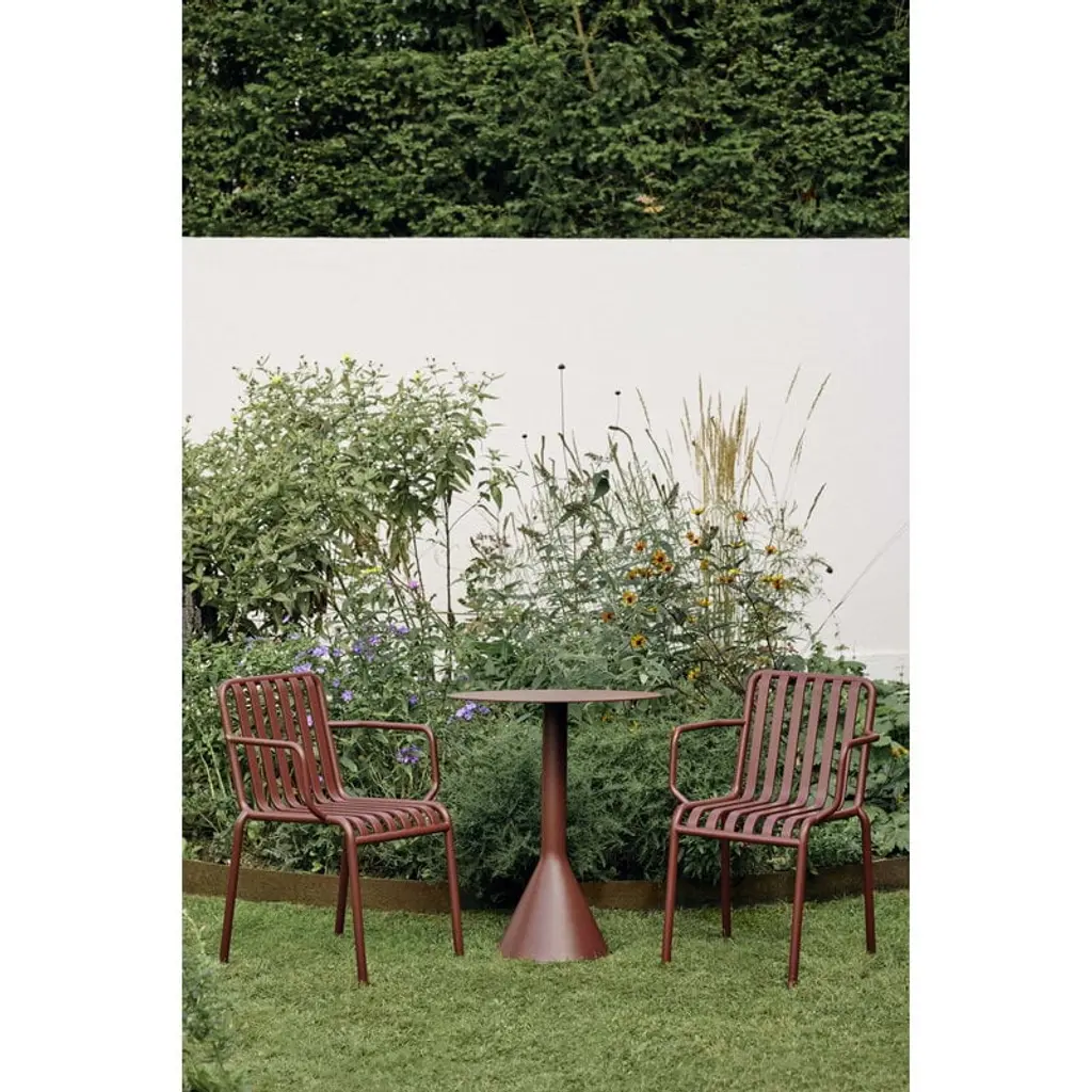 A combination of a cone-shaped leg and a thin steel tabletop, the Palissade Cone table is a bold and versatile addition to HAY's outdoor furniture collection. Palissade outdoor furniture features a strong, graphic design that consists of simple steel tubes and slats. Ronan and Erwan Bouroullec worked with the collection for two years and created a range of simple, balanced pieces that are well suited for terraces, balconies, gardens, cafés and public spaces. The Palissade chairs, tables and benches are sturdy but elegant, and perfect for outdoor use since wind and water will pass through the galvanized steel frame. The Palissade furniture was designed to age well and its muted color palette adds to the timeless and versatile appearance.