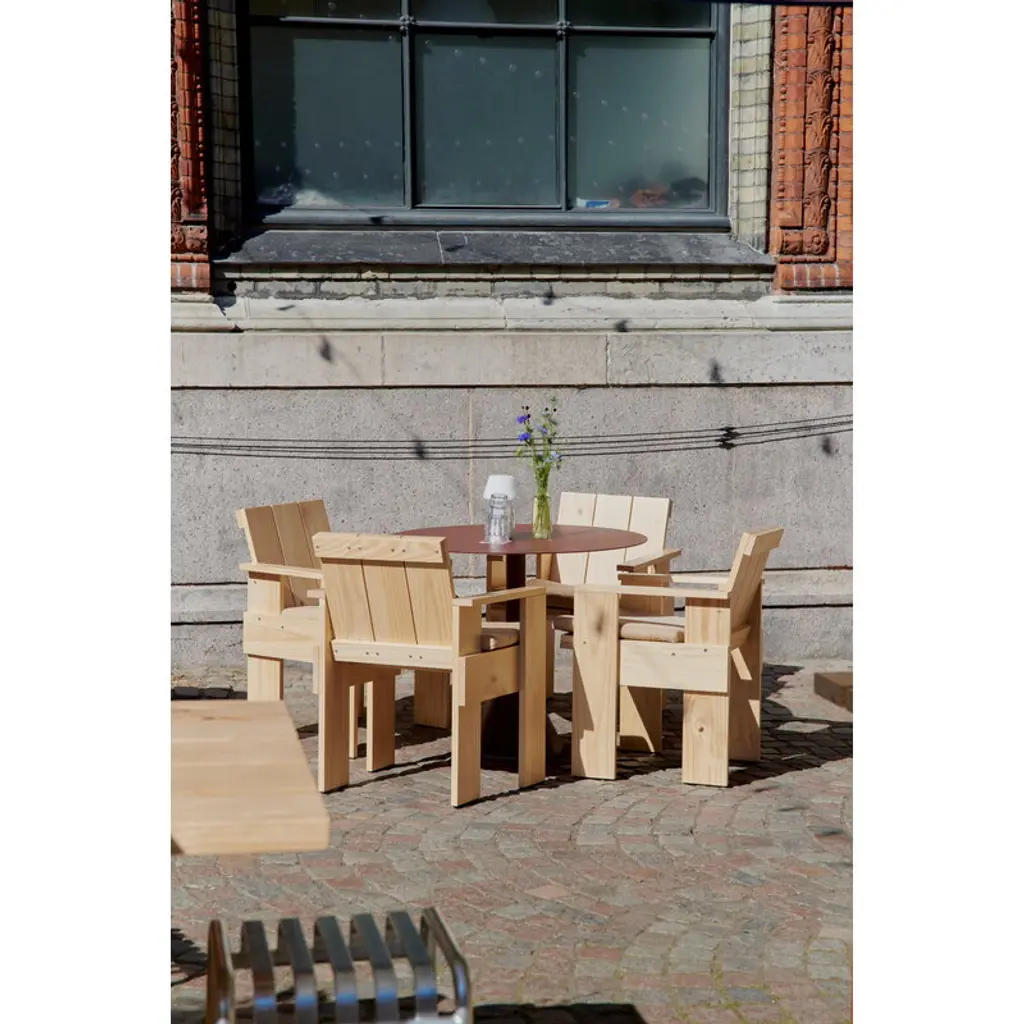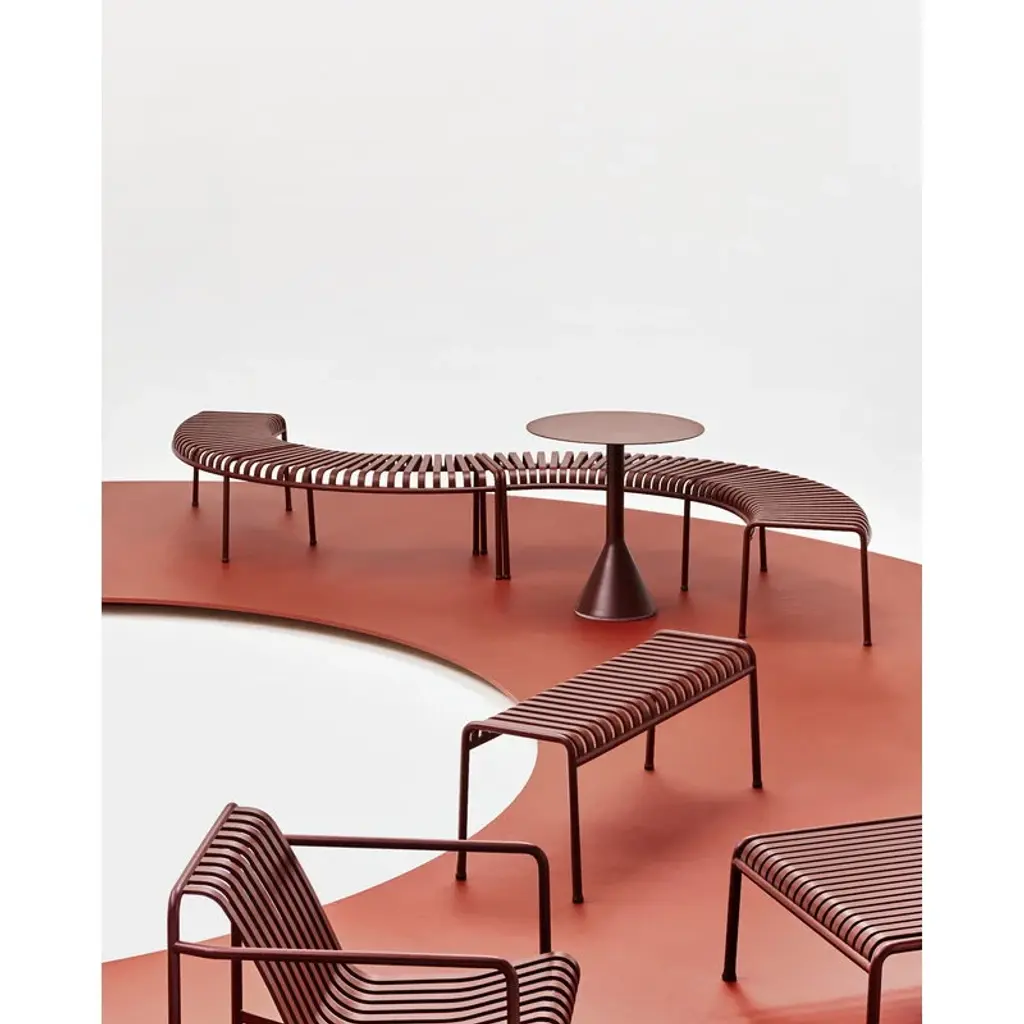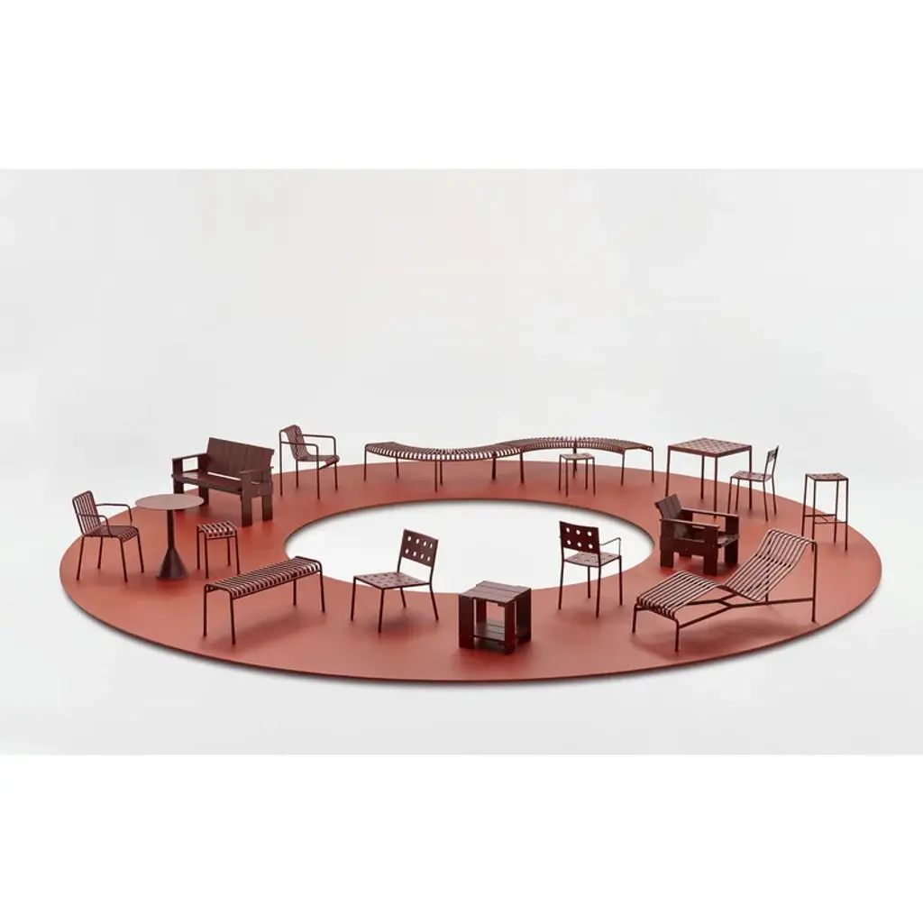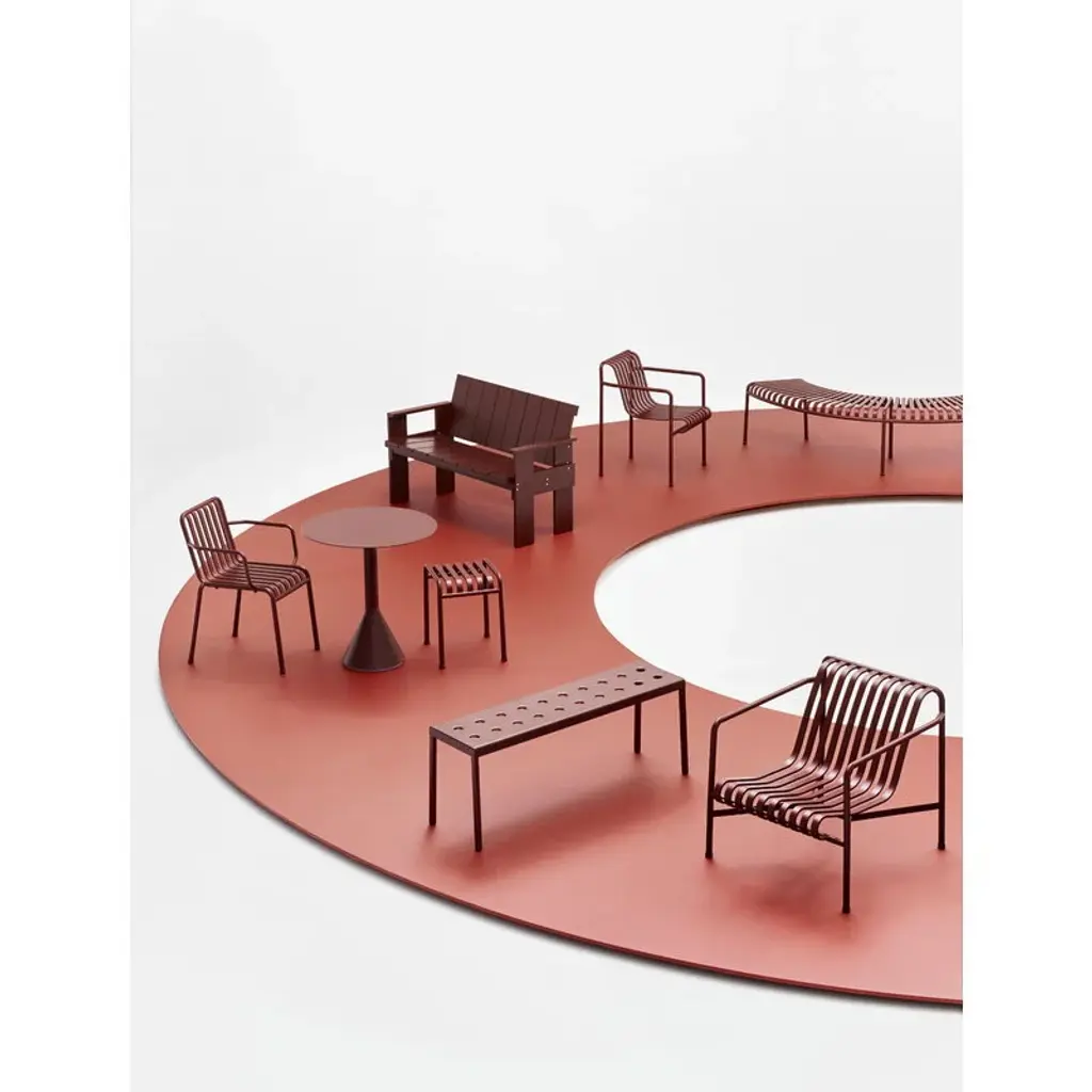 A combination of a cone-shaped leg and a thin steel tabletop, the Palissade Cone table is a bold and versatile addition to HAY's outdoor furniture collection. Palissade outdoor furniture features a strong, graphic design that consists of simple steel tubes and slats. Ronan and Erwan Bouroullec worked with the collection for two years and created a range of simple, balanced pieces that are well suited for terraces, balconies, gardens, cafés and public spaces. The Palissade chairs, tables and benches are sturdy but elegant, and perfect for outdoor use since wind and water will pass through the galvanized steel frame. The Palissade furniture was designed to age well and its muted color palette adds to the timeless and versatile appearance.
