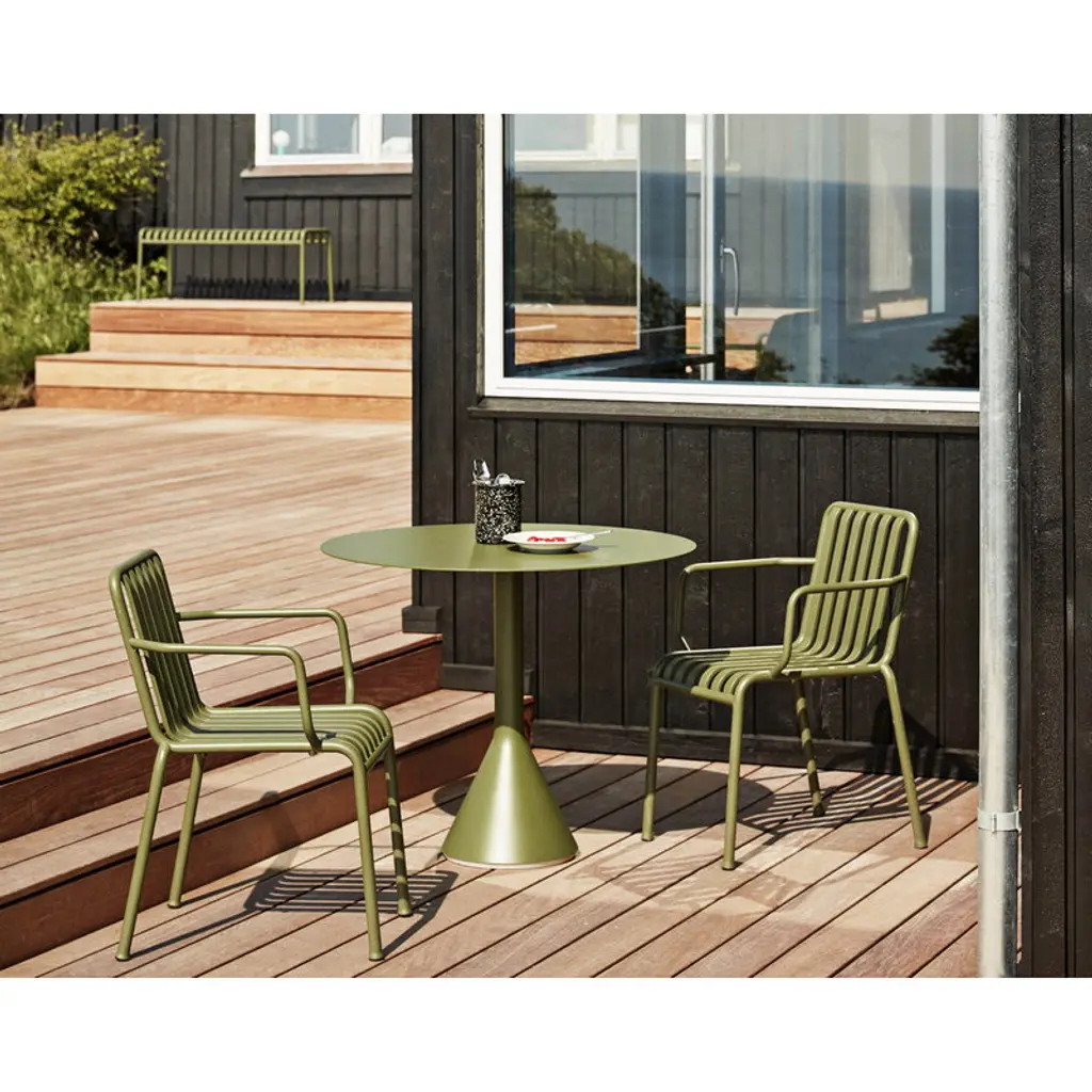 A combination of a cone-shaped leg and a thin steel tabletop, the Palissade Cone table is a bold and versatile addition to HAY's outdoor furniture collection. Palissade outdoor furniture features a strong, graphic design that consists of simple lines and shapes, made of steel. Ronan and Erwan Bouroullec worked with the collection for two years and created a range of simple, elegant and balanced pieces that are well suited for terraces, balconies, gardens, cafés and public spaces. The sturdy Palissade furniture was designed to age well and stand different weather conditions, and its muted color palette adds to the timeless and versatile appearance.