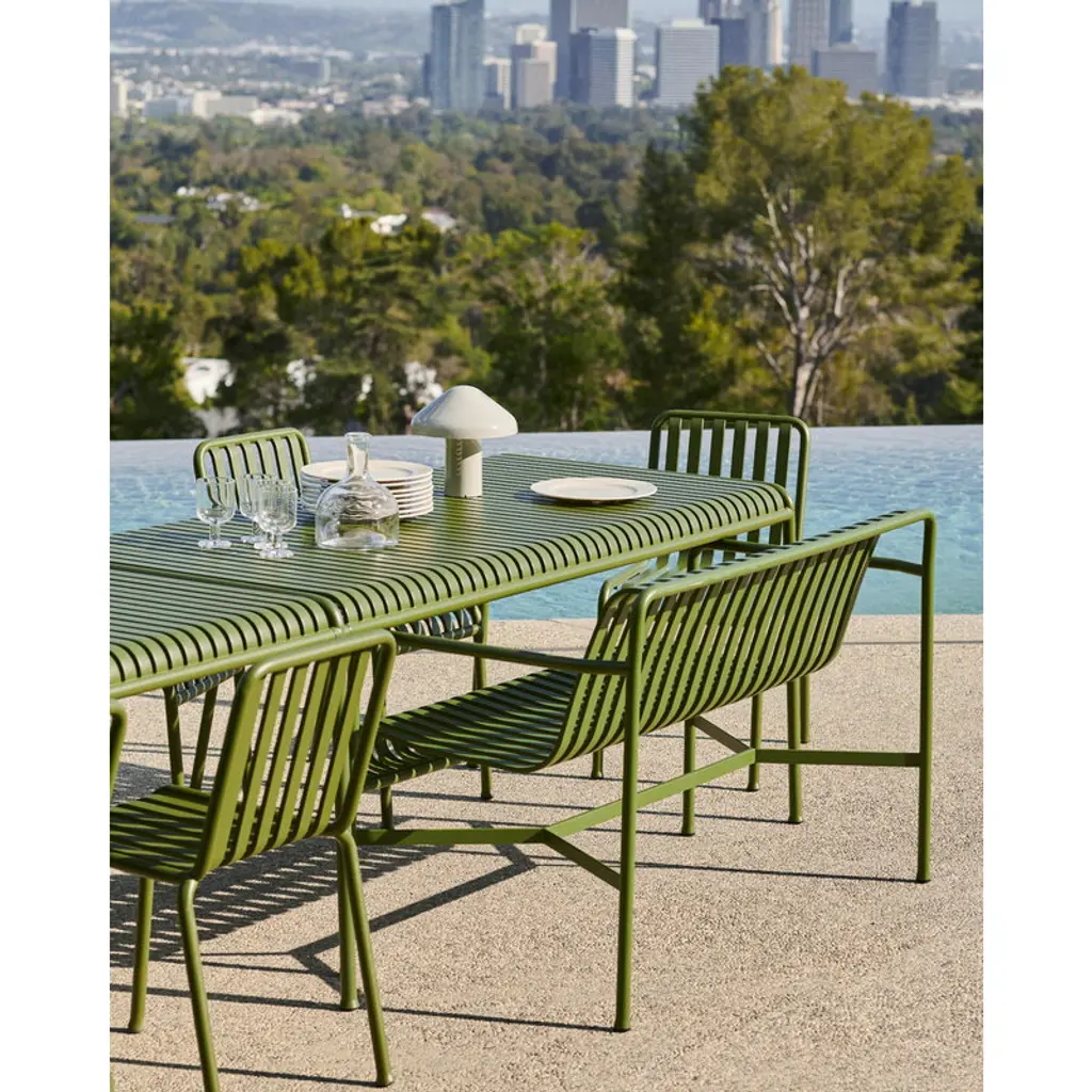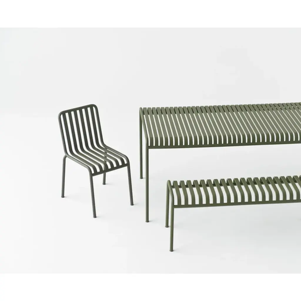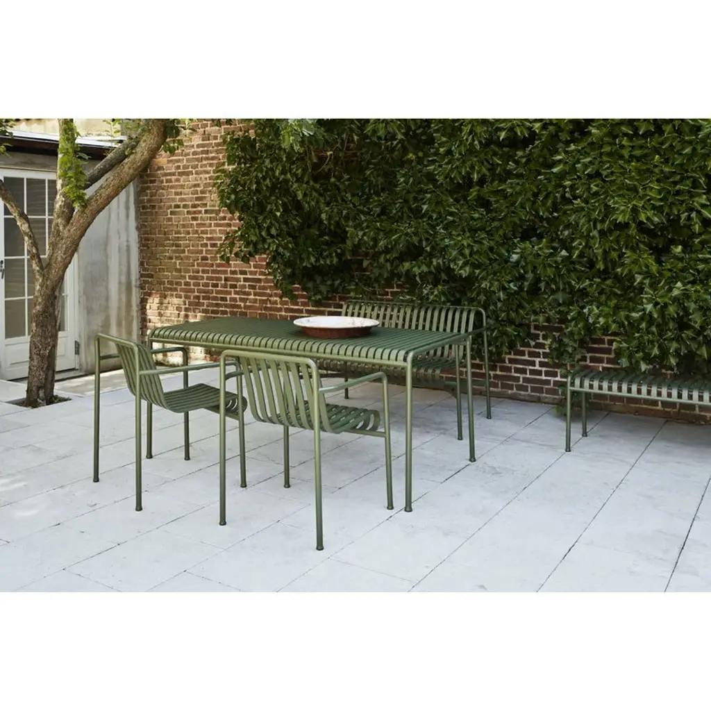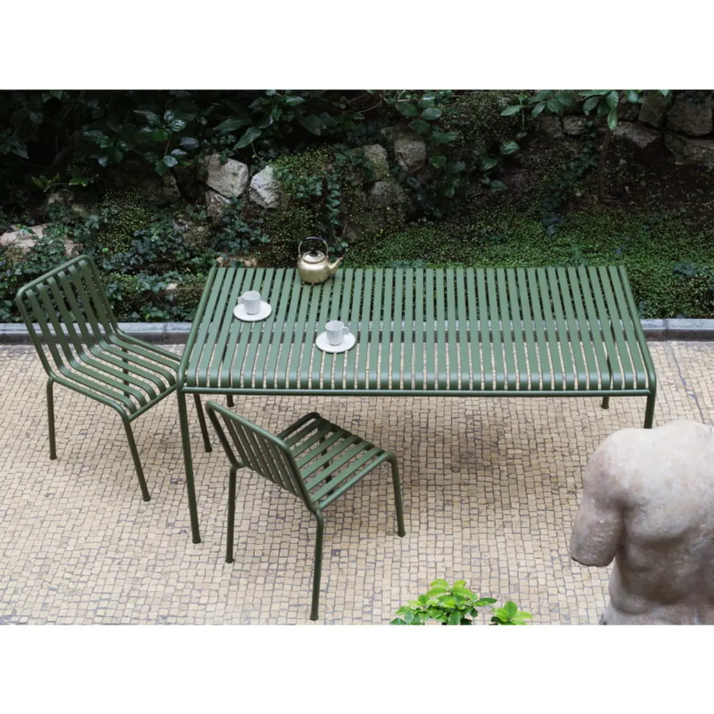 The sleek yet robust Palissade table is a member of HAY’s versatile outdoor furniture collection. Palissade outdoor furniture features a strong, graphic design that consists of simple steel tubes and slats. Ronan and Erwan Bouroullec worked with the collection for two years and created a range of simple, balanced pieces that are well suited for terraces, balconies, gardens, cafés and public spaces. The Palissade chairs, tables and benches are sturdy but elegant, and perfect for outdoor use, since wind and water will pass through the galvanized steel frame. The Palissade furniture was designed to age well and its muted color palette adds to the timeless and versatile appearance.