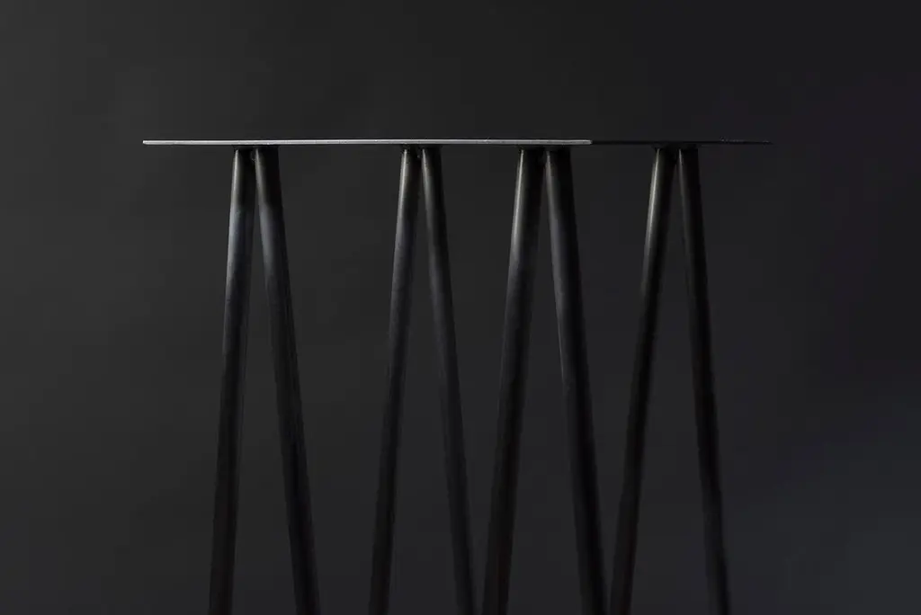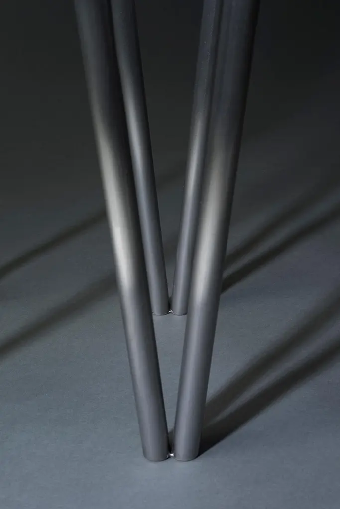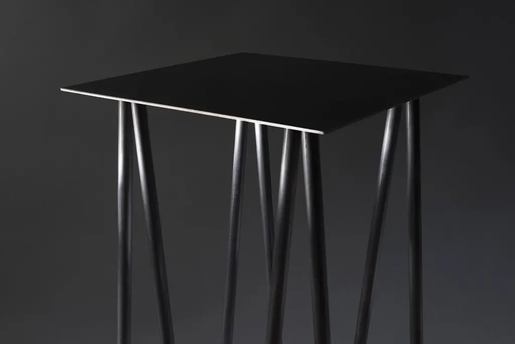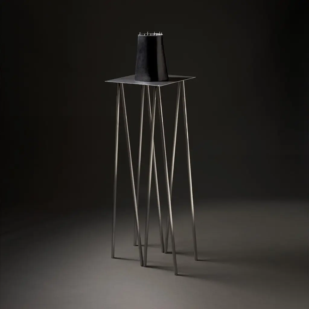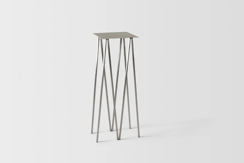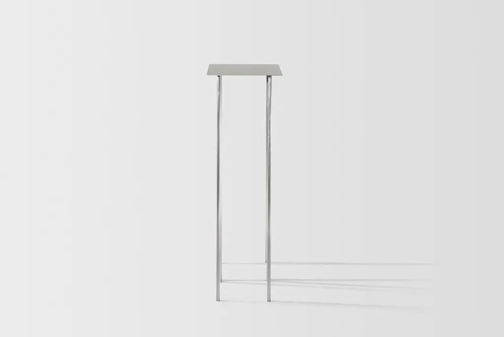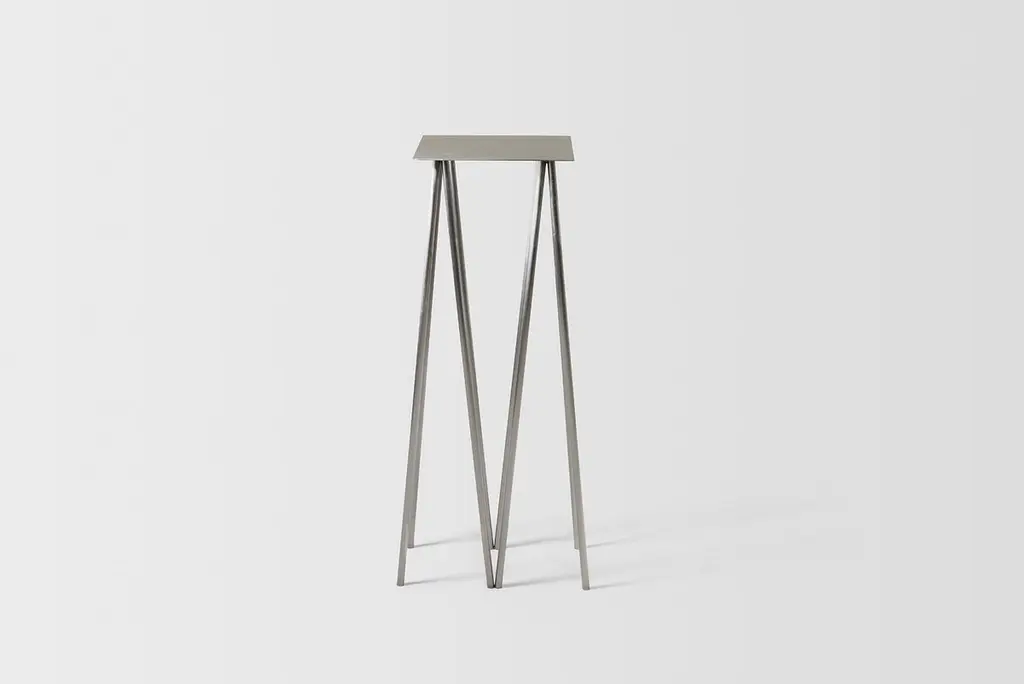 Where metal implies sturdiness, and calls for strong Industrial motifs - the I/ the H, the beam / the cross, the Paper Table is a play on our own sense of balance. It questions the thinness of both surface and structure, in order to reach their minimal expression. What is the minimum structure necessary to draw a sense of comfort and sturdiness, while still feeling fragile and "almost precarious" in its movements. The metal surface becomes paper-like, levitating - supported by an elegant series of V legs. The result is a perfect balance between stability and thinness. Listing is for Polished Steel Finish although also available in Stained Black Finish. Dimensions:L 1'8", D 1'3", H 3'8"Table surface: 1'3" x 1'3".