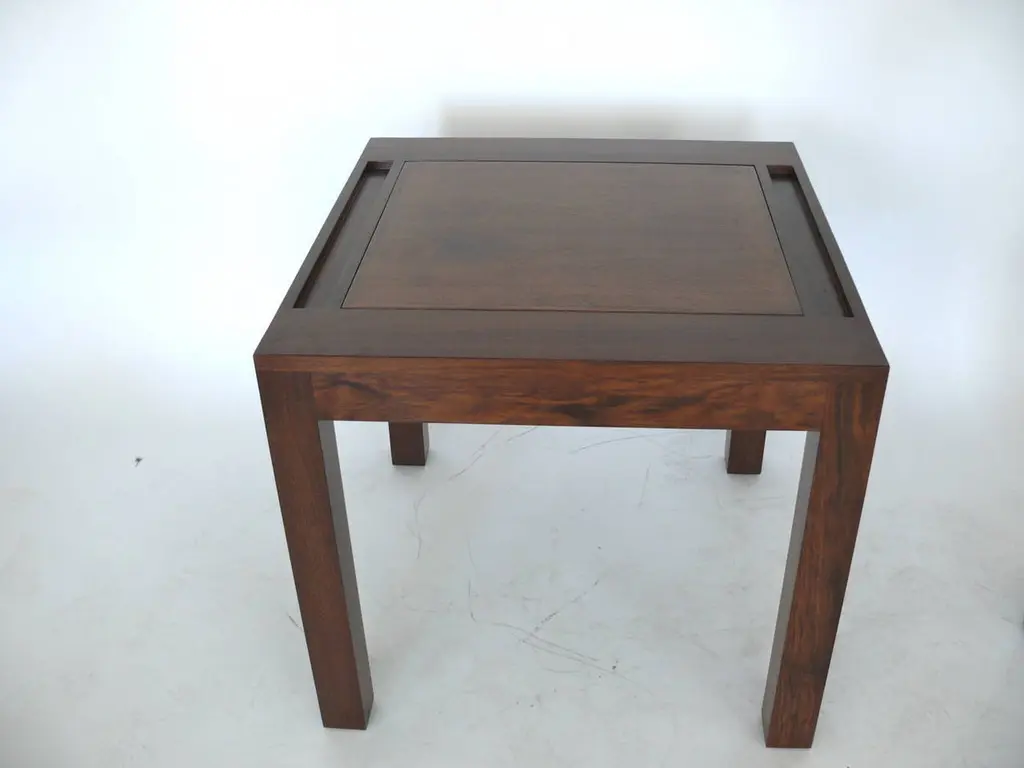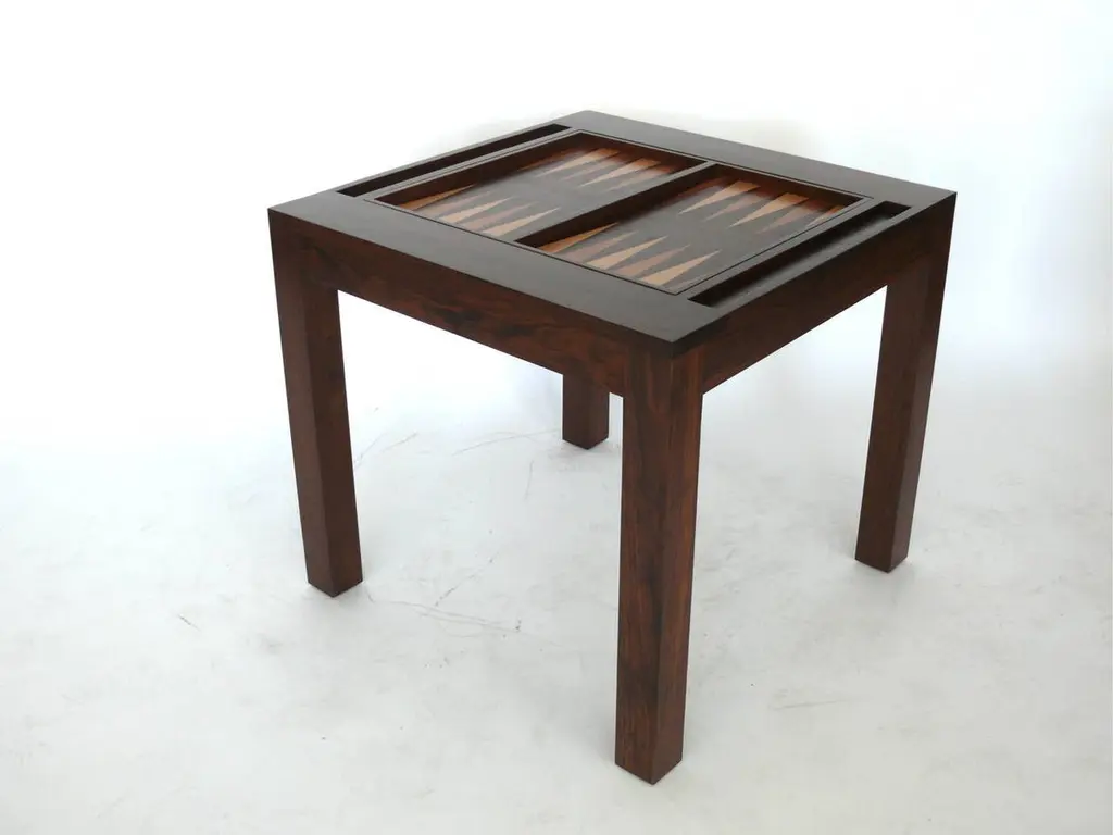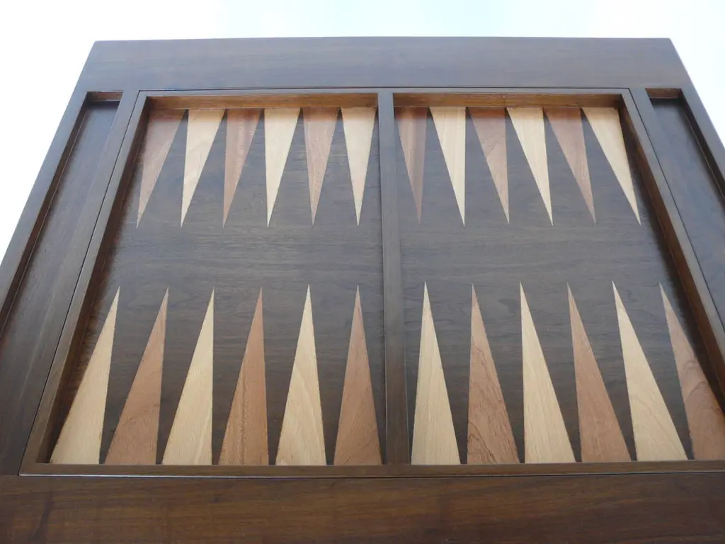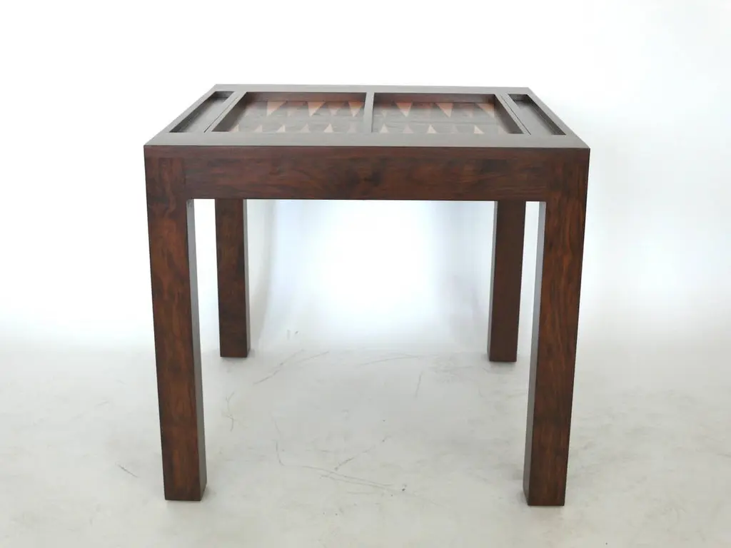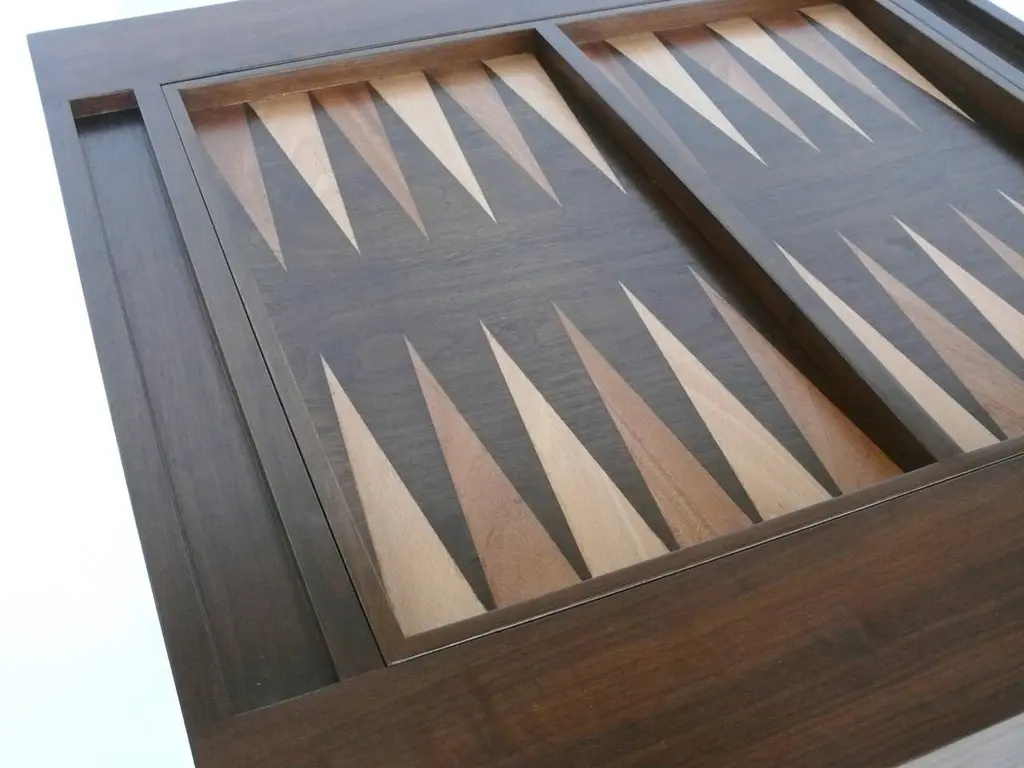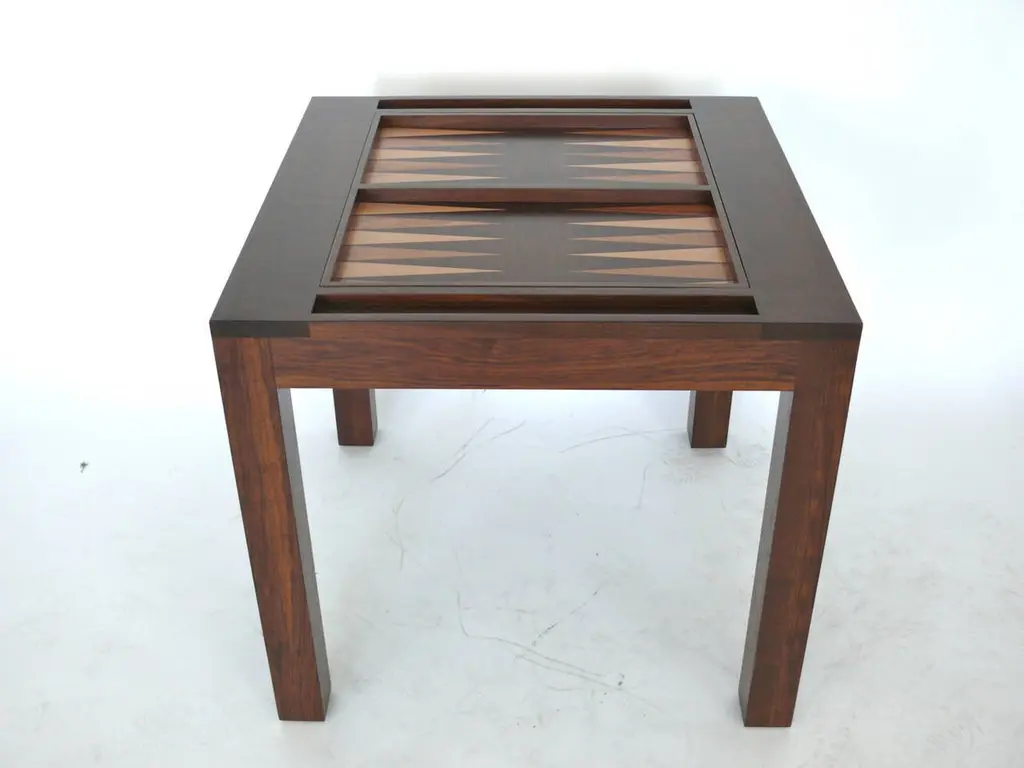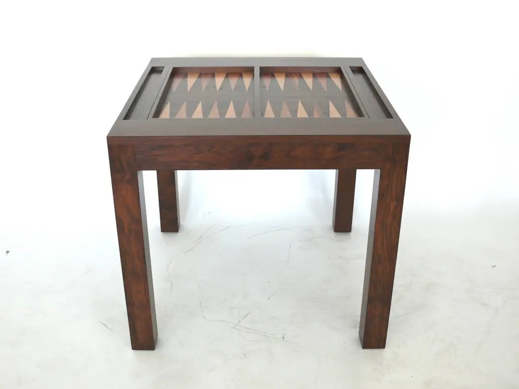 Parson's style backgammon table newly produced and refinished in a medium walnut. The game board features hand inlaid mahogany and beech wood. Playing surface flips to reveal a solid walnut tabletop perfect for board or card games. Custom finishes available.