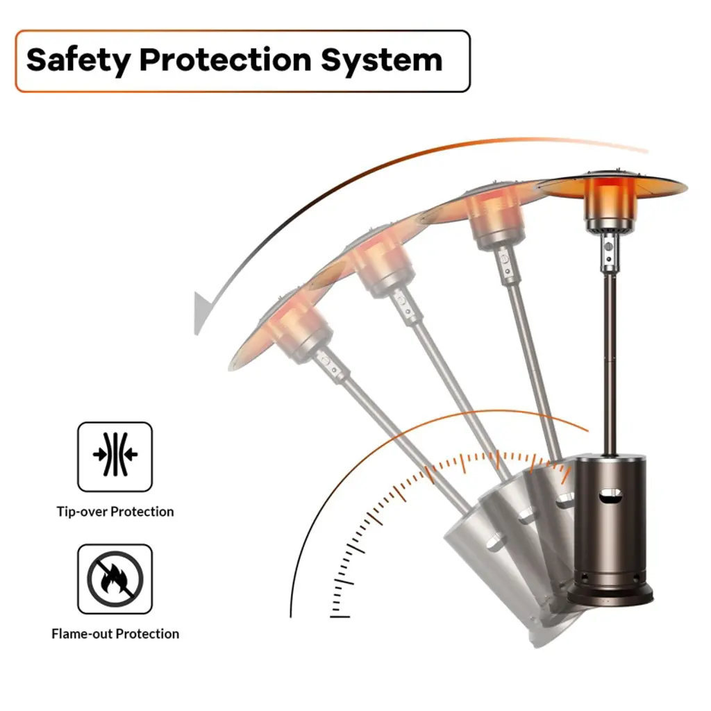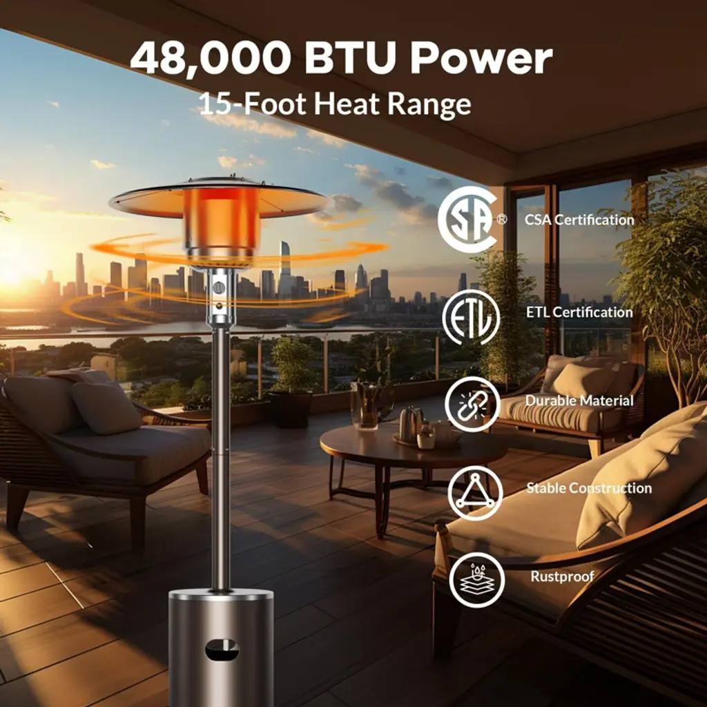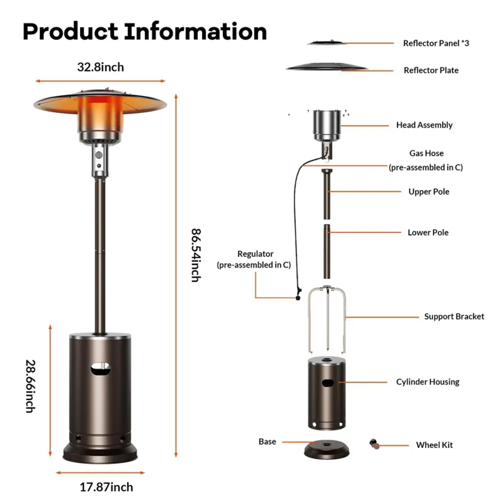1.48,000 BTU Heating Power: Warmth for 15-Ft Radius & All-Day Gatherings This commercial-grade propane patio heater delivers robust 48,000 BTU heat output¡ªenough to warm a 15-foot radius (comfortably fitting 6¨C8 people) and extend outdoor use into chilly evenings, fall months, or even mild winter days. It runs for 8¨C10 hours on a standard 20-lb propane tank (tank not included), making it perfect for all-day backyard barbecues, evening caf¨¦ patios, or long garden parties without frequent refueling. The double-walled stainless steel construction enhances heat radiation efficiency: the inner layer retains heat to minimize waste, while the outer layer distributes warmth evenly across the space¡ªno hot spots or cold corners, ensuring everyone stays cozy. 2.Double-Layer 304 Stainless Steel: 30% Longer Lifespan & All-Weather Durability Crafted with double-layer 304 stainless steel burner grids and a reinforced frame, this heater stands up to corrosion, rust, and daily wear¡ªeven in humid coastal areas or rainy climates. Unlike single-layer models that thin or warp over time, the double-layer design adds structural strength and heat resistance, boosting its lifespan by 30%. The 304 stainless steel is food-grade and non-reactive, so it won¡¯t degrade from exposure to outdoor elements (sun, rain, snow) or propane fumes. This durability makes it ideal for both residential use (year-round patio heating) and commercial settings (busy restaurant patios, event venues) where reliability is critical. 3.Intuitive Controls: 3-Second Ignition & Easy Temperature Tuning Designed for hassle-free use, the heater features a user-friendly control knob that lets you adjust heat output precisely¡ªfrom low (for mild chills) to high (for colder nights), so you can tailor warmth to your comfort. Its one-touch ignition system lights the flame in just 3 seconds¡ªno fumbling with matches or lighters, even with gloves on. A unique ¡°bucket-hole¡± design on the heater body provides easy access to the gas valve: you can turn the propane supply on/off or adjust it without disassembling any parts, saving time and frustration during setup or refueling. 4.Triple Safety Protection: Tilt & Flame-Out Guards for Peace of Mind Safety is prioritized with two key protective systems:Tip-over protection: If the heater tilts more than 45 degrees (e.g., from a strong wind or accidental bump), it automatically cuts the gas supply and extinguishes the flame¡ªpreventing fires or gas leaks. Flame-out protection: If the flame is accidentally blown out (by wind) or otherwise extinguished, the system shuts off gas flow instantly, eliminating the risk of unburned propane escaping. These features make the heater safe for families with kids/pets, busy commercial spaces, or windy outdoor areas¡ªletting you enjoy warmth without worrying about accidents. 5.Portable & Multi-Functional: Easy Setup & Space-Saving Design Assembly is a breeze: the heater comes with just three main parts and anti-loosening screws, and most users can put it together in under 30 minutes using the included instructions (no specialized tools needed). Smooth-rolling wheels on the base let you move it effortlessly¡ªslide it from the patio to the deck, or from a storage shed to the garden, without lifting heavy parts. The flat lid of the propane tank compartment doubles as a convenient snack or drink tray: set down cups, plates, or condiments to keep essentials within reach during gatherings, maximizing space and practicality.