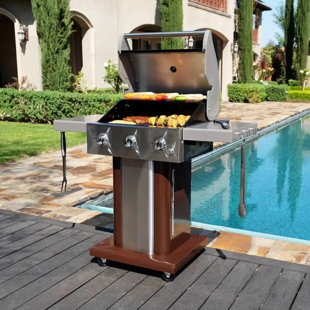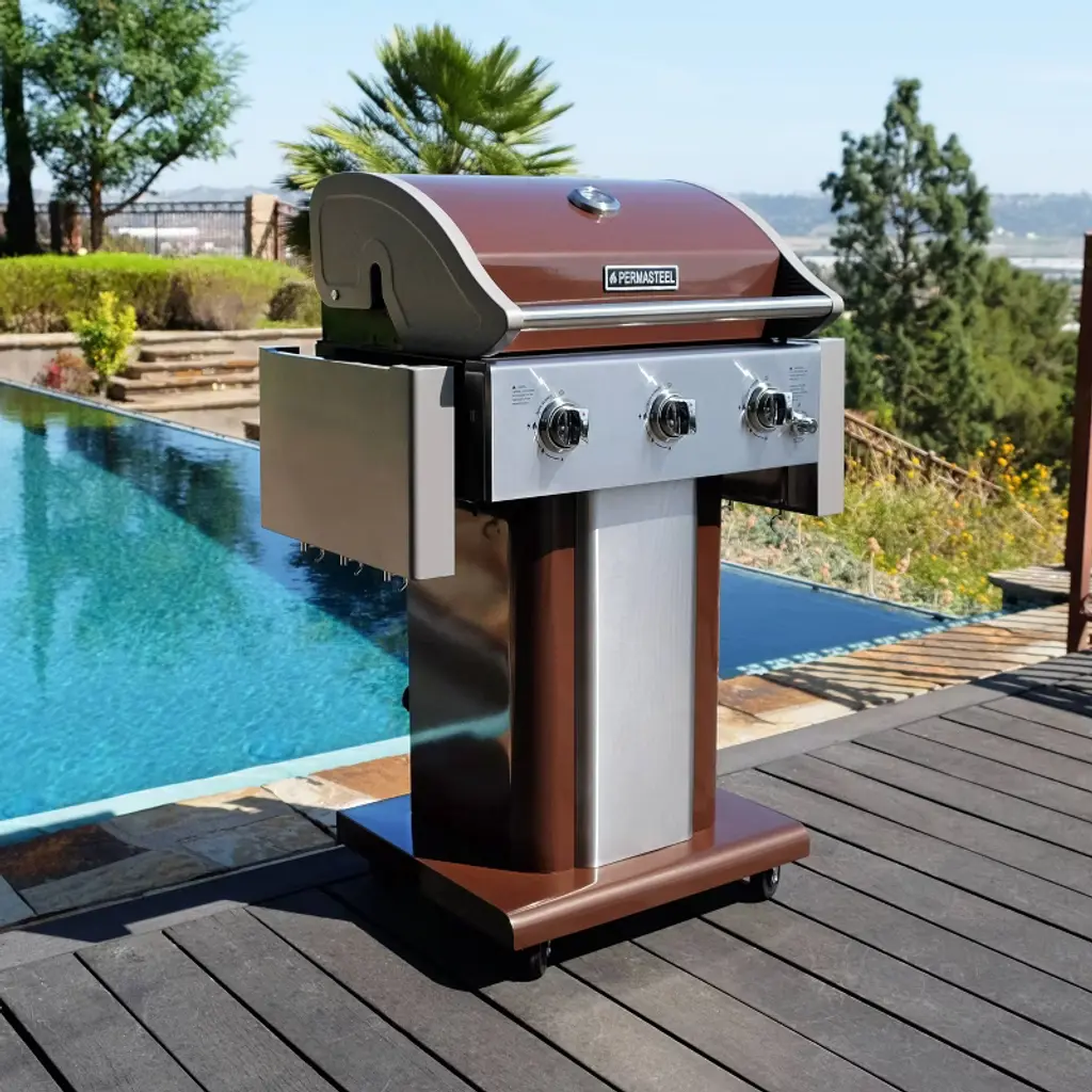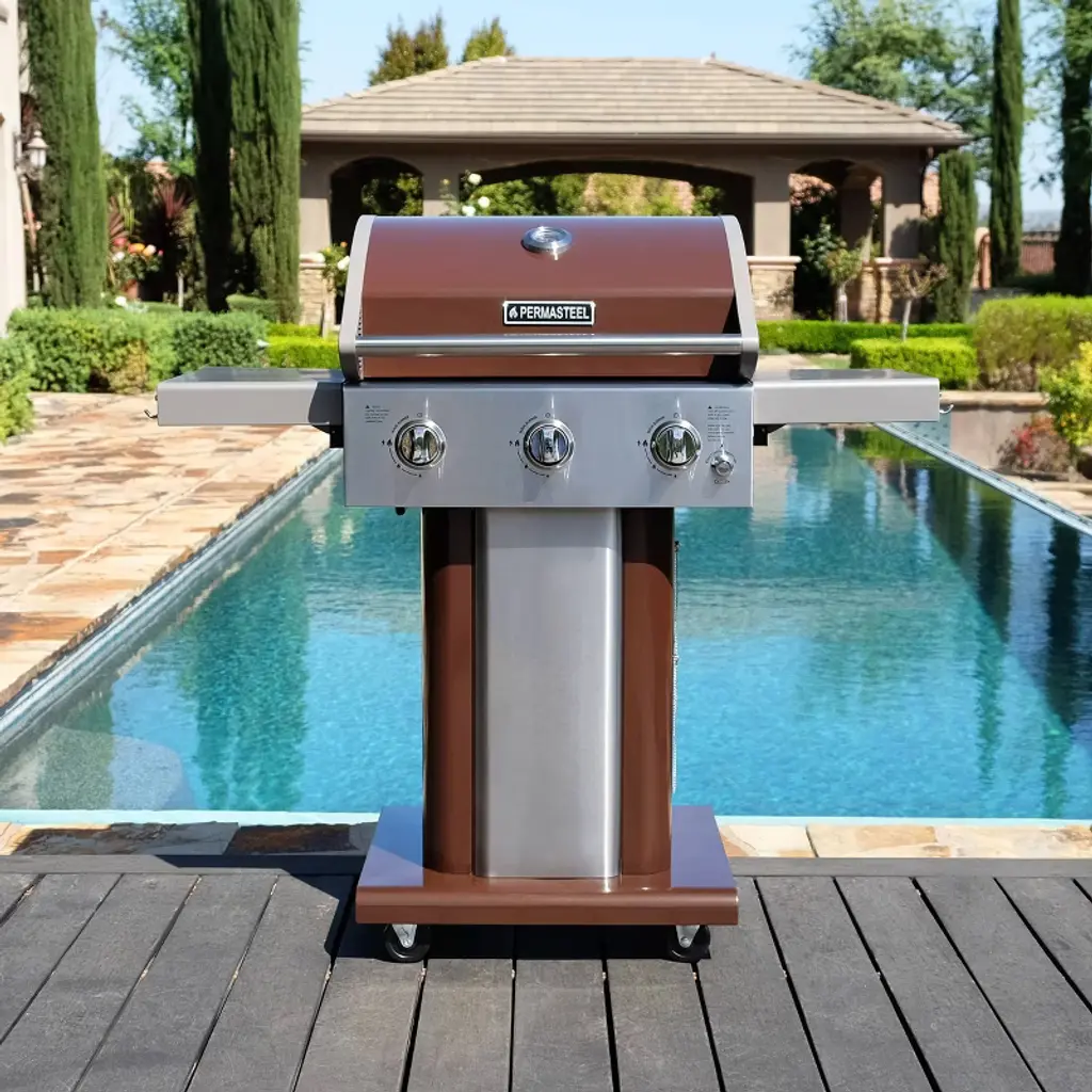 Permasteel Pg-40301-mo 3-burner Gas Grill With Foldable Side Tables - Mocha: Porcelain-coated, Push Button Ignitor