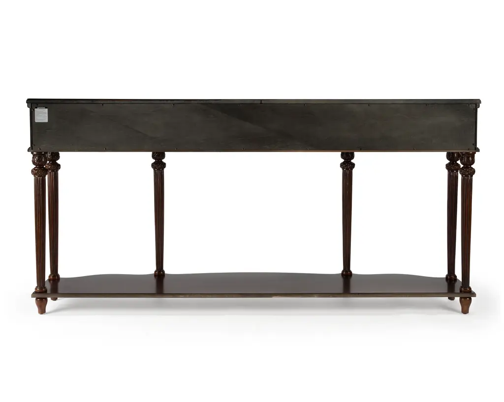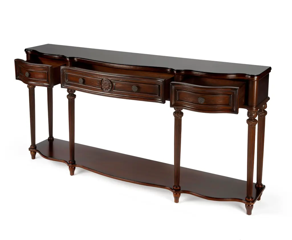 This gorgeous console exudes grandeur. Crafted from select solid Woods, Wood products and choice veneers, it features a shapely top, lower shelf and drawer fronts all done in cherry veneers. The legs have a fluted design with hand carved acanthus leaf detail. Three drawers with resin accents and antique brass finished hardware. Durably Constructed With: Rubberwood Solids, MDF, Cherry Veneer, Nickel, Zinc Product Construction Features: Wood Slide,Finish Distressing Product Assembled Measurement & Weight: 34.0" H x 72.0" W x 15.0" D -- 95.0 lbs. 180 lbs. Suggested weight capacity Item Arrives: Needs Assembly Wood, like all natural materials, has inherent disparities in color and grain pattern. Variations in shade and markings are normal and can be expected with the natural materials used in the construction of this product. Photo may slightly differ from actual item in terms of color/finish due to the lighting during photo shoot or the monitor's display.