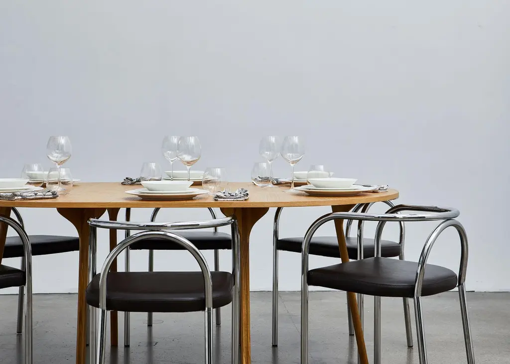 The intricately shaped legs of the PH circle table, inspired by the agile movement of the scarab beetle, together with the benefit of precision design and engineering – enable Poul Henningsen to design a table with the most unobtrusive of legs. Measures: 1270 x 1820mmA triumph of aesthetic design as well as function, even the smallest apartments can be accommodating this table, which with its extension leaves, easily provides additional capacity for extra guests. For daily use, the smaller circle is perfect and very pleasant to sit at with plenty of space for legs, yet when friends are coming over or family is gathering together this piece can be transformed into a spacious table. The PH circle table is a piece of furniture that will be coveted by this and many generations to come. Designed in the 1930s, yet it is so contemporary and modern in finishing and look.The PH circle table comes in three different sizes in addition to the extension system and with a variety of finishes of the table tops: natural oak, black oak or laminated. The solid wood legs are available in natural or black oak.