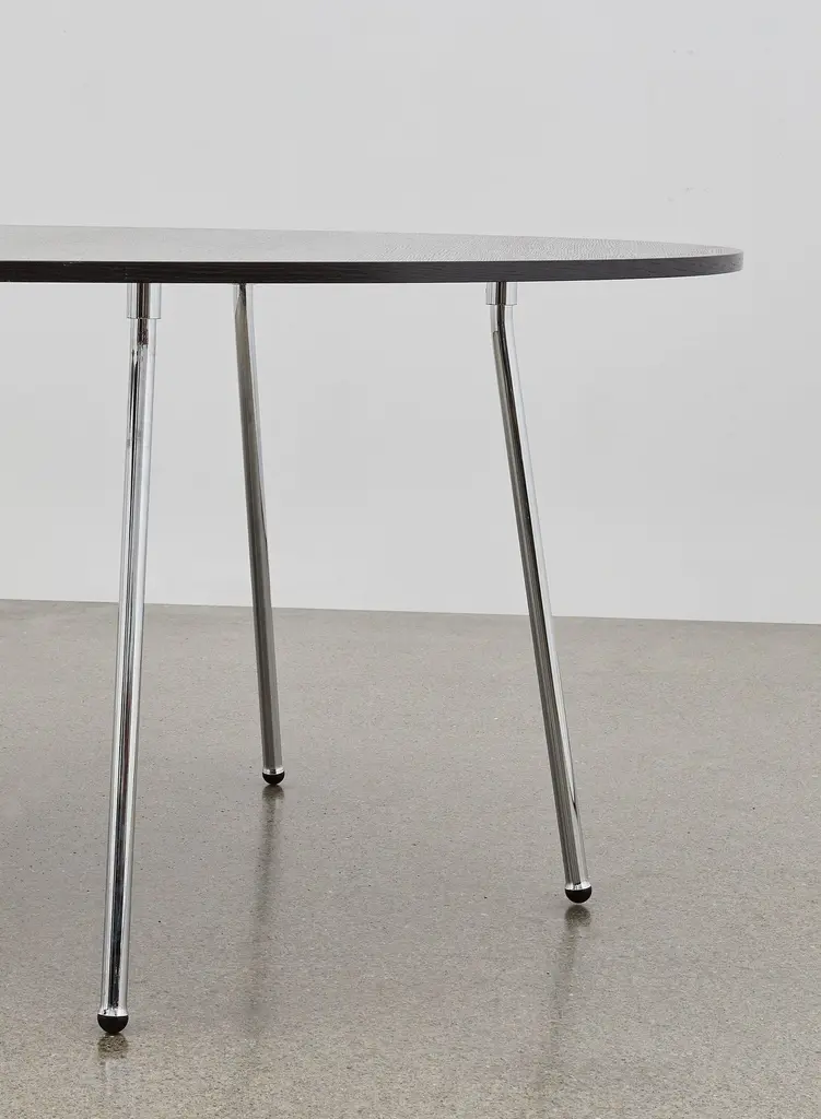 The PH Dining Table was designed in 1937; it is simple and elegant. Function meets form and the distinctive, light look of the PH Dining Table makes it suitable for any purpose at the home, at work or in the meeting room.The PH Dining Table can be ordered with a lightweight extension leaf enabling it to be transformed from smaller to a larger table with ease. When not in use the extension leaf stands vertically beneath the table top and does not impede upon the leg-room available. When both extension leaves are hanging vertically beneath the round table top, the two swing legs form a pleasingly distinctive design. The PH Dining Table is available with chromed legs and the table top in a variety of finishes: laminate, natural or black oak. The table tops are available in three different sizes or the table extension system.