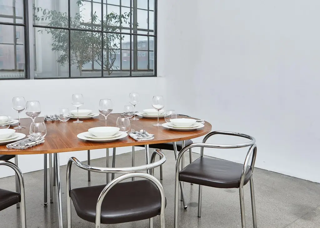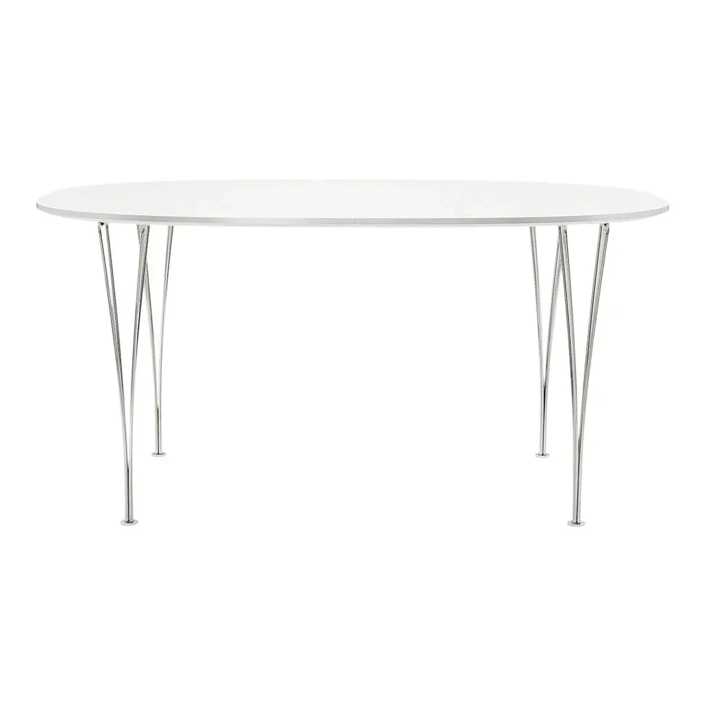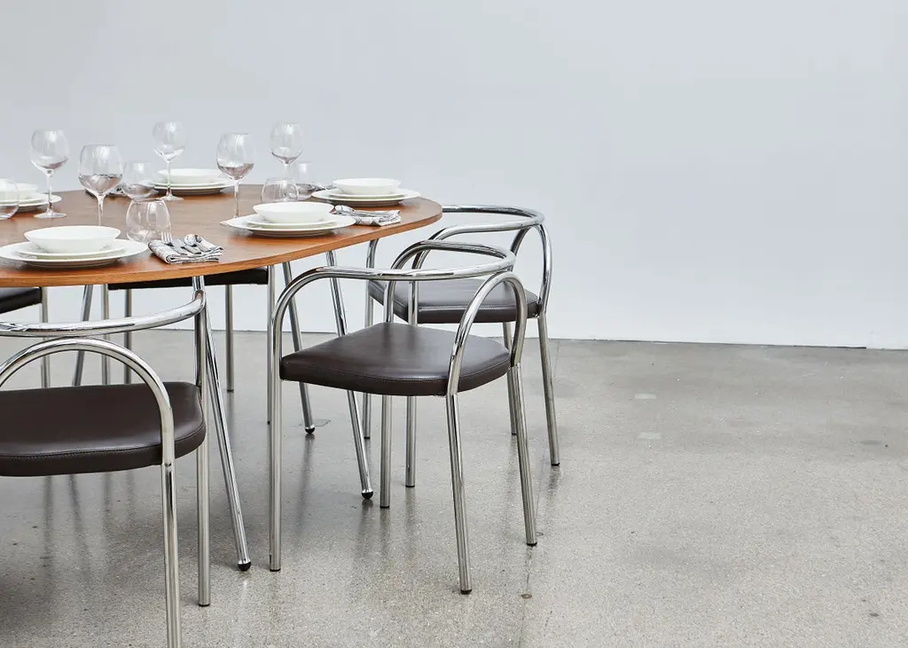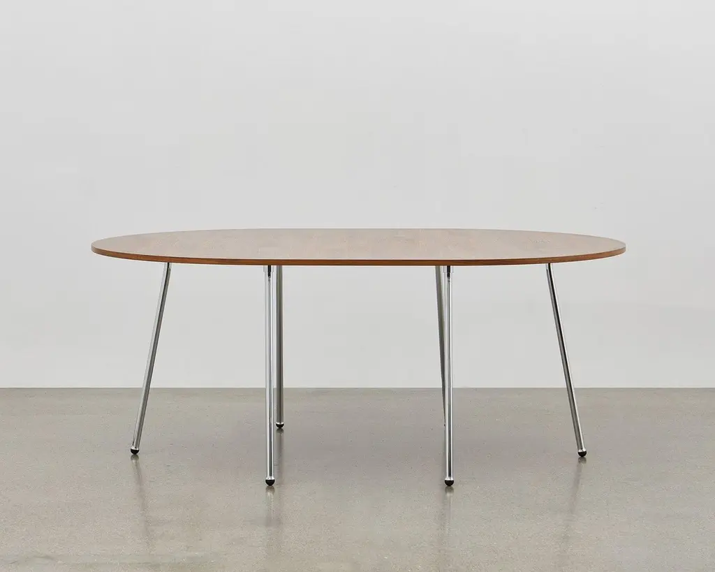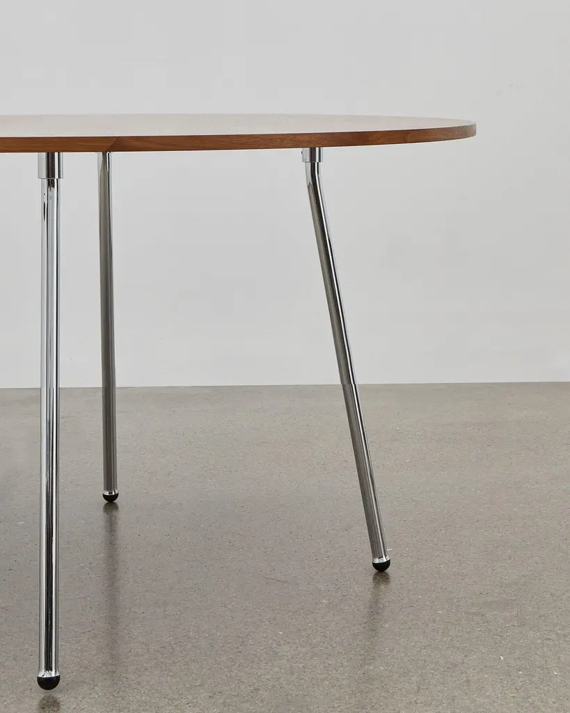 The PH dining table was designed in 1937; it is simple and elegant. Function meets form and the distinctive, light look of the PH dining table makes it suitable for any purpose at the home, at work or in the meeting room. Measures: 1270 x 1820mm.The PH dining table can be ordered with a lightweight extension leaf enabling it to be transformed from smaller to a larger table with ease. When not in use the extension leaf stands vertically beneath the table top and does not impede upon the leg-room available. When both extension leaves are hanging vertically beneath the round table top, the two swing legs form a pleasingly distinctive design. The PH dining table is available with chromed legs and the table top in a variety of finishes: laminate, natural or black oak. The table tops are available in three different sizes or the table extension system.