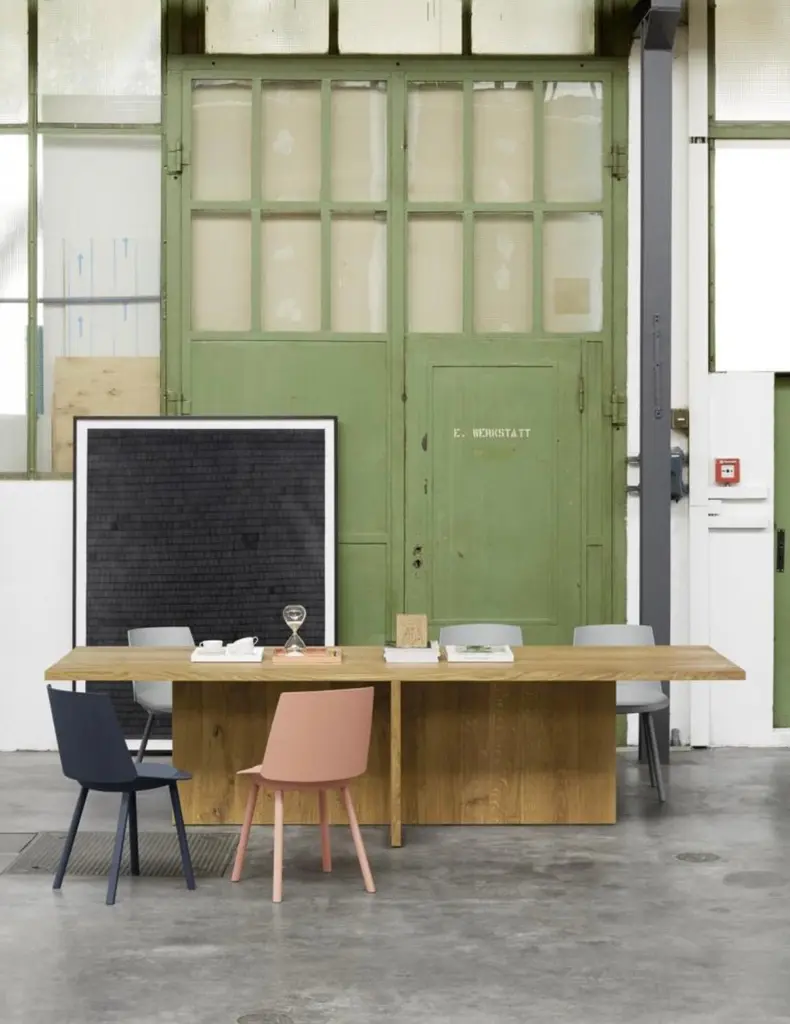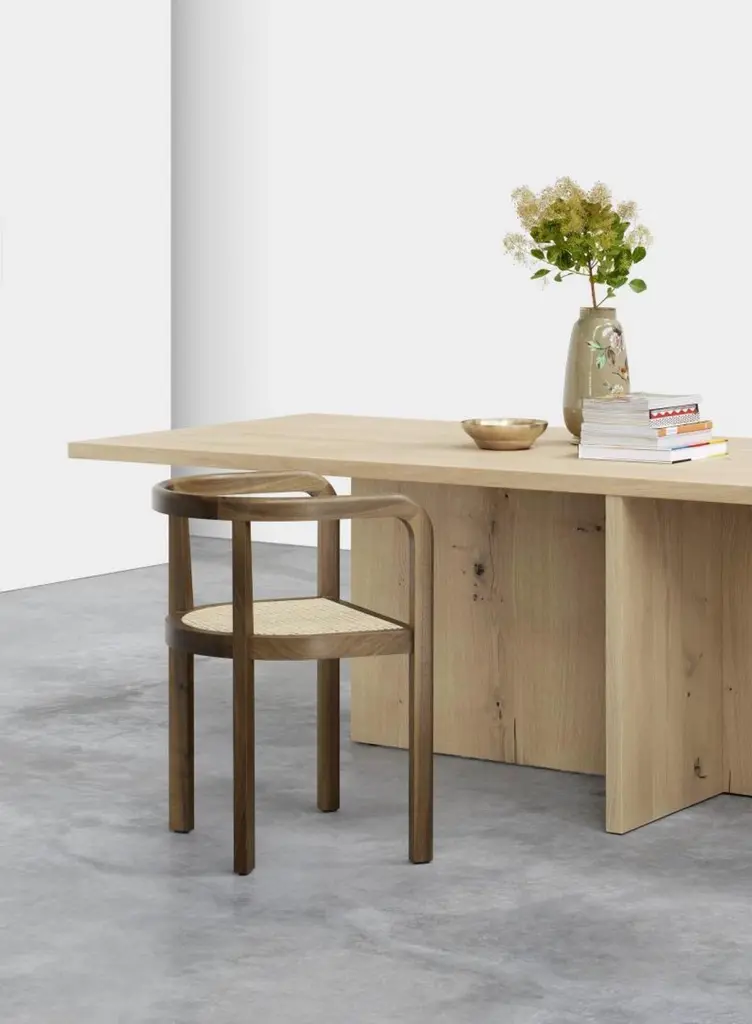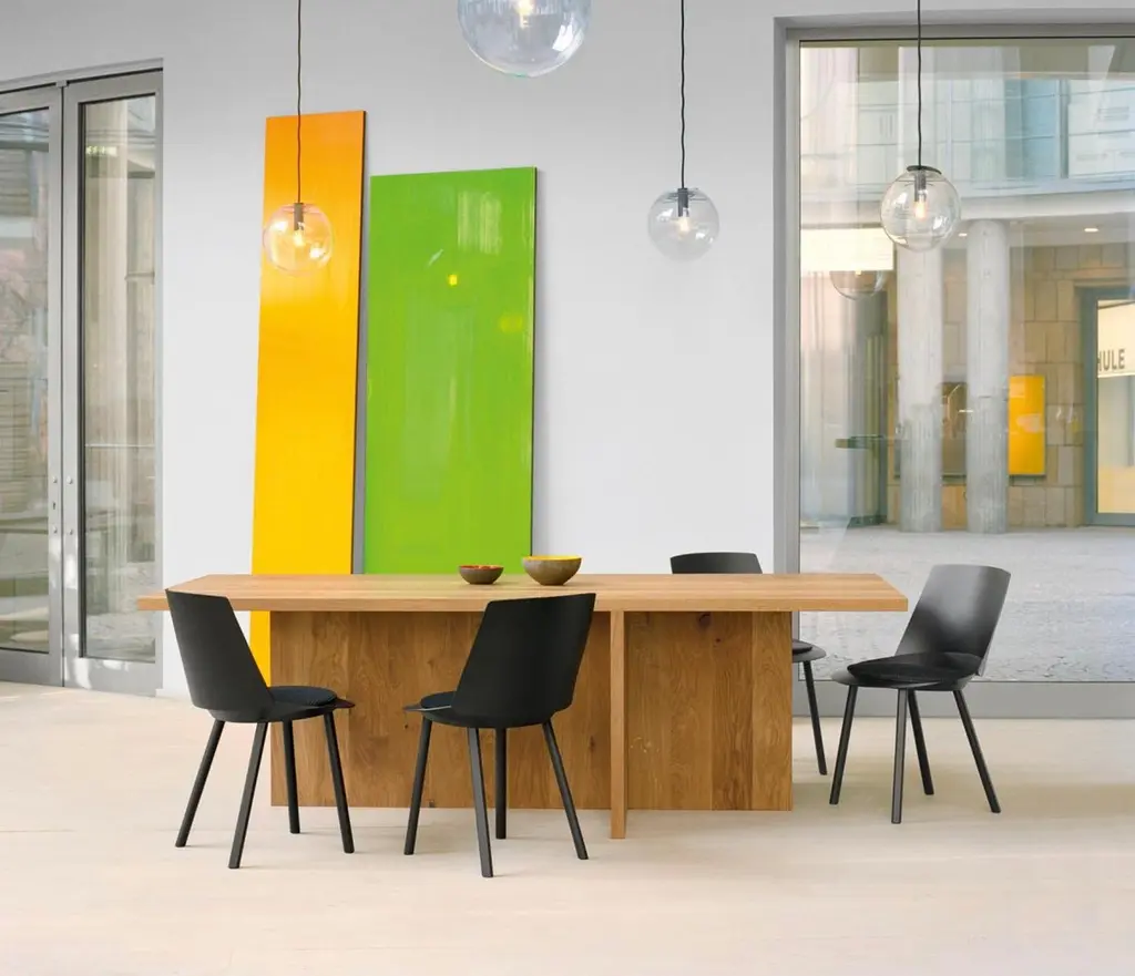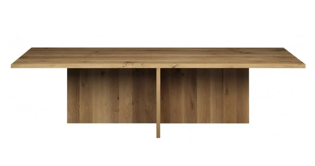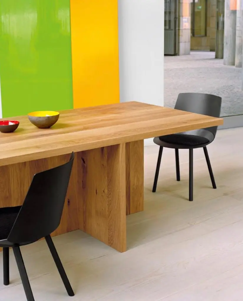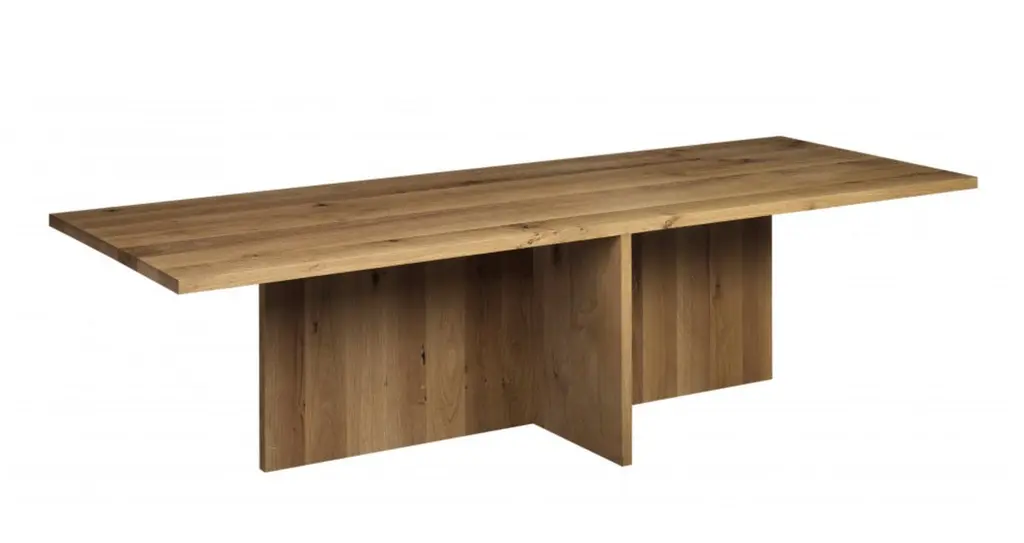Philipp Mainzer 'ZEHN' Table 300cm in Solid European Oak for e15.New, current production.With a sculptural appearance, the solid wood table ZEHN presents essential geometric forms in striking simplicity.This product is available in the following variants:European oak, oiledEuropean oak, white pigmented lacqueredEuropean oak, chocolate brown stainedEuropean oak, dark stainedDetails- Thickness of solid wood top measures 40 mm (1 5/8 inch)- To maximise seating comfort, the middle leg is either centrally (L 3000 mm / 118 1/8 inch) or asymmetrically (L 2400 mm / 94 1/2 inch) positioned- Offers seating for eight to ten people- Ideally complemented by chairs HOUDINI, THIS- Delivered as four pieces- To maintain oiled or waxed wood surfaces, suitable care products are included in the delivery.Please note: the price is for a ZEHN table in length 300cm (there is also a version in 240 cm available)About DEZAAK DELUXEAt DEZAAK DELUXE we try to find items that are out of the ordinary. With experience over 40 years, we are known for our singular eye and combining the new and the old. We have a few thousand items in stock in our beautiful showroom in a reclaimed factory building out of the 1930s.