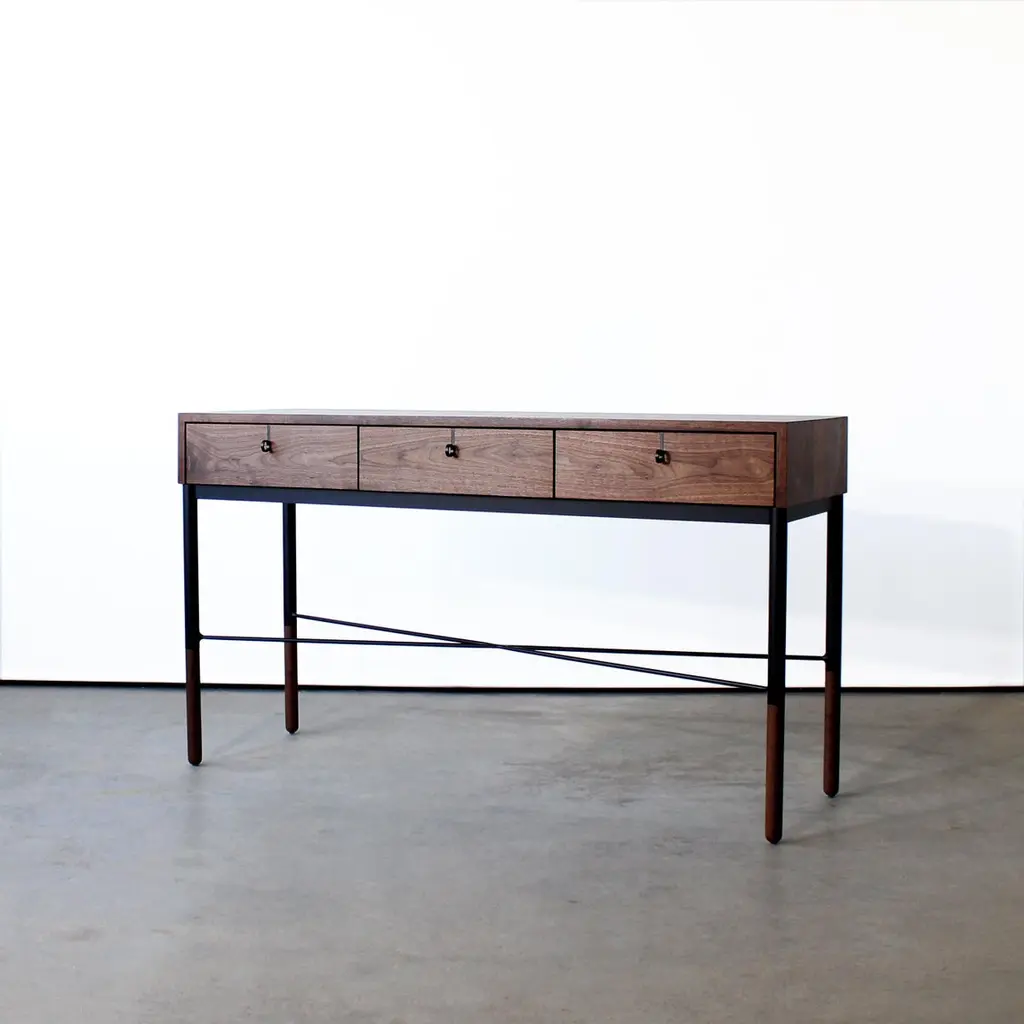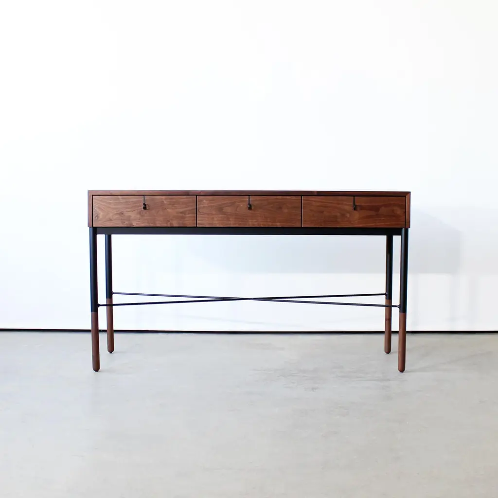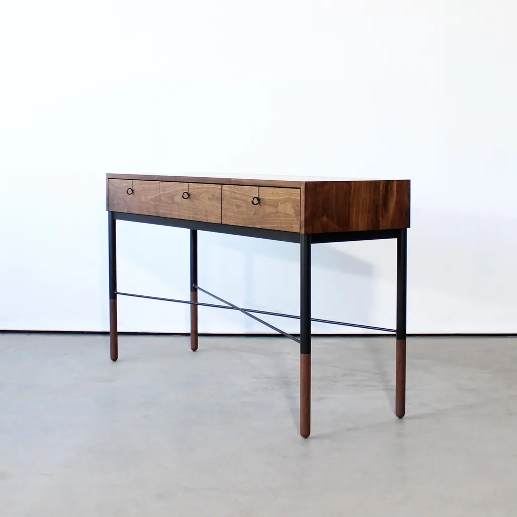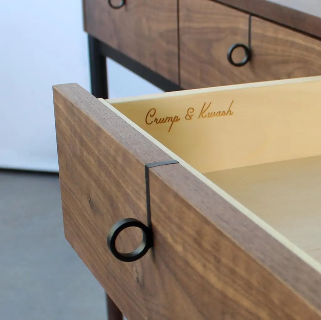 Phillip consoleby Crump and Kwash Solid wood case with continuous waterfall grain / blackened steel pulls and base / hand shaped walnut feet / natural oil finish / soft close drawers Dimensions: 30 high x 16.5 deep x 52.5 wide.Wood options - Walnut, maple, white oak, blackened oak.
