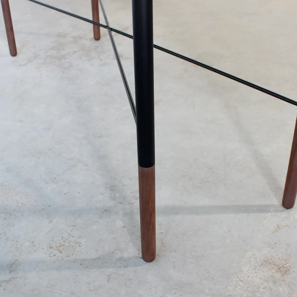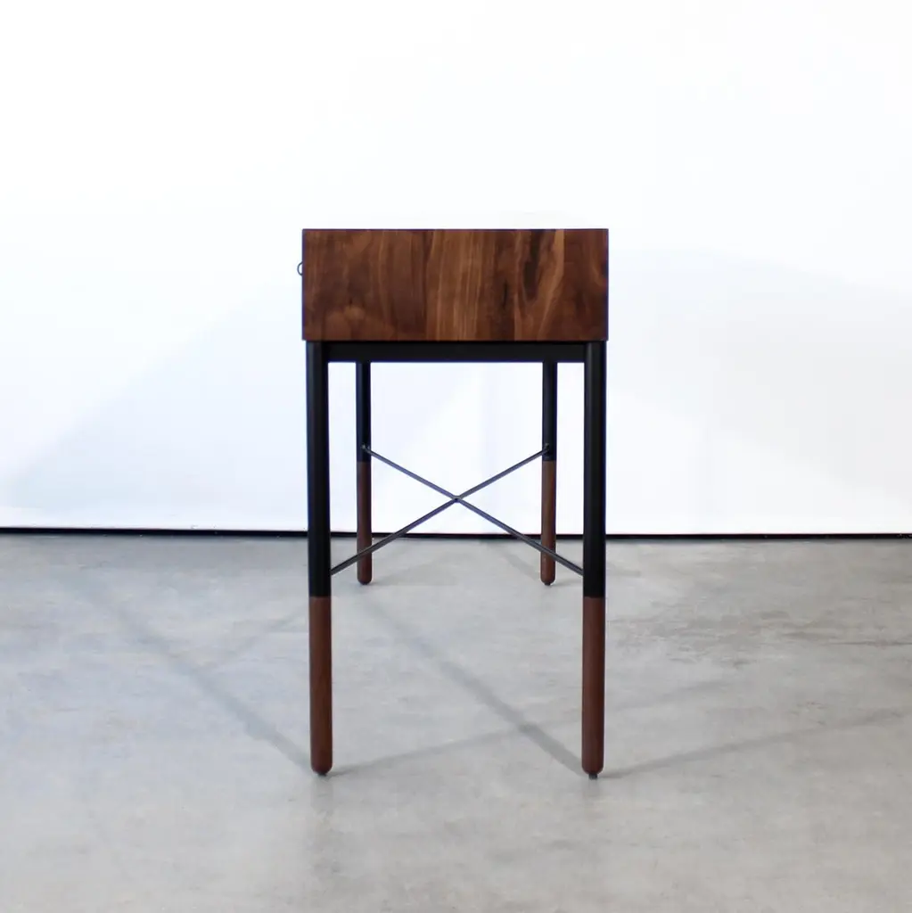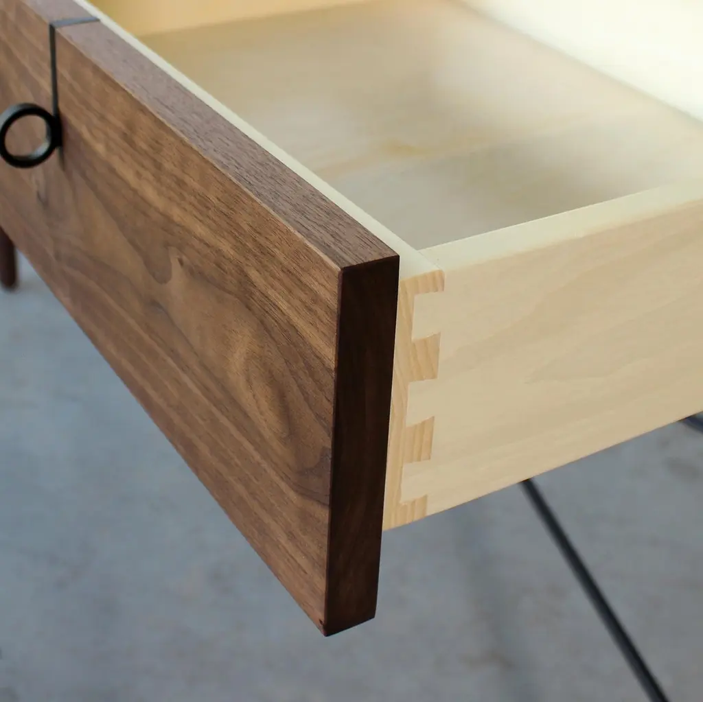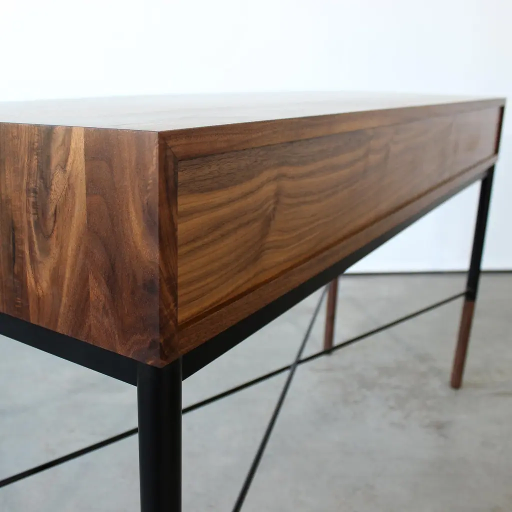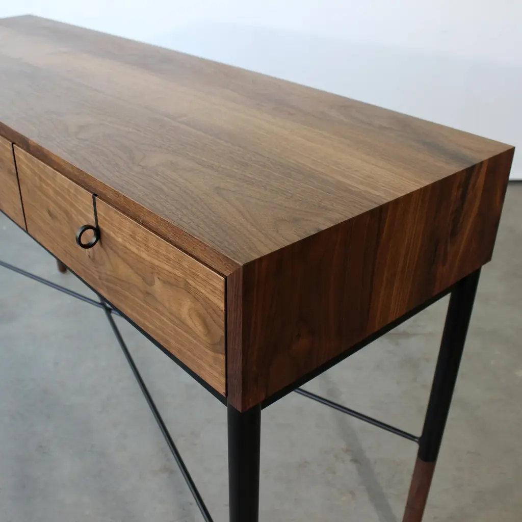 Phillip consoleby Crump and Kwash Solid wood case with continuous waterfall grain / blackened steel pulls and base / hand shaped walnut feet / natural oil finish / soft close drawers Dimensions: 30 high x 16.5 deep x 52.5 wide.Wood options - Walnut, maple, white oak, blackened oak.