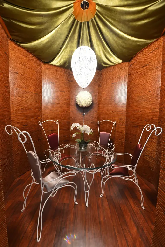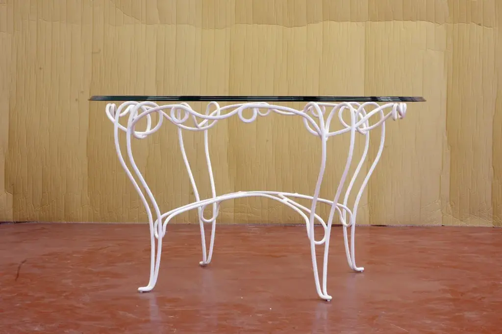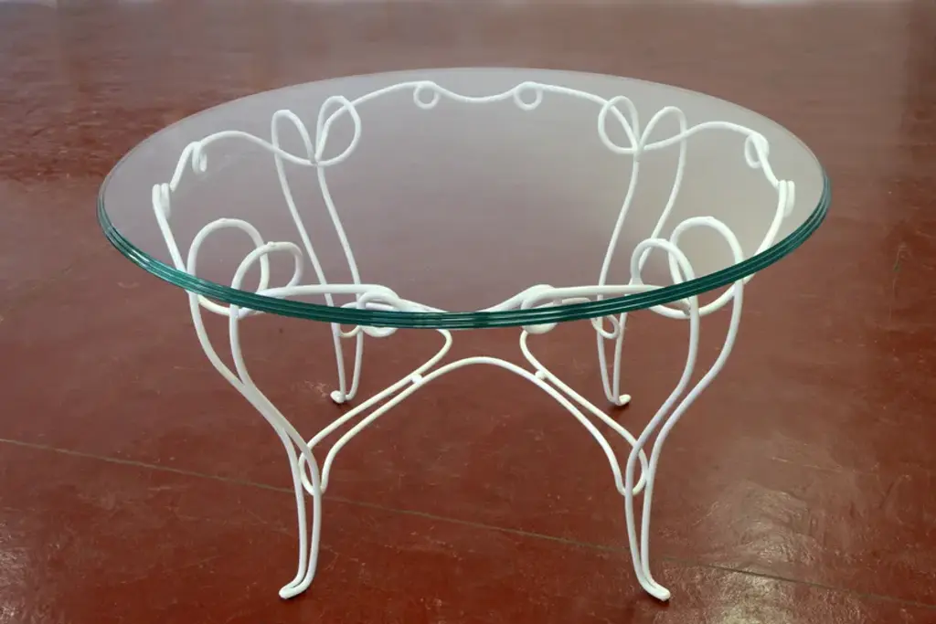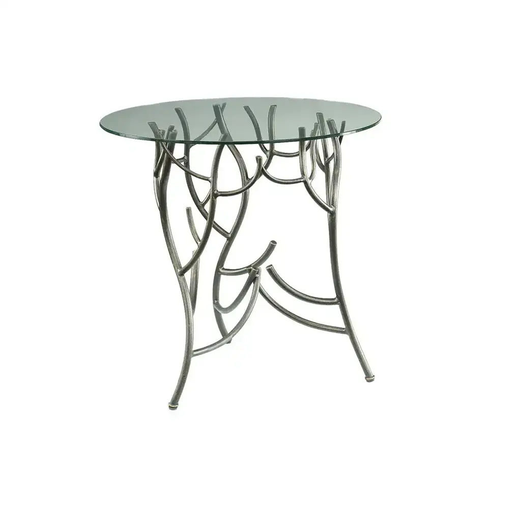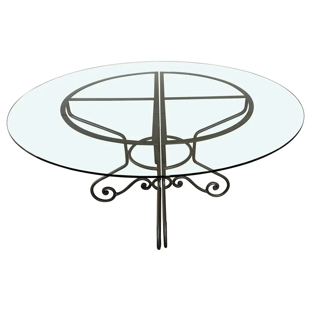 Philo is a round table in wrought and hand-forged iron, powder coated, top in extra-light glass with triple owl-beak chamfer side.
