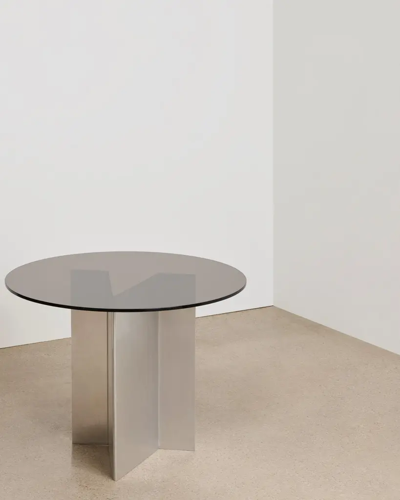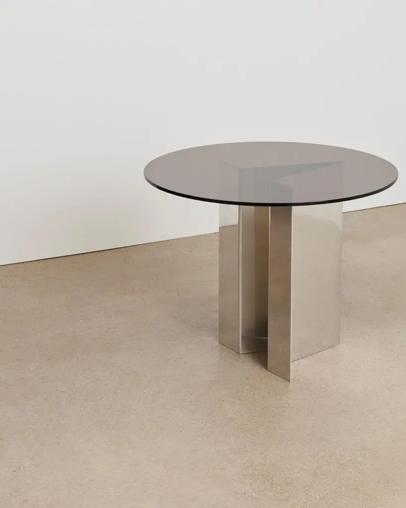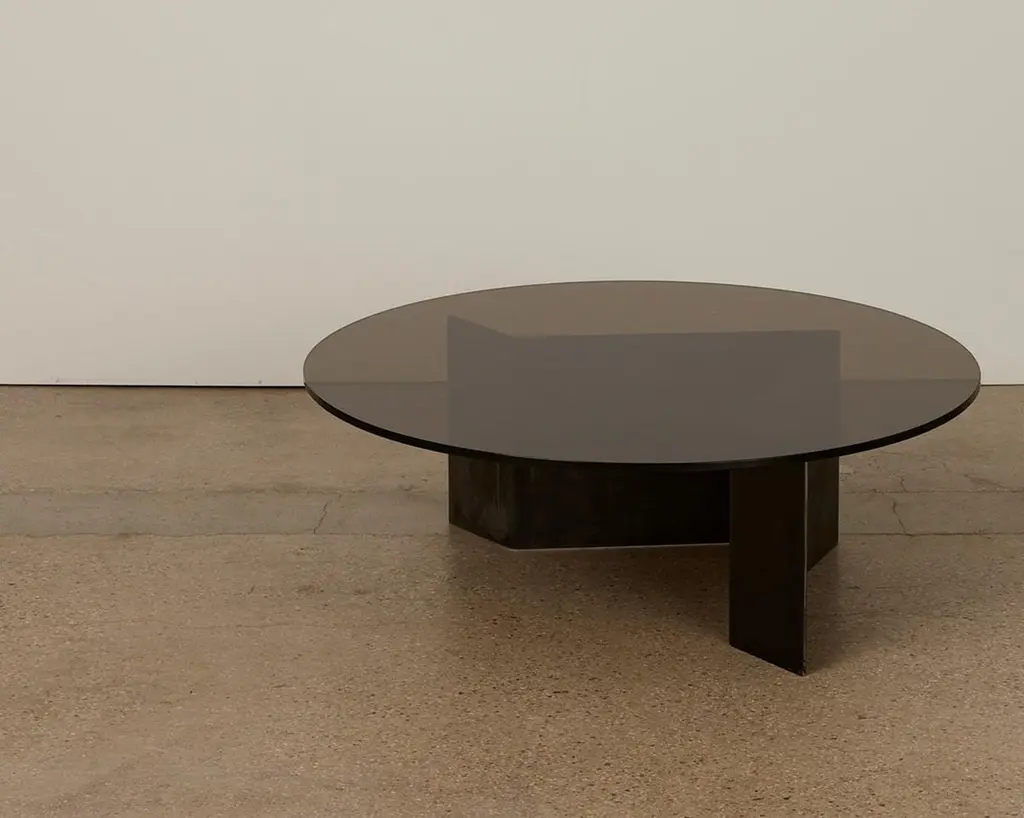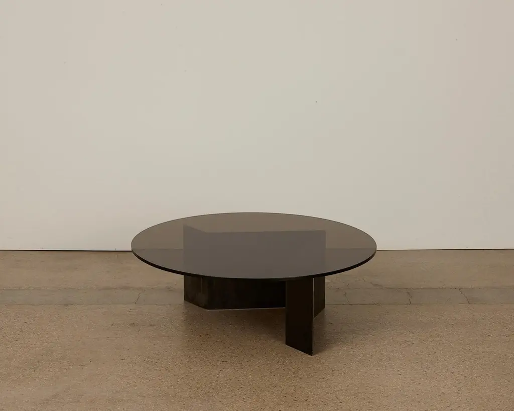 Pica Piccola Table by Umberto Bellardi RicciDimensions: D 36" x W 36" x H 14 inMaterials: Small Pica in Patinated Waxed Steel and Grey Glass Table Top (Grey Glass or Bronze Glass Optional)Dimensions could be customizable. Please contact us for more information. Umberto Bellardi Ricci is an Italian sculptor and architect based in New York City, practicing across London, Mexico, and New York. His work revolves around the interplay of art and design while exploring the spatial aspects of sculpture and social sciences through the medium of architecture. Umberto initially started with geometric abstraction largely interpreted in cast concrete, influenced by his Japanese mentor and Mexican modernism, as he founded an acclaimed sculptural project in Las Pozas, the surrealist garden in central Mexico. Since he relocated to New York, he has been focusing on a series of folded steel and brass sculptures, that often incorporate reflective light sources. While he still works with abstract compositions, pairing ready-made materials with crafted wood and rubber details, his latest furniture pieces explore the dialogue between contrasting raw construction elements, such as I-beams or concrete blocks, and refined textures like marble and glass. Having taught architecture for many years at the Architectural Association in London and at the Cornell University in New York, he designed the home for Turner Price laureate Laure Prouvost in Hackney, and has recently been commissioned to make objects and furniture for Jenna Lyons’ studio in Soho.
