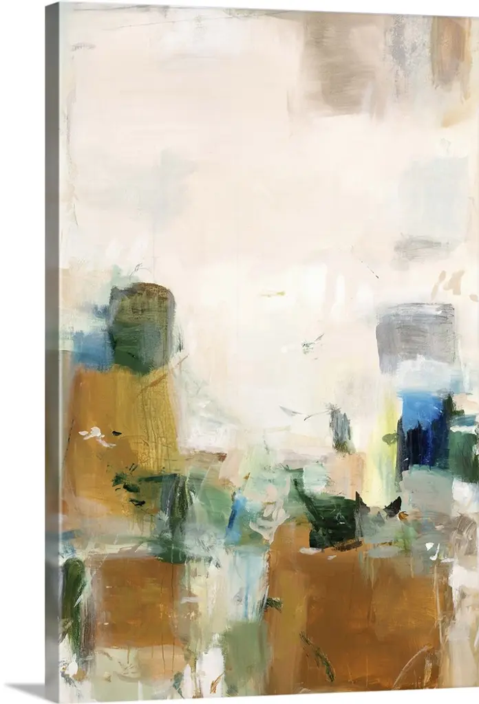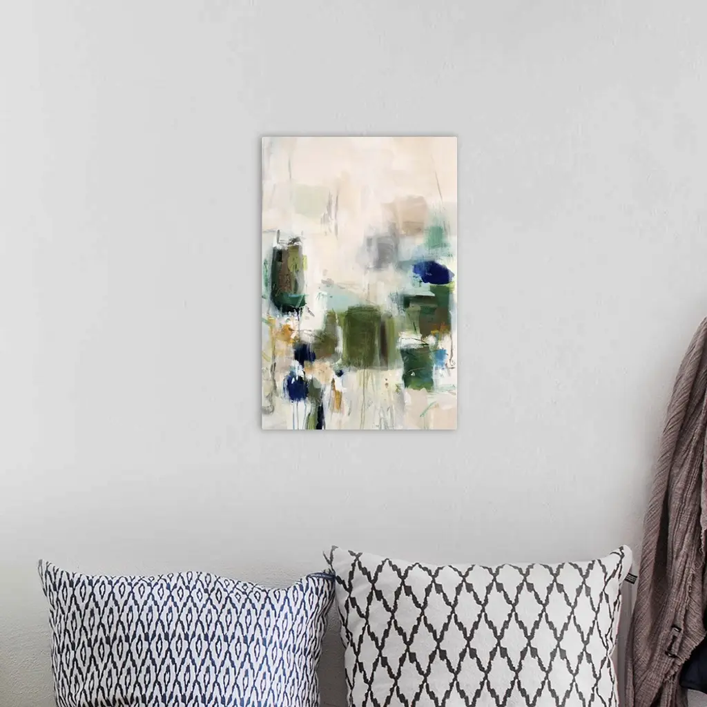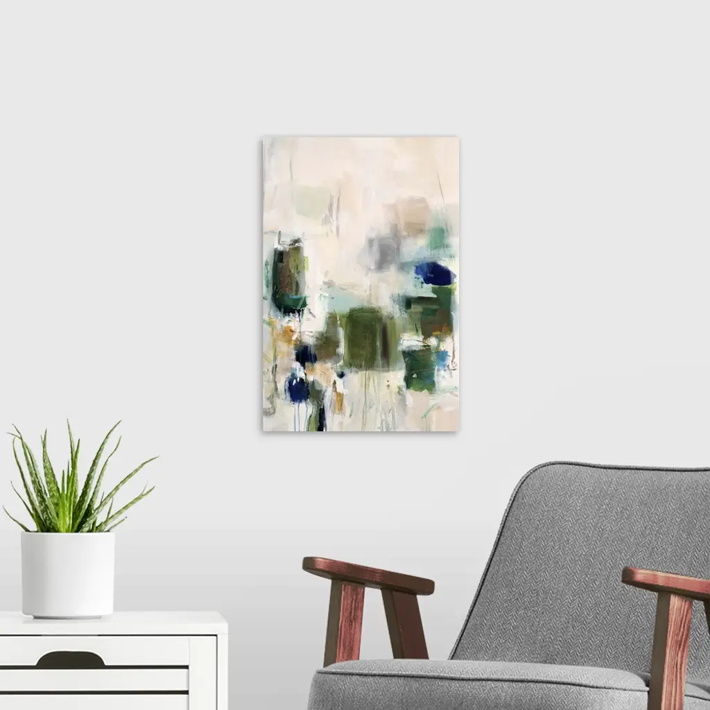 Vertical abstract artwork with vivid squares of green on white.
