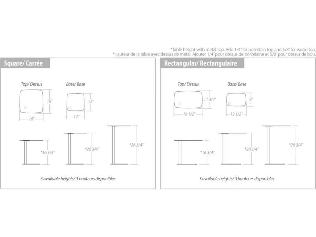 Available with metal, solid wood and porcelain top.