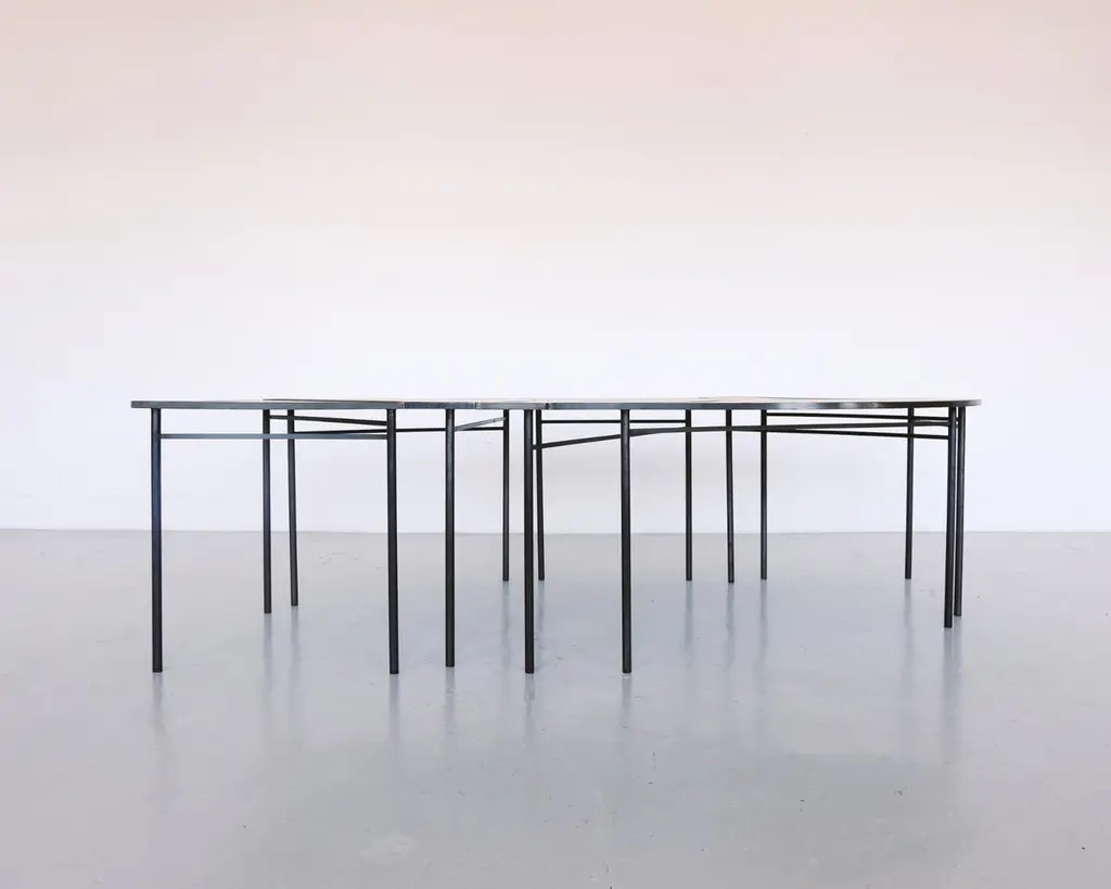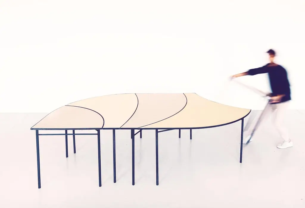 Piece C TABULA [non] RASA Table by Studio TracciaDimensions: W 140 x D 84 x H 74 cmMaterials: Steel.Different combinations are available.The table was designed for our installation called tabula[non]rasa developed for Milan Design Week 2021, with the intent of materializing the potential of circularity through the lens of food waste. It is realized in recycled steel and a special table top material made of food scraps.The material of the table top was developed by MOGU, using a bio-based resin and low-value biomass, such as corn crops, rice straw, spent coffee grounds, waste algae and shells.The design of the table was conceived within the idea of working on modularity while yet shaping something elegant, playful and able to generate unexpected interactions. The pieces can be assembled all together to form a large leaf-shaped table, or can be arranged in creative combinations, to suit different needs, to display objects in a shop, for an exhibition or in a house.The whole table tells a story of circularity: innovative materials crafted into beautiful objects describe a new possible paradigm where resources are not depleted, but reinvested into a new metabolic loops. A new materialism that invents new narratives and form the common ground of our renewed relationships with the planet. And even more than that, a table of discussion that makes visible, the invisible flows of waste, not in a condescending way but with a positive proposal where different and circular logics are actually possible.Studio Traccia is a Milan based studio, founded in 2020 by Claudia Orsetti and Luigi Olivieri. Both have worked for over 10 years around the world, between Tokyo, London, Berlin and Amsterdam, gaining different experiences in a series of international studios such as SANAA, Heatherwick Studio, Tomas Saraceno and UNstudio.Studio.traccia works at the intersection of many worlds, using always as a starting point contemporaneity which they try to digest, communicate or react to it through architecture, installations, photography, design, but also the curation and organization of talks and events.Research is a fundamental part of the studio’s creative working method: doubts, questions and explorations help formulate new points of view and new ideas that move across many scales and take on many forms. The firm believes that design today must expand itself, be contaminated by knowledge from other disciplines, and assume new perspectives, which is the reason why the studio constantly seeks for different cross-disciplinary collaborations.