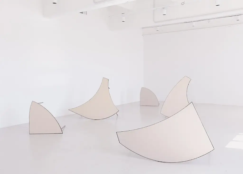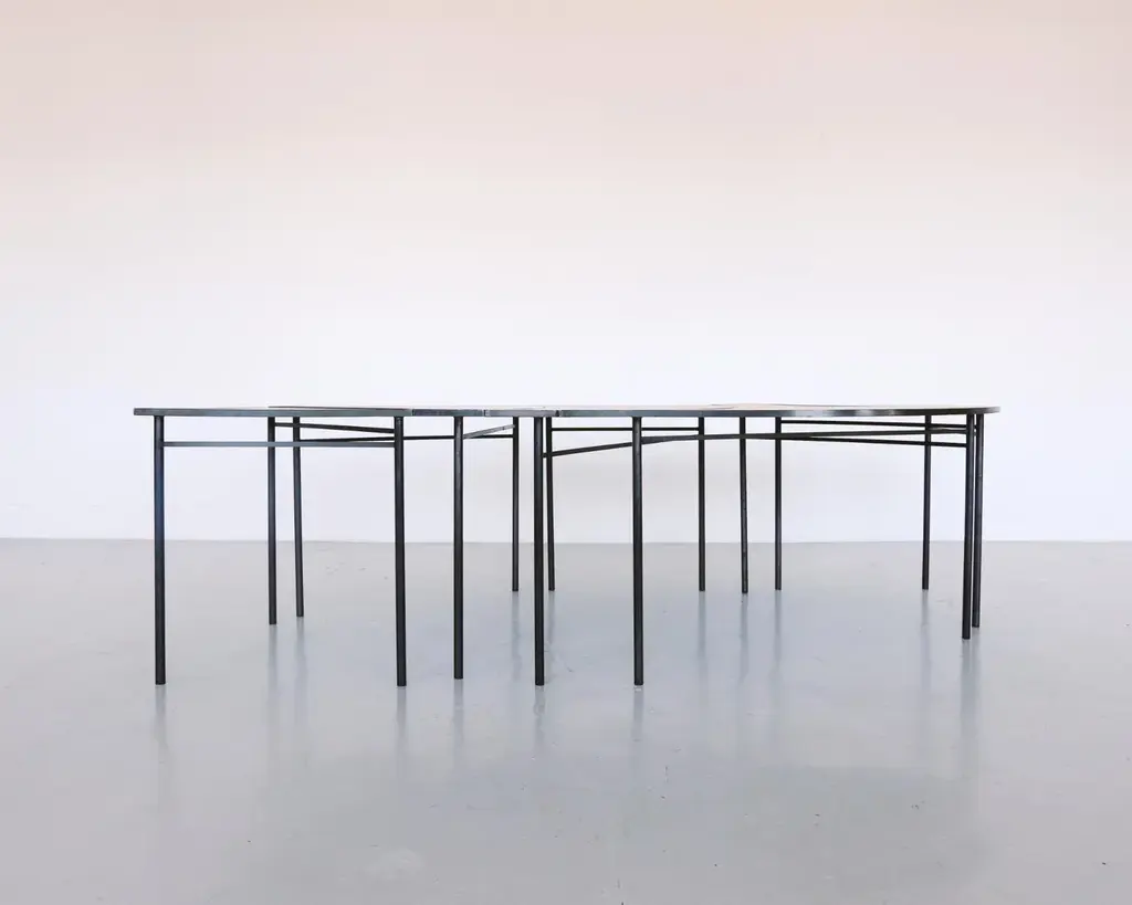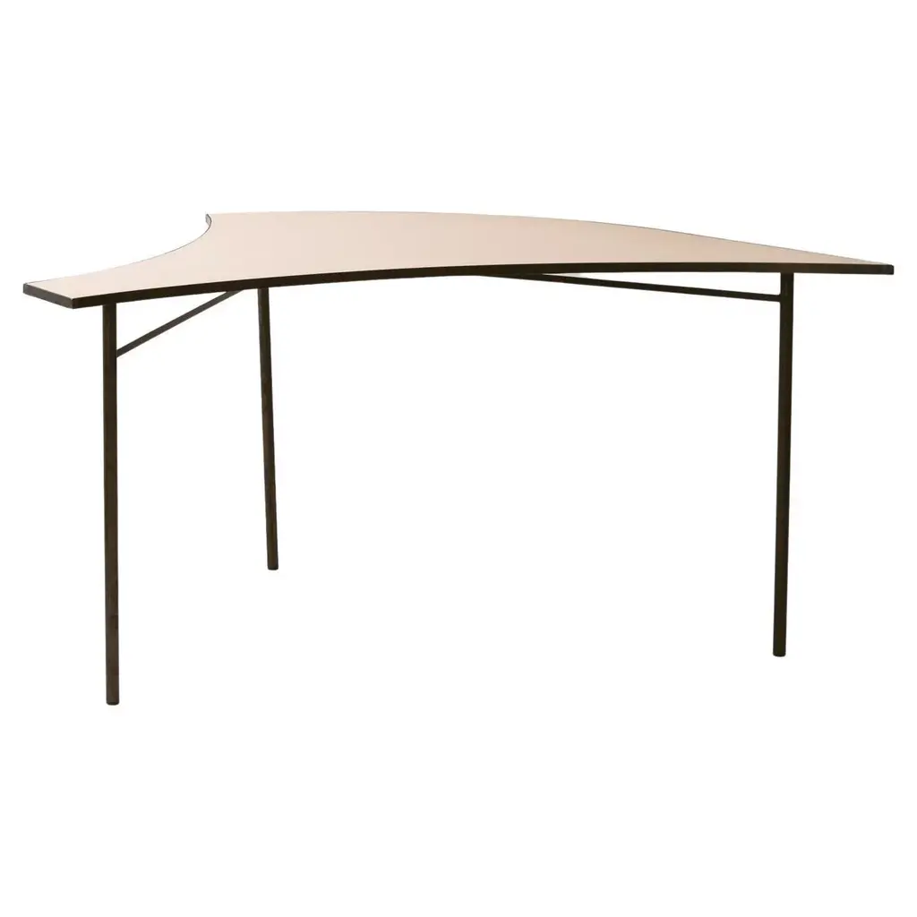 Piece d tabula [non] rasa table by studio traccia dimensions: w 140 x d 152 x h 74 cm materials: steel.the table was designed for our installation called tabula[non]rasa developed for milan design week 2021, with the intent of materializing the potential of circularity through the lens of food waste. It is realized in recycled steel and a special table top material made of food scraps. The material of the table top was developed by mogu, using a bio-based resin and low-value biomass, such as corn crops, rice straw, spent coffee grounds, waste algae and shells. The design of the table was conceived within the idea of working on modularity while yet shaping something elegant, playful and able to generate unexpected interactions. The pieces can be assembled all together to form a large leaf-shaped table, or can be arranged in creative combinations, to suit different needs, to display objects in a shop, for an exhibition or in a house. The whole table tells a story of circularity: innovative materials crafted into beautiful objects describe a new possible paradigm where resources are not depleted, but reinvested into a new metabolic loops. A new materialism that invents new narratives and form the common ground of our renewed relationships with the planet. And even more than that, a table of discussion that makes visible, the invisible flows of waste, not in a condescending way but with a positive proposal where different and circular logics are actually possible.