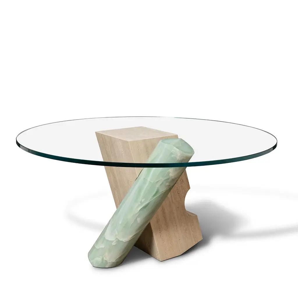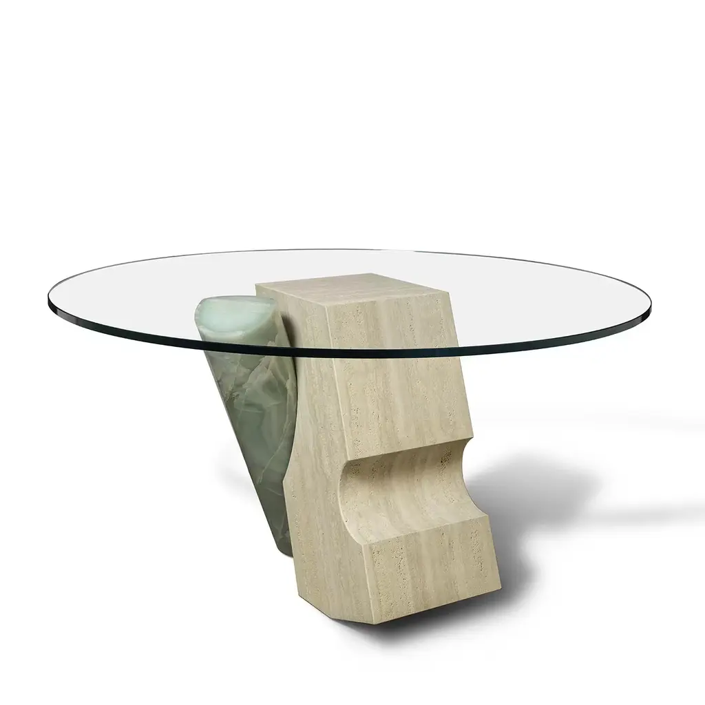 A stupefying sculptural silhouette of striking artistic value defines this refined circular table Patricia Urquiola designed for the Pierce Collection. As eloquently suggested by its name, the design stands out for the polished Aquarel green onyx cylinder piercing the extra-clear tempered glass top while creating a dynamic composition with the Classic Travertine marble foot - available both open-pore or polished - at the base.