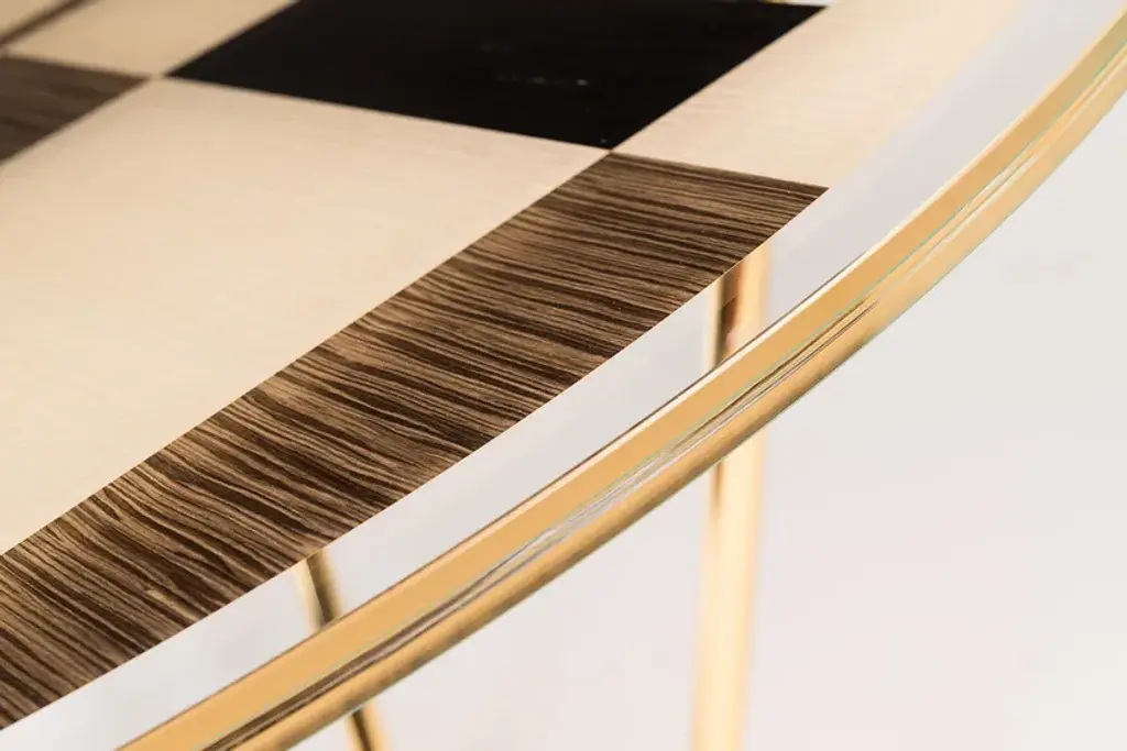 Piet is a round-shaped table, featured by a modern elegant design, inspired by the pictures of the famous Dutch painter Piet Mondrian and his usual geometries. Available with top in double-layer glass containing inlays of three types of wood (very light oak and ebony Newood) or in extra-clear glass without any inlay. Base, minimalist as well as elegant at the same time, with legs and crosspieces in glossy 24k golden finish. 100% Made in Italy