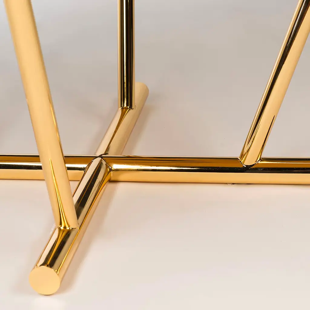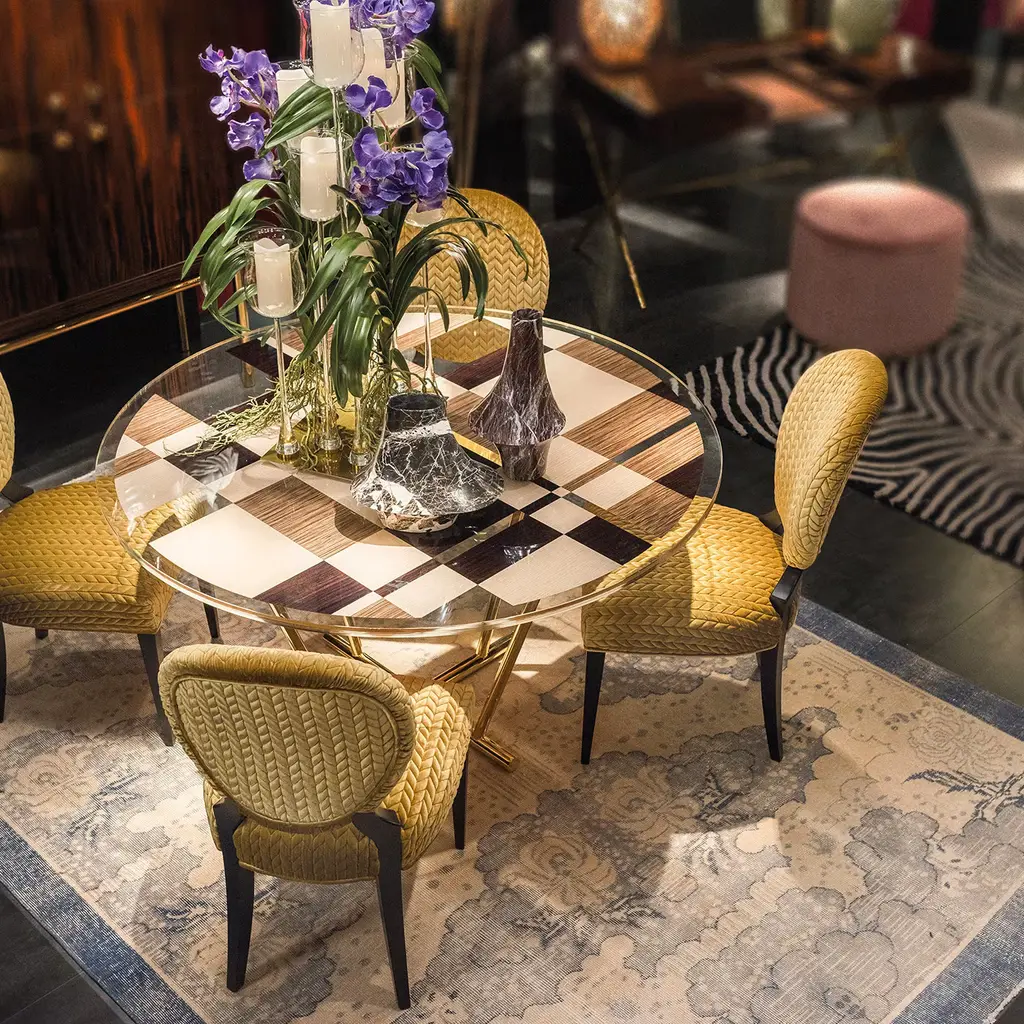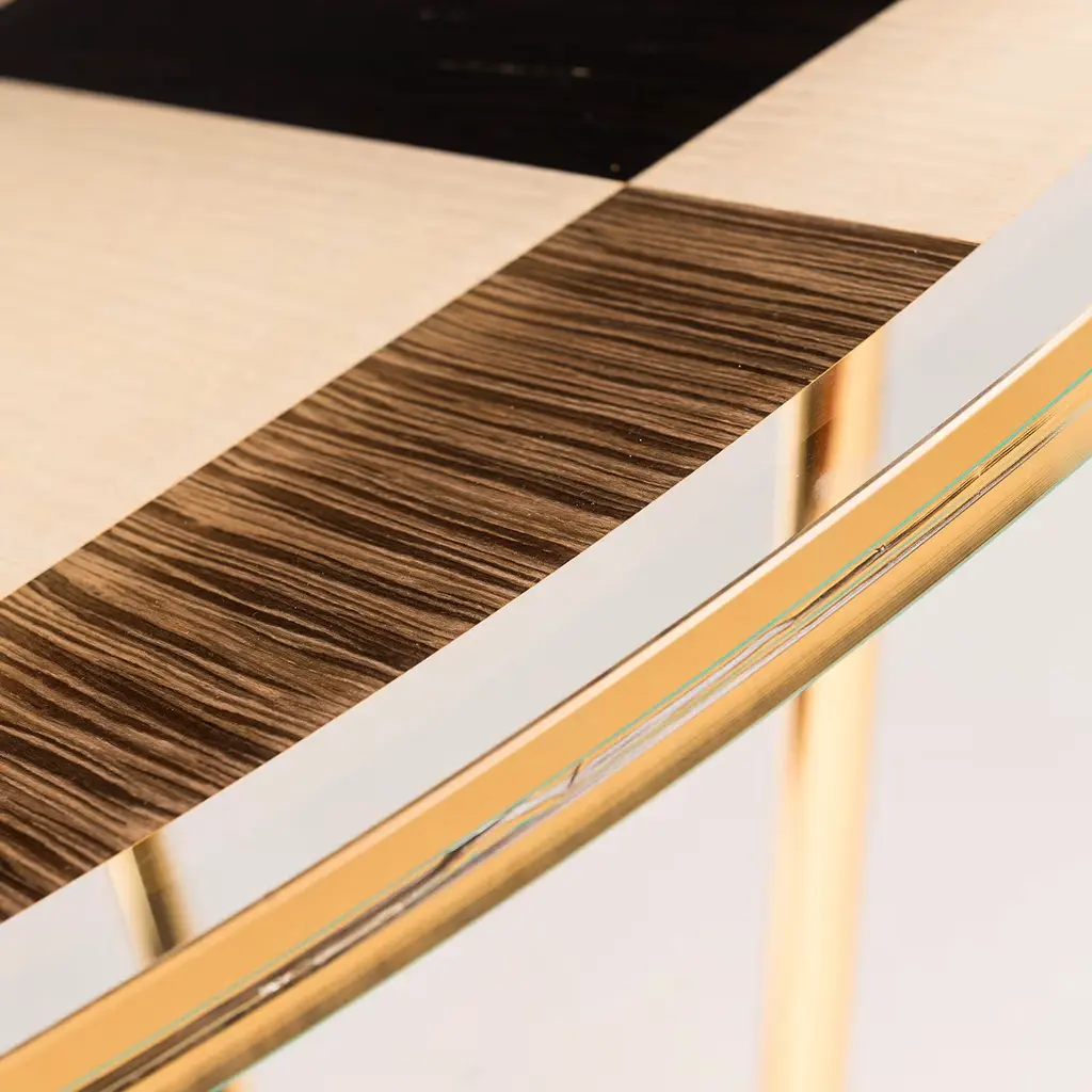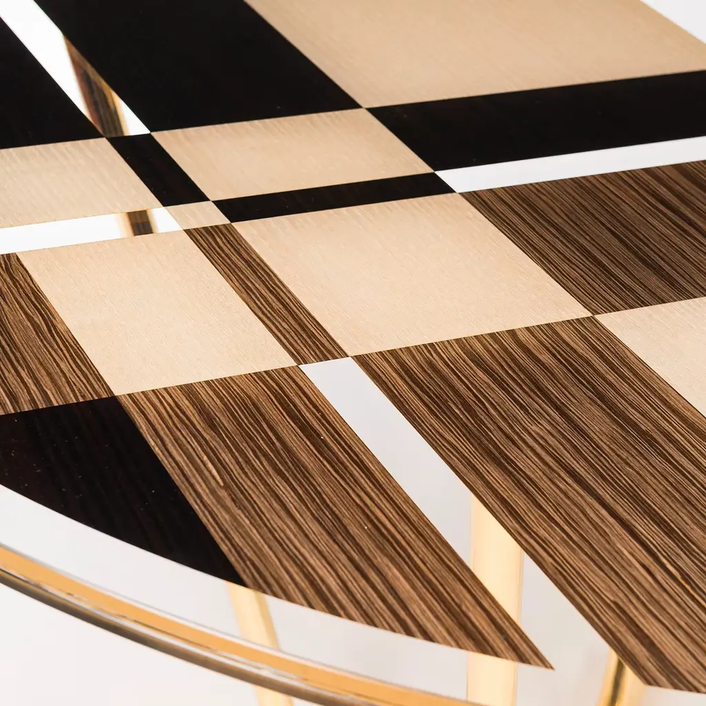 Inspired by the iconic paintings by Piet Mondrian, this table is a refined addition to a modern interior. Its elegant silhouette is crafted of metal with a resplendent 24k gold coating and features a crossing base from which four legs stem in diagonals to support the round top in extra-clear glass. A geometrical inlay of durmast and ebony-finished hardboard decorates the top creating a unique effect of rare elegance. It is possible to request this piece with only the glass panel on top, please contact the Concierge for this option.