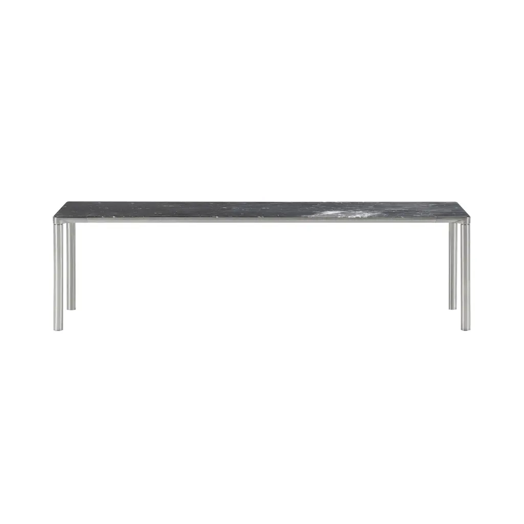 With its slender profile and robust construction, the Piloti Alu Table – Extra Large offers a refined surface that appears to float above its frame. Designed by Hugo Passos—a Portuguese-born, Copenhagen-based designer known for emphasizing the human scale in everyday objects—the table rests on a durable aluminum base in black powder-coated or brushed finishes. The tabletop is available in black laminate, white Carrara marble, or black Marquina stone, each paired with a distinctive black core. Offered in two heights, the design includes adjustable plastic gliders for stability on uneven surfaces.