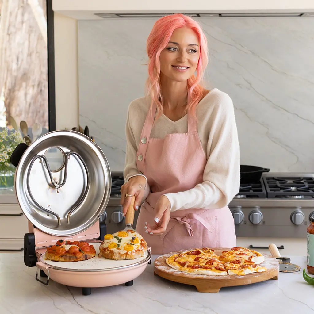 The pink Pizza Girl electric tabletop grill cooks pizzas to perfection on your indoor (or outdoor!) countertop. Like a high-temperature brick oven without all the smoke, this compact, easily portable appliance cooks up to a 12-inch pizza in less than 10 minutes. Adjustable heating elements on the top and bottom make it easy to fine tune your crusts and toppings to personal perfection, and this in-demand gift comes complete with serving paddles, a ceramic pizza stone, and a metal scraper. It's the innovative creation of celebrated actress, mother, and passionate Pizza Girl founder Caroline D'Amore, who proudly represents a family legacy of Southern California pizza restaurateurs.