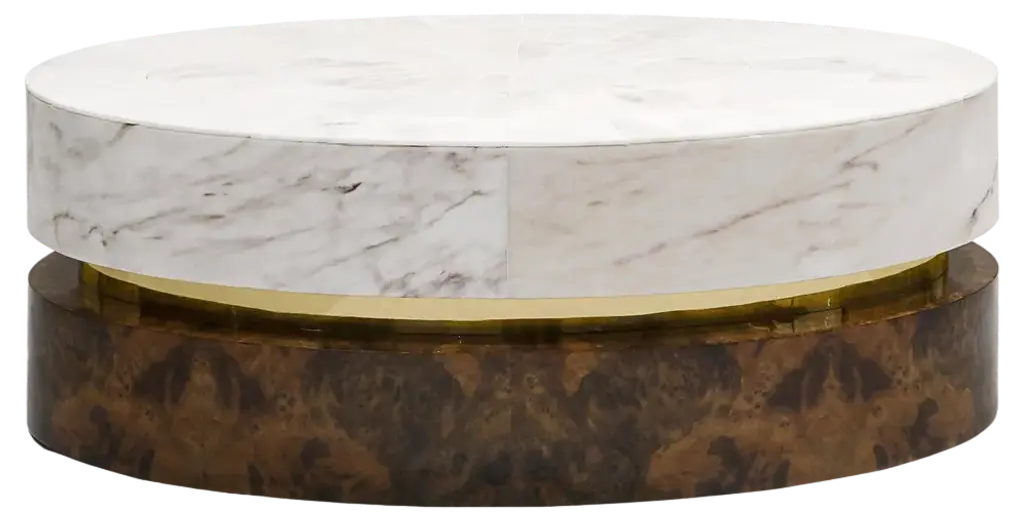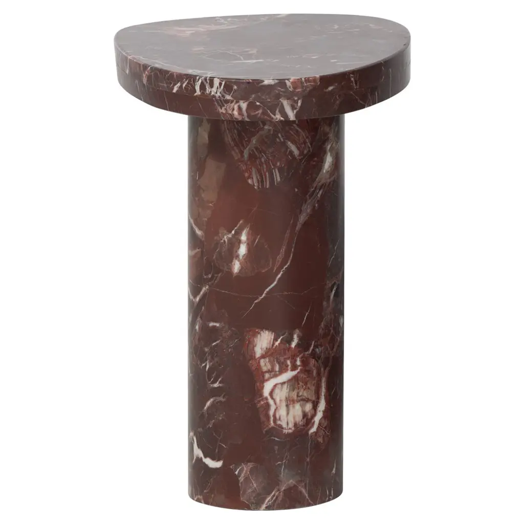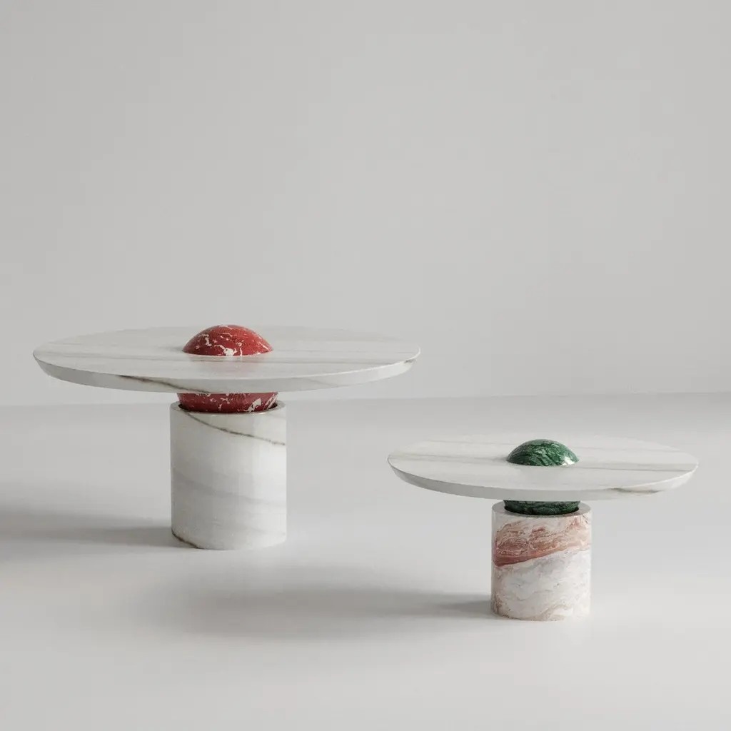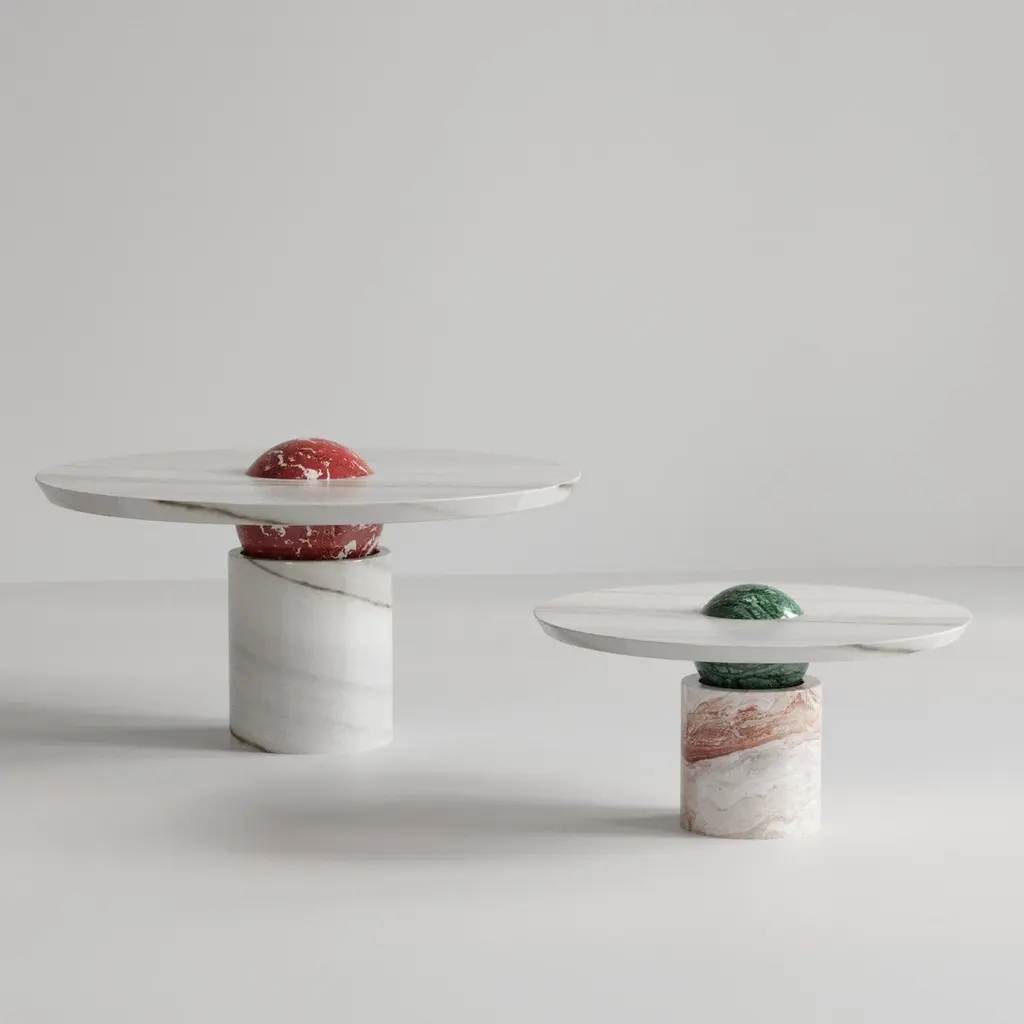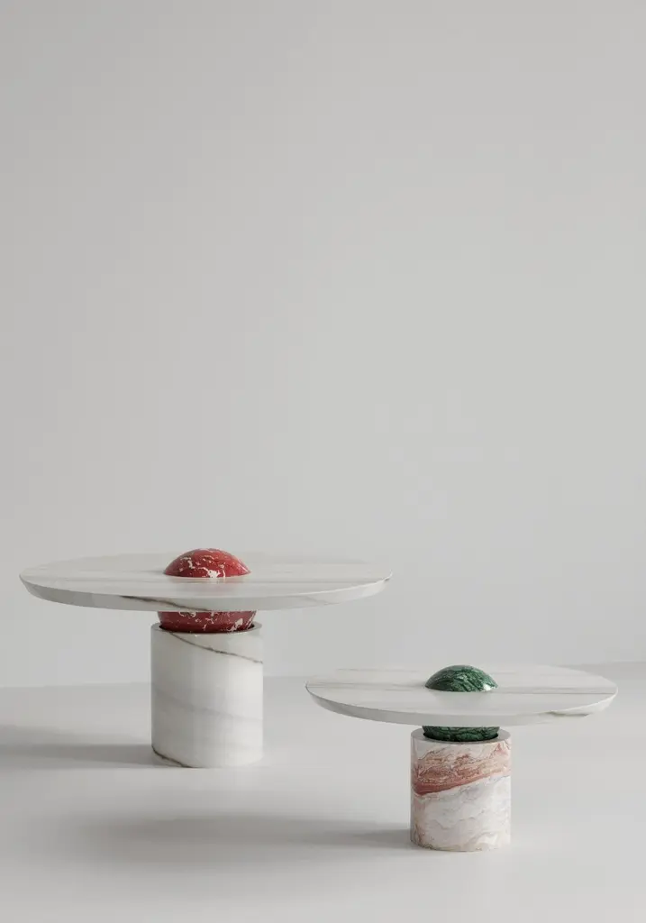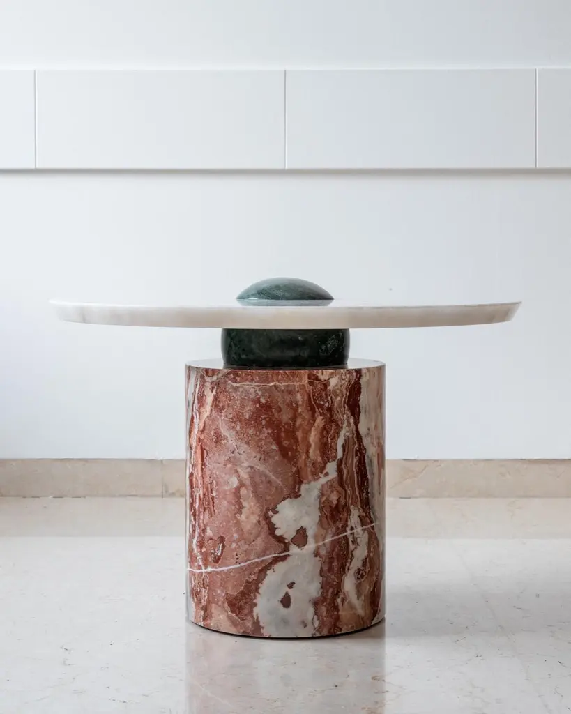 Planet Table by Madina TsarikaevaDimensions: D 43 x H 63 cm. Materials: Rosso francia, arabescato rosso orobico, bianco lasa vena oro, verde guatemala.Madina Tsarikaeva (1994) From early childhood, Madina began to show interest in art, spending a lot of time in the workshop of her grandfather, the famous artist and sculptor Mairbek Tsarikaev – the member of the USSR Union of Artists. Later, after graduating from art school, Madina was professionally engaged in photography. From 2016-2019 she devoted herself to work in the art environment. Work in the best Moscow galleries with leading designers from France, Portugal, the USA, Japan and Russia played a crucial role for her in shaping a new vision for collectible design objects. Since 2021, she has become an important part of the manner&matter team, creating the first online platform for Russian collectible design, fine art, crafts and local productions. Gallery experience and sustained exposure to a creative environment prompted Madina to create her first collection of furniture. In 2022, she signed a contract with the Heritage Gallery for the production of a series of tables made of marble and travertine. She also designed a lamp for the main office of the Dior fashion house, which can be seen in the Dior store in GUM. Currently, Madina continues to actively work on design objects, mastering various directions. “Over the past 6 years, while studying design in all its manifestations, I’ve focused my attention on object design. In a world where everything is fleeting, it is important to surround yourself with beauty. My first steps as a furniture designer started several years ago and that time it was more like a hobby. Soon I’ve become completely consumed with this job and eventually it has grown into a big fascinating business, The birth of an object is absolutely amazing: first you design it on paper, then you put it into a material and finally form it. This process contains miracle, it is creativity. In my objects I mainly use natural materials. The place I come from is surrounded by mountains that’s probably why I favor working with stone. Stone for me is an association with something majestic, with strength and steadfastness. A piece of stone in any interior is an accent thing, for sure.”
