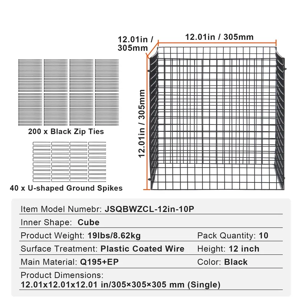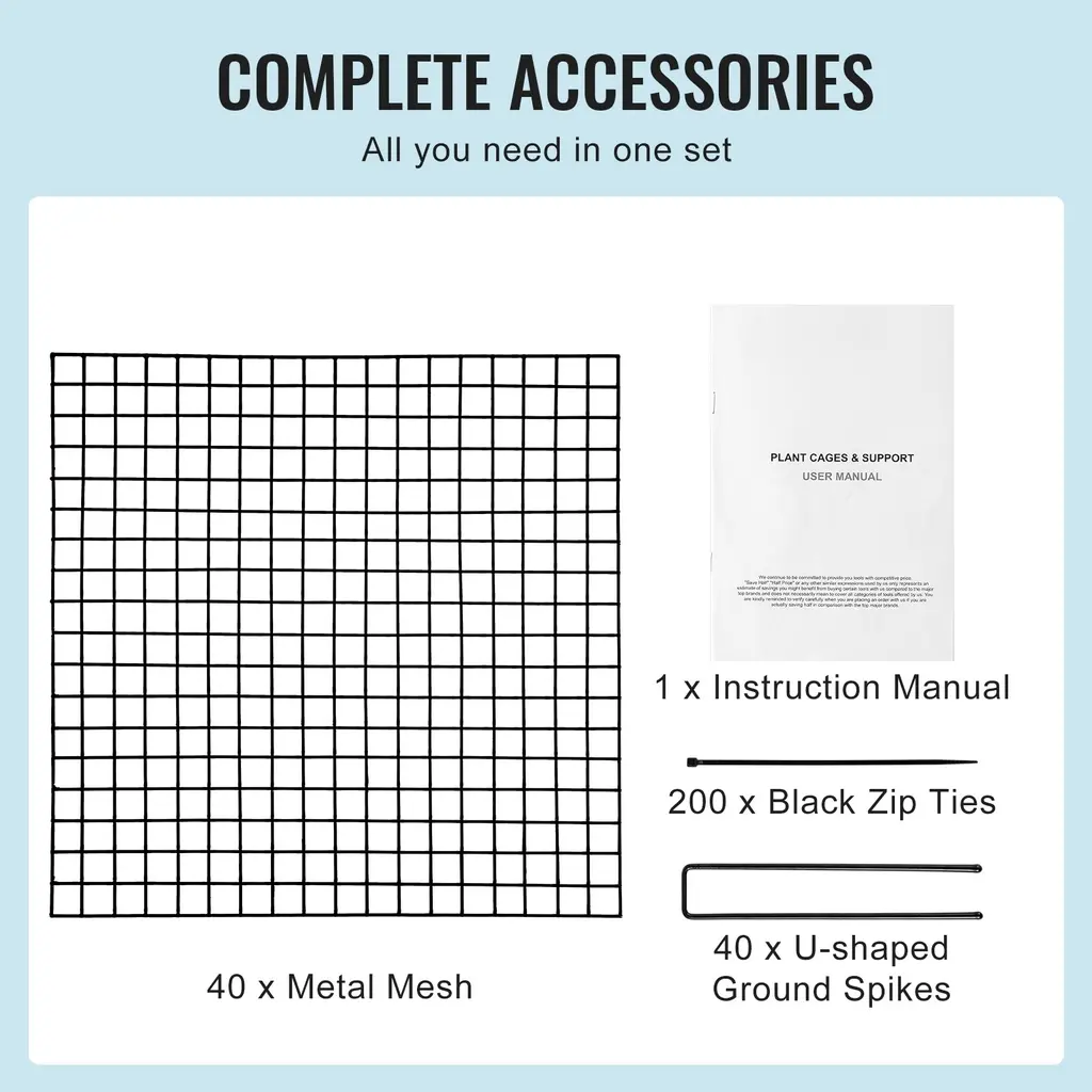 Adjustable Height: This collapsible plant protector from animals can be stacked for custom height assembly, adapting to different stages of plant growth. Its open structure provides ample branching space, making pruning, maintenance, and harvesting effortless. Sturdy & Durable Material: Made from high-quality metal with a coated surface for excellent rust and heat resistance, this plant cage is reusable and eliminates annual replacements. Its durable structure provides robust support for climbing plants, flowers, and vegetables, aiding in their growth. Easy Installation & Storage: Simple and convenient to install - connect the support rods with included accessories. When not in use, the wire plant protector disassembles easily for compact storage, saving space in your warehouse. Product Specifications: Our plant cages for outdoor plants include 18/20/16/40 pcs of metal mesh, 50/200 black zip ties, 20/40 U-shaped ground spikes, and 1 instruction manual. Each component is finely forged for long-term use. Wide Application: Ideal for outdoor courtyards, balconies, gardens, rooftops, and vegetable greenhouses. This chicken wire plant protector supports climbing plants, flowers, and vegetables to grow vertically, making it the perfect gift for gardeners. Package Content 18/20/16/40 x Metal Mesh 50/400 x Black Zip Ties 20/40 x U-shaped Ground Spikes 1 x Instruction Manual
