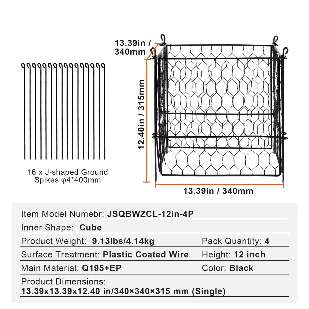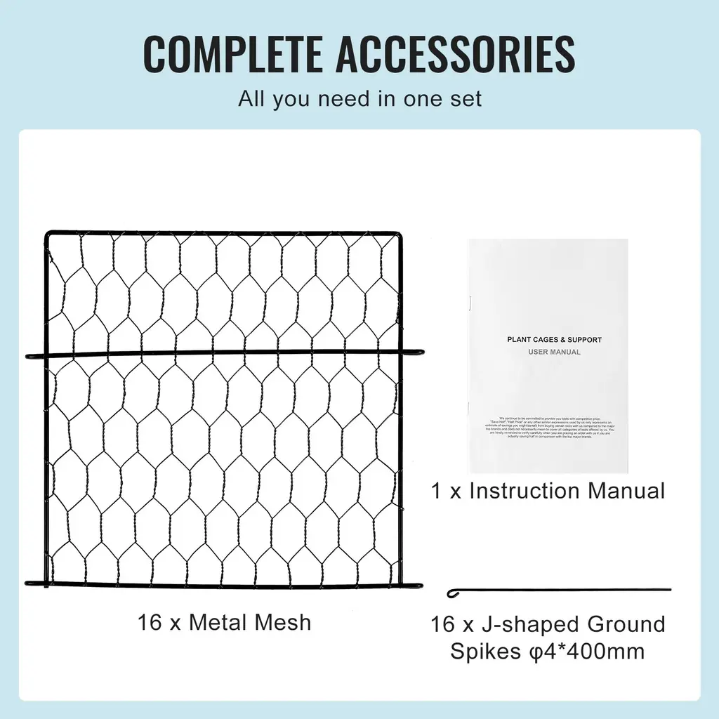 Adjustable Height: This collapsible plant protector from animals can be stacked for custom height assembly, adapting to different stages of plant growth. Its open structure provides ample branching space, making pruning, maintenance, and harvesting effortless. Sturdy & Durable Material: Made from high-quality metal with a coated surface for excellent rust and heat resistance, this plant cage is reusable and eliminates annual replacements. Its durable structure provides robust support for climbing plants, flowers, and vegetables, aiding in their growth. Easy Installation & Storage: Simple and convenient to install - connect the support rods with included accessories. When not in use, the wire plant protector disassembles easily for compact storage, saving space in your warehouse. Product Specifications: Our plant cages for outdoor plants include 18/20/16/40 pcs of metal mesh, 50/200 black zip ties, 20/40 U-shaped ground spikes, and 1 instruction manual. Each component is finely forged for long-term use. Wide Application: Ideal for outdoor courtyards, balconies, gardens, rooftops, and vegetable greenhouses. This chicken wire plant protector supports climbing plants, flowers, and vegetables to grow vertically, making it the perfect gift for gardeners. Package Content 18/20/16/40 x Metal Mesh 50/400 x Black Zip Ties 20/40 x U-shaped Ground Spikes 1 x Instruction Manual