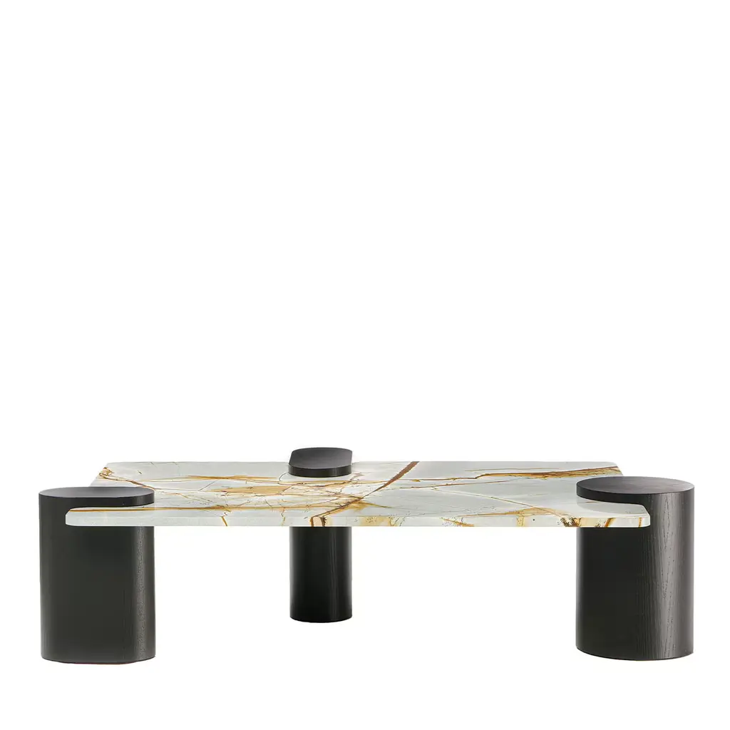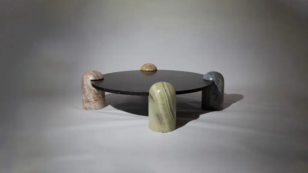 Rounded pillars of blue calcite, pink marble, caramel onyx, and green onyx carry a black marble top to create a Play-time Table; An elegant rendition of childrens furniture. A piece meticulously hand-sculpted from stones endemic to Mexico. The combination of materials, which reign over the piece's final appearance, also alludes to a deep Mexican folklore. The piece draws from different aesthetic references, representative of a syncretic essence in Mexican tradition. Panorammma is a furniture design atelier based in Mexico City that seeks to redefine our relationship with functional objects through experimentation with materials and form.