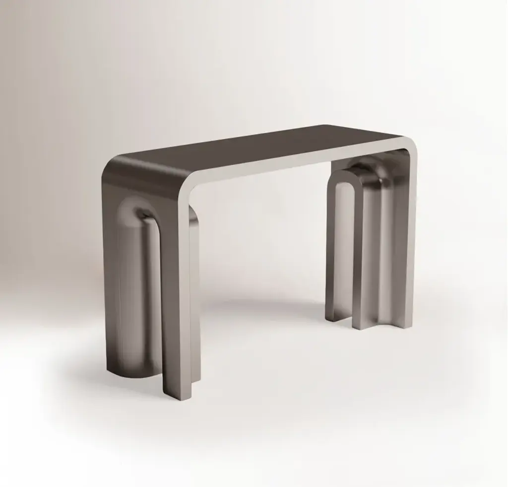 PLIE' is a consolle crafted entirely in brushed stainless steel.The pliè explores the tension between material and shape. The cold, industrial essence of metal is softened by fluid curves and round silhouettes, evoking the sensuality of the human form. Each piece feels like a body in motion feminine, powerful, and unafraid.